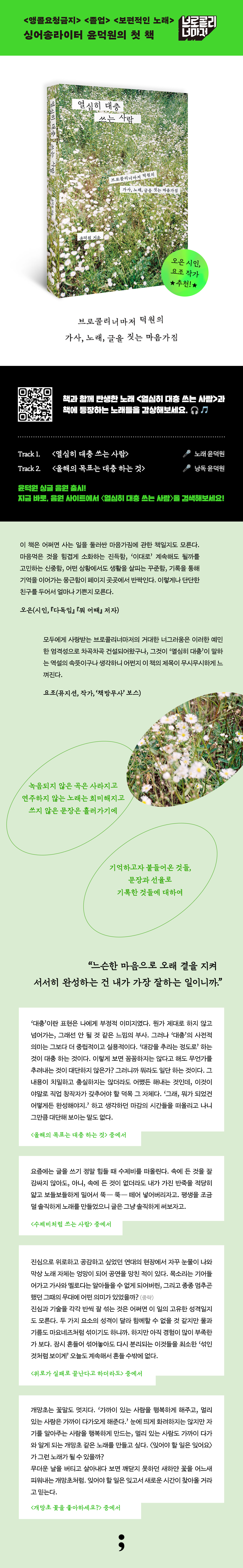 모두에게 사랑받는 브로콜리너마저의 거대한 너그러움은 이러한 예민한 엄격성으로 차곡차곡 건설되어왔구나, 그것이 ‘열심히 대충’이 말하는 역설의 속뜻이구나 생각하니 어쩐지 이 책의 제목이 무시무시하게 느껴진다. 그 어떤 조미료도 ‘미원’이라는 이름을 넘어서지 못하듯, 보편성의 경지에 다다른 존재는 하나의 세계를 대표하는 고유함을 얻는다. 이미 한국음악 속 한 세계의 고유한 존재가 된 윤덕원은 지금 이 순간도 어딘가를 향해 열심히, 대충, 나아가고 있을 것이다. 역시 무시무시하다. - 요조 (가수, 뮤지션, 작가, ‘책방무사’ 보스) |