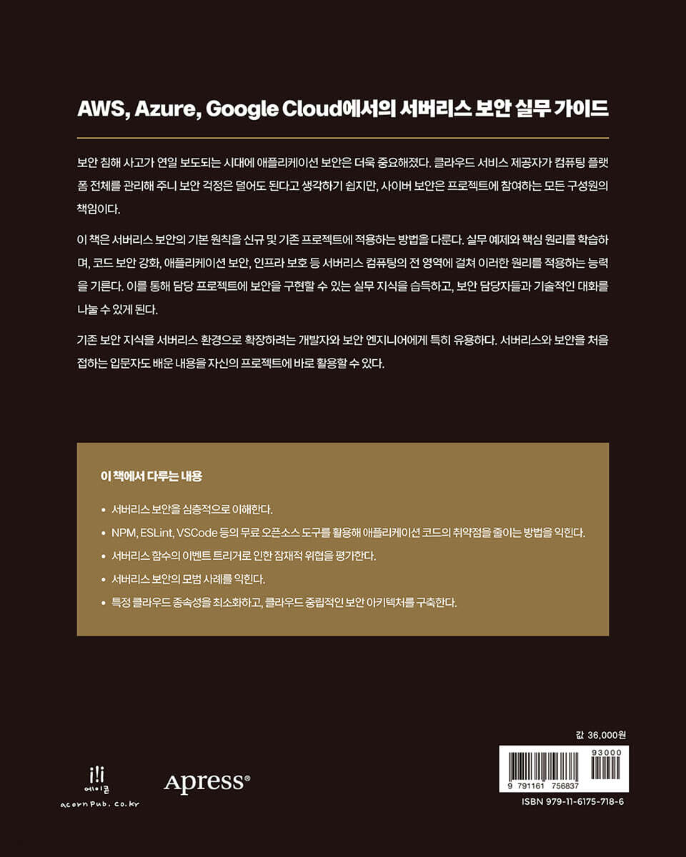서버리스 아키텍처는 비즈니스의 민첩성을 높여주지만, 동시에 기존과는 다른 보안 과제를 안겨줍니다. 함수 단위의 세밀한 권한 관리, 이벤트 기반 아키텍처의 취약점, 서드파티 의존성 등 새로운 위협에 체계적으로 대응해야 할 때입니다. 이 책은 개념 설명에 그치지 않고 실제 코드를 통해 위협을 진단하고 리스크를 줄이는 방법을 제시합니다. 위험 평가부터 계정 및 권한 관리, 시크릿 관리, 민감 데이터 보호, 모니터링까지 서버리스 보안의 전 영역을 13개 장에 걸쳐 단계별로 안내하는 실용적인 가이드입니다. AWS, Azure, Google Cloud Platform 등 주요 클라우드 플랫폼에서 Serverless Framework와 Node.js를 활용해 코드를 개선하고 인프라를 보호하는 구체적인 실습 방법을 담았습니다. 이 책에서 다루는 내용 ㆍ 체계적인 위험 평가: 위협 모델링부터 공격 표면 분석, 신뢰 경계 설정까지 서버리스 애플리케이션의 잠재적 위험을 평가하는 방법을 배웁니다. ㆍ 안전한 개발 프로세스 구축: 소스 코드 보안 강화, 오픈소스 종속성 관리, Serverless Framework 보안 설정 등 개발 초기부터 보안을 적용하는 방법을 익힙니다. IAM과 데이터 보안: 최소 권한 원칙에 따른 권한 관리, 시크릿과 환경 변수의 안전한 관리, 데이터 암호화 전략을 실습합니다. ㆍ 운영 모니터링 체계: 이상 징후를 탐지하고 대응하기 위한 로깅, 감사, 경고 설정 방법을 구현합니다. ㆍ 실무 도구 활용법: Node.js, NPM, ESLint, VSCode 등 현업에서 널리 쓰이는 무료 오픈소스 도구로 보안을 강화하는 실전 기법을 다룹니다. 대상 독자 ㆍ 서버리스 애플리케이션을 개발하고 운영하는 개발자 ㆍ 클라우드 환경의 보안을 담당하는 보안 엔지니어 ㆍ 서버리스 도입을 검토 중인 솔루션 아키텍트 ㆍ 전통적인 보안 지식을 서버리스로 확장하려는 데브옵스 엔지니어 각 장마다 제공되는 요약과 실습 가이드를 통해 필요한 부분을 빠르게 찾아 적용할 수 있습니다. 서버리스 애플리케이션의 보안을 체계적으로 구축하고자 하는 모든 분께 실질적인 도움이 될 것입니다. |