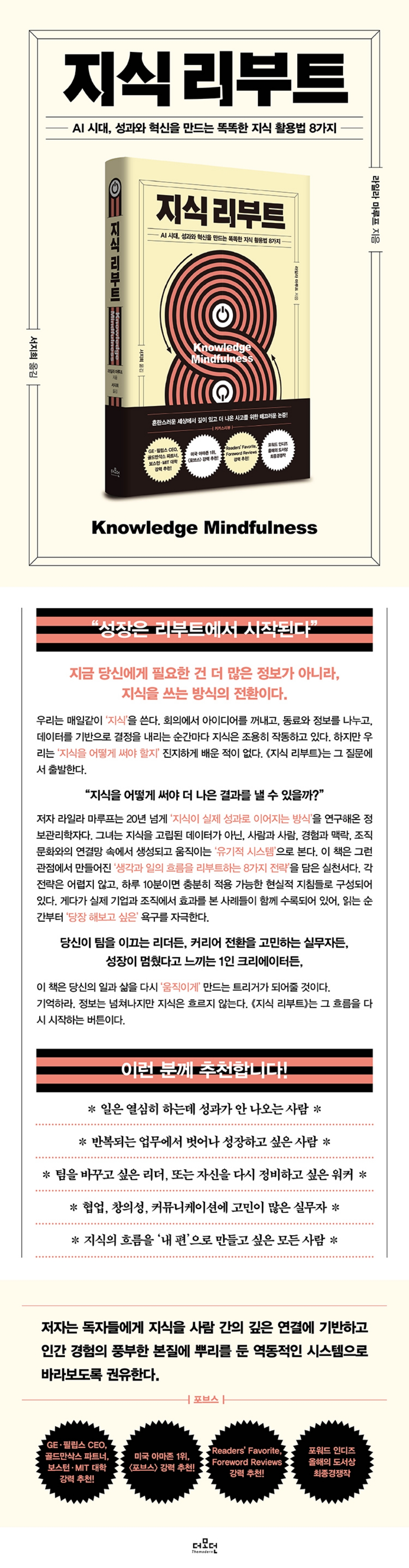 지금 당신에게 필요한 건 더 많은 정보가 아니라, 지식을 쓰는 방식의 전환이다. 우리는 매일같이 ‘지식’을 쓴다. 회의에서 아이디어를 꺼내고, 동료와 정보를 나누고, 데이터를 기반으로 결정을 내리는 순간마다 지식은 조용히 작동하고 있다. 하지만 우리는 ‘지식을 어떻게 써야 할지’ 진지하게 배운 적이 없다. 《지식 리부트》는 그 질문에서 출발한다. “지식을 어떻게 써야 더 나은 결과를 낼 수 있을까?” 저자 라일라 마루프는 20년 넘게 ‘지식이 실제 성과로 이어지는 방식’을 연구해온 정보관리학자다. 그녀는 지식을 고립된 데이터가 아닌, 사람과 사람, 경험과 맥락, 조직 문화와의 연결망 속에서 생성되고 움직이는 ‘유기적 시스템’으로 본다. 이 책은 그런 관점에서 만들어진 ‘생각과 일의 흐름을 리부트하는 8가지 전략’을 담은 실천서다. 각 전략은 어렵지 않고, 하루 10분이면 충분히 적용 가능한 현실적 지침들로 구성되어 있다. 게다가 실제 기업과 조직에서 효과를 본 사례들이 함께 수록되어 있어, 읽는 순간부터 ‘당장 해보고 싶은’ 욕구를 자극한다. 당신이 팀을 이끄는 리더든, 커리어 전환을 고민하는 실무자든, 성장이 멈췄다고 느끼는 1인 크리에이터든, 이 책은 당신의 일과 삶을 다시 ‘움직이게’ 만드는 트리거가 되어줄 것이다. 기억하라. 정보는 넘쳐나지만 지식은 흐르지 않는다. 《지식 리부트》는 그 흐름을 다시 시작하는 버튼이다. |