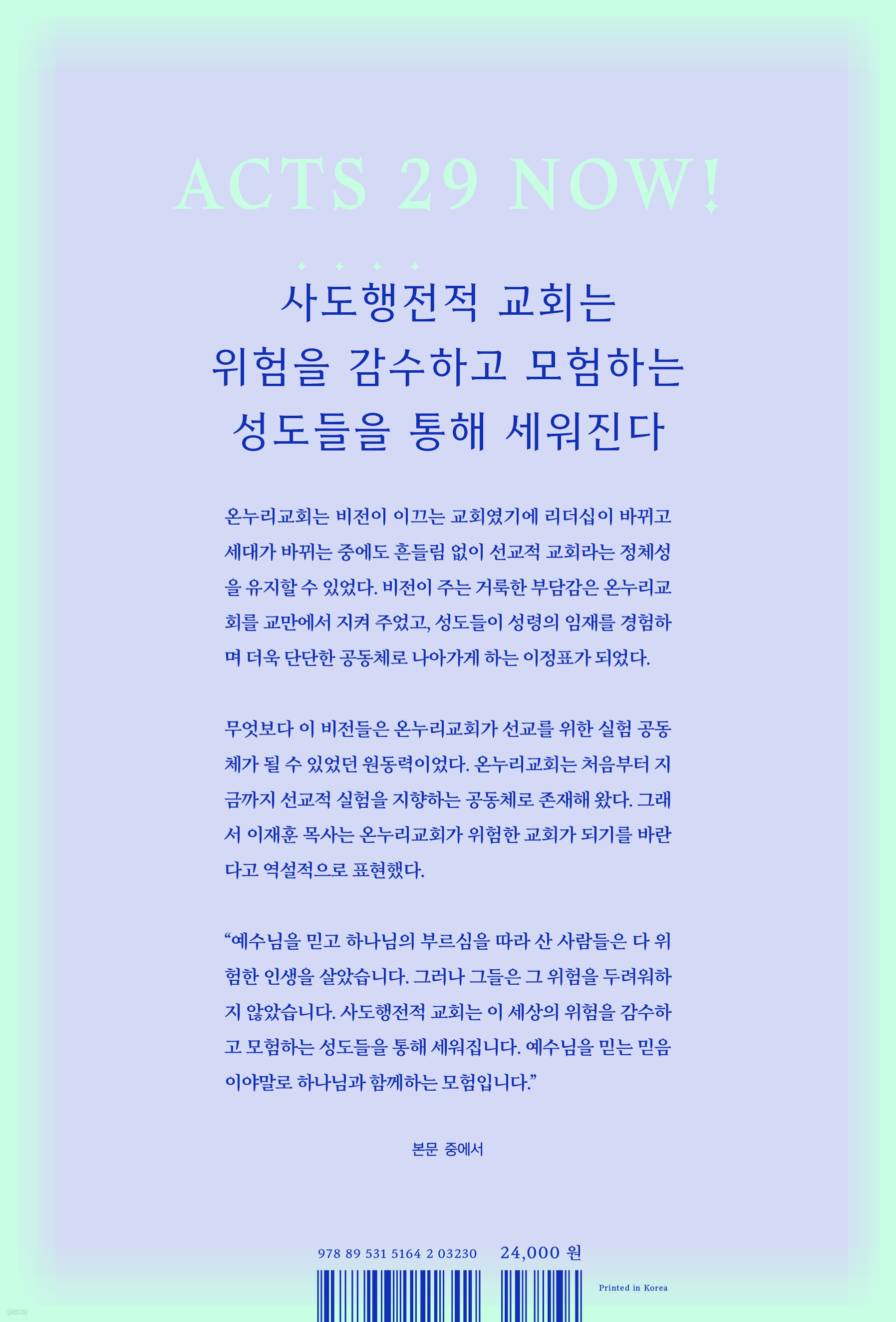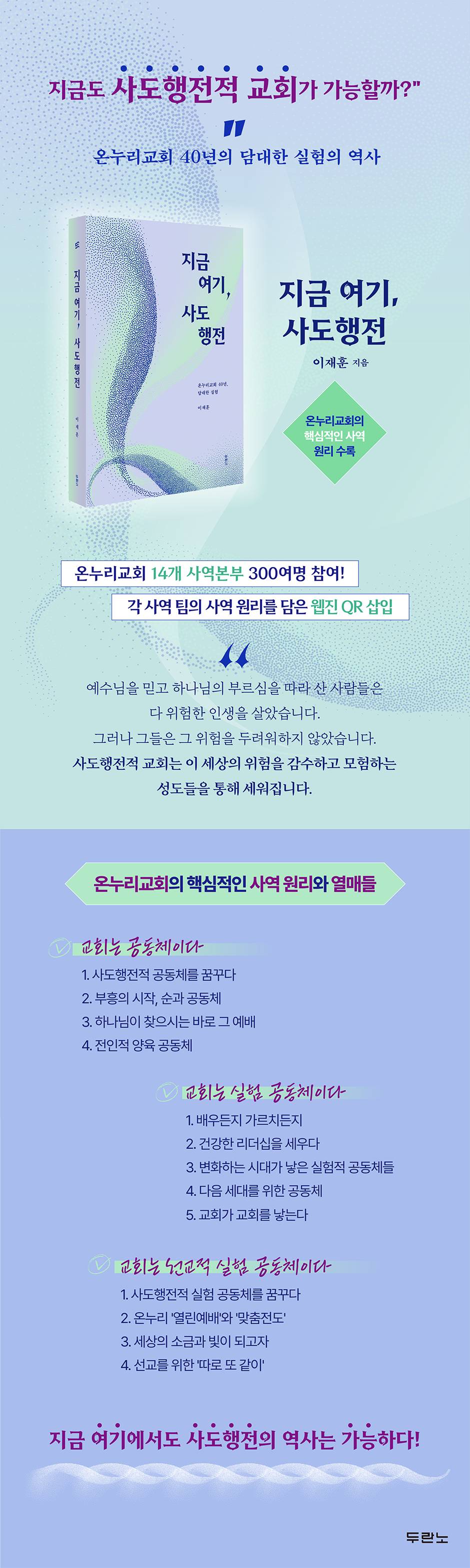 --- p.8 선교 훈련을 받는 동안 그는 무엇보다 동역에 대해서 배웠다. 하나님의 일을 할 때는 혼자서 짐을 다 지는 것이 아니라는 것을 알게 되었고, 그 일을 위해 함께하는 공동체에 대해 깨닫게 되었다. 선교단체에서는 소위 단짝이라는 것을 만들지 못하도록 했다. 둘만 단짝이 되면 다른 사람은 그와 친해질 기회가 없어 상처를 받기 때문이라고 말이다. 하나님의 일을 하기 위해서는 단짝이 아닌 좋은 동역자가 되어야 하며, 모두와 의 팀워크가 중요하다는 것을 배웠다. 신앙은 개인적인 부분도 중요하지만 공동체적으로 표현되는 것이 진짜 신앙이며, 나는 감추고 그리스도만 나타나는 것이 공동체라는 사실을 알게 되었다. --- p.15 그는 하나님께 다시 물었다. “그렇다면 2천 년이 지난 지금도 사도행전에서 보여 주신 그 교회가 가능할까요?” 그런데 그 질문 가운데 이런 확신이 들었다. 사도행전에 그런 교회가 있었다면 당연히 지금도 가능하다고. 하나님은 어제나 오늘이나 영원토록 동일하시니 분명 가능하다고 말이다. 그동안 교회가 없었던 것도 아니다. 목회자가 부족했던 것도 아니다. 그런데도 세상이 변하지 않는 이유는 사도행전적 교회가 아니기 때문이었다고. 사도행전적 교회는 제도와 관습의 틀을 벗어나서 회자가 주도하기보다 성령으로 충만한 성도들이 자발적으로 헌신하는 교회이다. 자기 성장보다 세상으로 나아가 복음을 증거하기 위해 함께하는 공동체이다. 하나님이 위임한 그 일을 이루기 위해 꿈꾸는 교회라면, 지금 이 시대에도 가능하게 하시지 않겠는가. --- p.16 한번은 처음 교회에 출석한 분이 있었는데, 뭐 하러 가는지도 모른 채 사람들에 휩쓸려 얼떨결에 버스에 올라탔다가 난생 처음 전도까지 하게 된 사람도 있다. 그분은 십일조 헌금을 하려고 들고 갔다가 그대로 주머니에 넣은 채 버스에 탄 것이다. 언제 목사님에게 드려야 하나 생각만 하다가 더 늦기 전에 내야겠다 싶어 “목사님 받으시죠” 하며 헌금을 내밀었다. 그러자 하 목사는 그 돈을 받지 않고 전도하러 간 동네 교회에 헌금을 하라고 했다. 새신자였던 그분이 헌금을 남의 교회에 해도 되냐고 물었더니, “남의 교회란 것이 어디 있습니까? 하나님 교회는 다 똑같으니 오늘은 시골 교회에 하시면 됩니다”라고 말해 주었다. 그 말씀에 감동을 받은 새신자는 제법 큰 액수의 헌금을 그 마을의 작은 교회에 드리고 돌아와서는 다음 날 곧바로 교회에 등록했다고 한다. 교회가 한창 건축 중이라 재정이 필요한 상황이었지만 하 목사는 자신이 갖고 있는 교회에 대한 생각을 이렇게 알려 주었고, 이 일은 성도들의 마음에도 큰 울림을 주었다. --- p.21 온누리교회의 성장 동력은 무엇일까? 많은 사람이 묻곤 한다. 그것은 성도들 안에 내재되어 있는 영성에서 답을 찾을 수 있다. 그것은 온누리교회의 DNA라고 할 수 있는 순예배와 큐티(Quiet Time), 일대일 제자양육에서 비롯된다. 온누리교회의 핵심 영성인 이 세 가지를 두고 이재훈 목사는 제도로서가 아닌 정신으로서 계승되어야 한다고 강조했다. 큐티는 하나님과 나의 만남이요, 일대일은 너와 나의 만남이며, 순예배는 우리라는 공동체와의 만남이다. 이것은 온누리교회가 40년간 이어온 오랜 영성이자 건강한 교회로 자랄 수 있는 초석이었다. --- p.25 하용조 목사는 좋은 교회의 표징이 담임목사여서는 안 되며, 오히려 그 교회에 좋은 성도가 많다는 것이어야 한다고 말했다. 언제나 ‘목사가 유명한 교회보다 성도가 유명한 교회’를 외쳤다. 그런 목회 철학을 따라 온누리교회는 성도들이 교회사역에 능동적으로 참여했다. 또한 순예배, 일대일 양육 등이 성도 중심으로 운영되고 있는데, 성령님의 인도하심을 믿고 과감하게 성도들에게 맡겼을 때, 더욱 많은 일꾼들이 세워졌고 다양한 사역의 확장이 일어났다. 이렇게 성령님과 목회자 그리고 성도가 하나가 되어 한 발 한 발 걸어온 믿음과 헌신이 온누리교회를 이끌어가는 크나큰 동력이라고 할 수 있다. --- p.26 사도행전은 2천 년 전의 이야기가 아니다. 지금도 여전히 뜨겁고도 신실하게 기록되고 있는 중이다. 온누리교회는 실제로 사도행전적 교회가 성취될 수 있음을 여실히 경험했고, 놀라운 부흥의 역사는 순종하는 성도들을 통해 지금도 전 세계 가운데 나타나고 있다. 우리가 모르는 사이에도 성령님은 일하고 계시기 때문이다. --- p.28 |