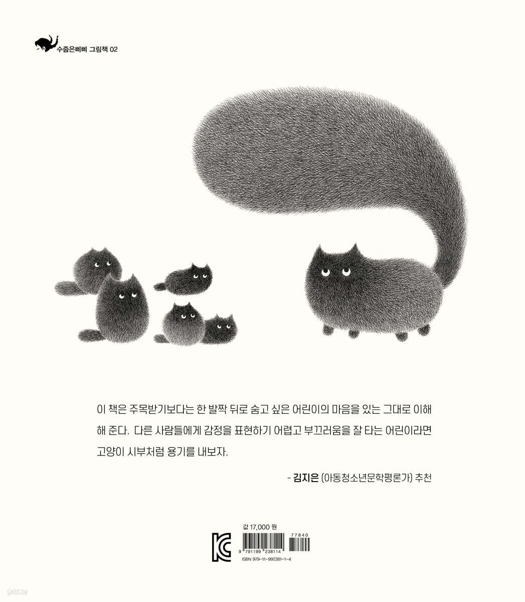 이 책은 주목받기보다는 한 발짝 뒤로 숨고 싶은 어린이의 마음을 있는 그대로 이해해 준다. 사랑스러운 시부의 꼬리는 어린이가 감춰둔 마음을 활짝 열고, 느낌을 말하고, 세상으로 한 발짝 더 나아갈 수 있는 방법을 알려 준다. 시부와 함께 우리는 잘 몰랐던 내 마음을 새롭게 깨닫게 된다. 다른 사람들에게 감정을 표현하기 어렵고 부끄러움을 잘 타는 어린이라면 고양이 시부처럼 용기를 내보자. - 김지은 (아동청소년문학평론가)