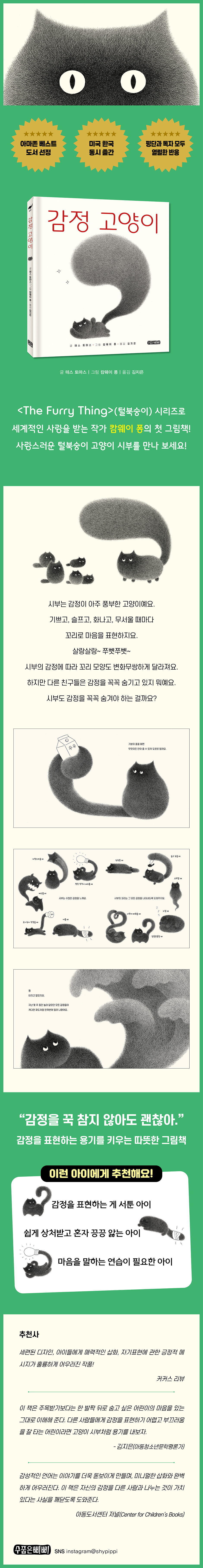캄웨이 퐁의 첫 그림책! ‘감정 표현이 서툰 아이에게 꼭 필요한 책!’ 〈The Furry Thing〉(털북숭이) 시리즈로 전 세계적인 사랑을 받는 작가 캄웨이 퐁의 첫 그림책이 출간되었다. 주로 동물 세계를 주제로 작업하는 작가는 2009년에 우연히 시작하게 된 북슬북슬한 동물 일러스트 시리즈 〈The Furry Thing〉을 선보이면서 세계적인 관심과 찬사를 받기 시작했다. 파리 살롱 데 보자르와 아트 엑스포 말레이시아 등에 전시 참여하였고, 세계 각국에서 개인전을 열었는데, 우리나라에서는 2024년에 개인전을 열어 국내 독자들에게도 친숙한 작가이다. 오로지 잉크 펜만을 사용하여 귀엽고 장난기 넘치는 고양이와 강아지 등 다양한 동물들을 그려냈는데, 수많은 얇은 선을 통해 밀도 있고 섬세하게 표현된 선들은 더할 수 없이 풍부하고 입체적이다. 이 책 《감정 고양이》는 작가가 지금까지 작업했던 사랑스러운 털북숭이들이 그림책으로 탄생한 첫 작품이다. 다양한 감정을 솔직하게 느끼고 표현하는 고양이 ‘시부’의 이야기를 따뜻하고 섬세하게 그려낸 책으로, 꼬리로 모든 감정을 표현하는 고양이 시부를 통해 수줍음 많고 감정 표현이 서툰 아이들이 자기 감정을 솔직하게 표현할 수 있는 용기를 얻을 수 있을 것이다. 감정을 숨긴 고양이, 시부의 이야기 이야기는 “이 아이는 시부예요.”라는 다정한 소개로 시작된다. 시부는 감정이 풍부한 고양이고, 시부의 꼬리는 그 감정을 그대로 표현해 주는 존재이다. 시부의 꼬리는 기쁠 때는 꼭 안아 주고, 화가 날 때는 털이 바짝 서며 시부의 속마음을 대변해 준다. 슬플 때, 무서울 때, 심심할 때, 배고플 때, 심지어 장난치고 싶은 순간까지 시부의 꼬리는 언제나 그의 마음을 함께 느끼며 반응한다. 하지만 어느 날, 시부는 주변의 시선을 의식하게 된다. 다른 친구들은 자신의 감정을 조용히 숨기는 것처럼 보였고, 감정을 표현할수록 더 눈에 띄는 자신이 부담스럽게 느껴진다. 결국 시부는 “감정을 표현하지 않으면 나도 눈에 띄지 않겠지.”라고 생각하고, 그때부터 꼬리를 억누르고, 마음도 숨기기 시작한다. 우유 배달 차가 와도 더 이상 꼬리를 흔들지 않고, 가장 좋아하던 장난감이 망가져도 화를 꾹 참는다. 겉으로는 아무렇지 않지만, 시부의 속마음은 점점 더 답답해져만 가고, 마침내 참아왔던 감정들이 한순간에 펑 터지고 마는데……. 이 책은 그 폭발 이후를 따뜻하게 그리고 있다. 감정을 억누르기보다 표현하는 것이 더 건강하고 편안한 일임을, 스스로 깨닫게 되는 시부의 성장은 독자들에게 깊은 울림을 줄 것이다. 부끄러움 많은 아이에게 용기를 북돋우는 그림책 《감정 고양이》는 아이들이 일상에서 마주하는 복잡하고 다양한 감정들을 따뜻한 이야기 속에 자연스럽게 녹여낸 그림책이다. 특히 꼬리를 통해 감정을 시각적으로 표현하는 독특한 설정은 아이들이 자신의 마음을 인식하고 외부로 드러내는 과정을 더욱 쉽고 즐겁게 받아들일 수 있도록 도와준다. 이 책은 단순히 ‘감정 표현이 중요하다’는 교훈을 주는 데 그치지 않고, 감정을 억누를 때 생기는 심리적 압박과 그 여파까지 섬세하게 보여 준다. 무조건 참는 것, 조용히 있는 것이 꼭 좋은 건 아니라는 메시지를 아이들의 시선에 맞춰 전달하고 있다. 시부가 감정을 숨기다가 결국 폭발하는 장면은 많은 아이들이 실제로 겪는 내면의 혼란과 맞닿아 있으며, 그러한 감정도 충분히 이해받아야 한다는 위로를 건넨다. 무엇보다 이 책은 다양한 감정을 드러내는 것 자체가 문제거나 약점이 아니라는 점을 강조한다. 오히려 감정을 표현할 수 있는 용기야말로 관계를 이어 주고 마음을 건강하게 만드는 가장 중요한 힘이라는 걸 시부의 이야기를 통해 보여 준다. 《감정 고양이》는 감정을 솔직하게 마주하고 나눌 수 있는 사회, 그리고 그런 감정들이 따뜻하게 받아들여지는 환경이 얼마나 중요한지를 어린이와 어른 모두에게 일깨워 주는 그림책이다. 감정을 꼭꼭 눌러 담고 있는 한 아이에게, 또는 그런 아이를 바라보는 어른에게, 이 책은 가장 따뜻하고 필요한 위로가 되어 줄 것이다. 치명적으로 사랑스러운 털 찐 고양이가 한가득! 보는 것만으로도 미소를 짓게 만드는 고양이 시부와 친구들이 가득해, 책장을 넘길 때마다 재미를 더한다. 더구나 소위 털 찐 시부의 볼살과 토실한 엉덩이, 구미호의 꼬리처럼 변화무쌍한 매력을 뽐내는 유연한 꼬리는 치명적일 만큼 사랑스럽다. 특히 다른 색 없이 오로지 검은색 잉크 펜 하나만으로 한 올 한 올 묘사한 그림은 오랜 작업 시간이 가늠될 만큼 섬세하고 정교하여, 마치 실제 고양이 털의 질감이 느껴질 것만 같다. 이 책 한 권에서 캄웨이 퐁 작가의 〈The Furry Thing〉 시리즈의 사랑스러운 고양이들을 한가득 만날 수 있다는 것은, 작가를 사랑하는 독자들에게 또 다른 큰 기쁨일 것이다. |