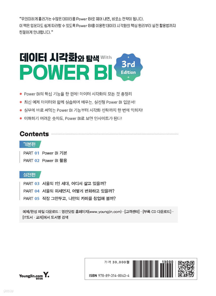 이 책은 Power BI의 기능적인 설명을 넘어서, 데이터를 읽고 해석하고 설득력 있게 전달하는 일련의 과정을 체계적으로 익힐 수 있도록 도와줍니다. 데이터를 처음 접하는 입문자부터, 실제 업무나 프로젝트에서 바로 활용하려는 실무자까지 모두에게 유용한 안내서가 될 것입니다. * 예제/완성 파일 다운로드 영진닷컴 홈페이지(www.youngjin.com) - [고객센터] - [부록 CD 다운로드] - [IT도서·교재]에서 도서명 검색 후 다운로드 「기본편」 PART 01 Power BI 기본 수집한 데이터를 효과적으로 분석하고 원하는 결과를 도출하기 위해서는 적절한 분석 도구의 활용이 필수입니다. PART 01에서는 Microsoft에서 제공하는 대표적인 데이터 분석 도구인 Power BI를 중심으로, 데이터 전처리부터 모델링, 시각화까지의 기본 흐름을 익힙니다. Power BI는 정리되지 않았거나 여러 곳에 흩어진 데이터를 쉽게 연결하고, 시각화 및 공유할 수 있도록 도와주는 강력한 비즈니스 인텔리전스 도구입니다. 사용법이 직관적이고 진입 장벽이 낮아 초보자도 금세 익힐 수 있으며, 실무에서도 즉시 활용 가능한 기능을 다양하게 제공합니다. 더불어, Power BI의 주요 구성 요소를 소개하고, 이를 활용한 데이터 분석과 시각화의 핵심 과정을 하나씩 살펴보며, 본격적인 실습에 앞서 탄탄한 개념과 기본기를 갖출 수 있도록 구성했습니다. PART 02 Power BI 활용 PART 02에서는 Power BI를 실무에 효과적으로 활용하는 방법을 다룹니다. 파워 쿼리 편집기를 활용해 여러 파일을 결합하거나 데이터를 추가해 하나의 통합 데이터로 구성하는 방법부터, 전월대비·전년대비 증감률 등 다양한 계산식을 DAX 함수로 구현하는 실습까지 함께합니다. 또한 Power BI Desktop에서 만든 대시보드와 리포트를 Power BI 서비스에 게시하고 조직 구성원들과 공유함으로써, 협업 환경에서도 손쉽게 정보를 전달하고 분석 결과를 공유할 수 있는 흐름을 익히게 됩니다. 데이터 가공, 분석, 시각화, 공유까지의 일련의 과정을 따라가며 Power BI의 진정한 활용법을 체감할 수 있는 중심 파트입니다. 「실전편」 PART 03 서울의 1인 세대, 어디서 살고 있을까? 서울의 10가구 중 4가구가 1인 세대일 정도로, ‘혼자 사는 삶’은 이제 특별한 현상이 아닌 한국 사회의 주요한 변화 흐름이 되었습니다. PART 03에서는 행정안전부의 주민등록 인구 데이터 및 인구이동 데이터 등 공공 데이터를 바탕으로, 서울 426개 행정동을 분석하고 1인 세대의 분포와 이동 특성을 파악합니다. Power BI를 활용해 데이터 수집부터 전처리, 시각화까지의 흐름을 직접 실습하며, 단순한 수치가 아닌 삶의 패턴과 도시 구조의 변화를 읽는 방법을 배웁니다. 혼자 사는 사람들은 주로 어느 동네에 살고 있을까? 어떤 특성을 가진 이들이 어디로 이동하고 있을까? 이 파트는 데이터를 통해 도시와 사람 사이의 관계를 통찰하는 경험을 제공할 것입니다. PART 04 서울의 미세먼지, 어떻게 변화하고 있을까? "미세먼지가 많아서 아이를 밖에 내보내기가 걱정이에요." 이처럼 미세먼지는 이제 서울 시민의 일상과 건강에 큰 영향을 주는 사회적 문제로 자리 잡았습니다. PART 04에서는 Power BI를 활용해 서울특별시의 대기오염 측정 데이터와 기상청의 기후 데이터를 분석하며, ‘과연 미세먼지는 해마다 더 심해지고 있는지’, ‘기온, 강수량 등 기후 요소는 미세먼지 농도에 어떤 영향을 미치는지’, ‘내가 사는 지역의 공기 질은 어떤 수준인지’와 같은 일상적인 궁금증을 공공 데이터를 통해 해석해 봅니다. PART 05 직장 그만두고, 나만의 카페를 창업해 볼까? “퇴사하고 카페 차릴까, 고민 중인데, 망하면 어쩌죠?” SNS에서 흔히 볼 수 있는 이 질문은 단순한 상상이 아니라 수많은 직장인들의 진짜 고민입니다. 실제로 카페 창업은 많은 이들의 로망이지만, 5년 내 폐업률이 70~80%에 달한다는 통계 앞에서는 누구나 망설일 수밖에 없습니다. PART 05에서는 Power BI를 보다 심화된 분석 도구로 활용해, 서울의 카페 창업 데이터를 분석합니다. 지자체 인허가 정보와 생활인구 데이터를 결합하여 상권별 카페 분포, 폐업률, 생존 기간 등을 시각화하고, 성공 가능성이 높은 지역의 특성을 다양한 시각화 객체를 이용하여 직관적으로 살펴봅니다. |