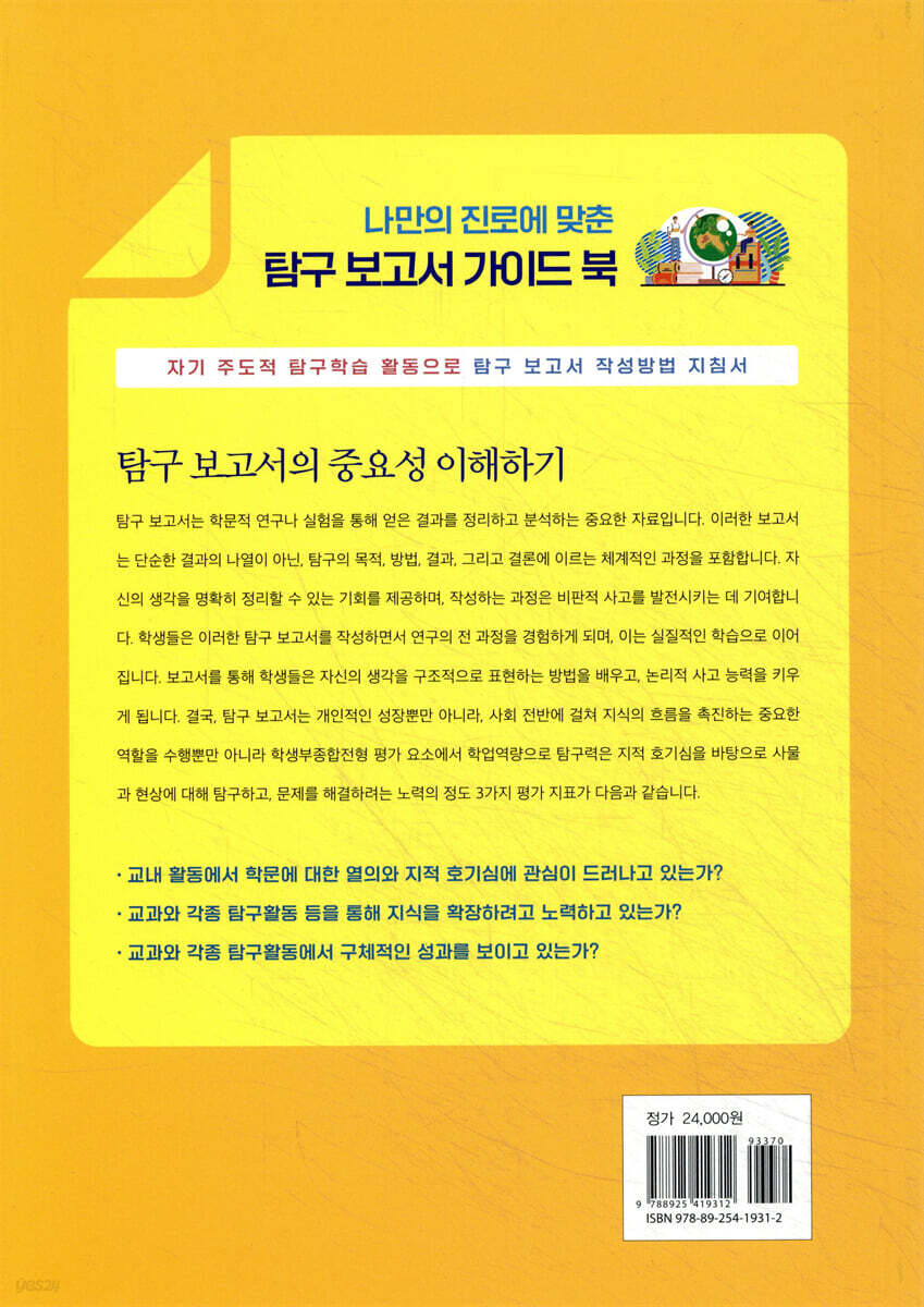 01. 과학의 탐구과정으로 과제 탐구 접근하기 ····························································9 02. 사회과학의 과제 탐구 주제 구체화 과정 및 탐구 절차 ········································15 03. 학생부종합전형 3가지 평가 요소로 살펴보는 과제 탐구의 중요성 ·························23 04. ‘역량’은 탐구활동으로 드러난다 ········································································29 05. 탐구활동 주제 찾는 방법과 순서 ·······································································39 06. 탐구활동 심화 주제 찾기 전략 - 논문 키워드 활용하기 ·······································41 07. 탐구활동 기획 및 기재 전략 ·············································································43 08. 심화/확장/연계 영역 선택 기준 ·········································································45 09. 심화/확장/연계 영역 선택 기준 예시 ··································································47 10. 심화/확장/연계 과제 주제 선택 시 체크리스트 ····················································49 11. 여러 가지 주제 키워드 및 자료 수집 방법 ··························································51 실전편 01. 탐구활동의 여러 가지 사례 ···············································································55 02. 탐구활동 매뉴얼 과정 사례를 통한 예시 ·····························································59 03. 통합과학과 통합사회, SDGs(지속 가능한 발전목표) 과제 탐구 주제 찾기·················63 04. 2022 개정 교육과정 및 독서활동을 통한 탐구활동 ··············································69 05. 탐구 주제 전공별, 키워드별 구체화 과정 ····························································71 06. 추가 자료 탐색 및 학술자료 분석 활동 ······························································77 07. 고3까지의 탐구 주제 활동 로드맵 ·····································································87 08. 탐구 주제 활동 로드맵 - 전공학과 관련 주제 ···················································101 09. 2022 개정 교육과정 &독서 연계 탐구활동 예시(심리학과) ·································105 10. 2022 개정 교육과정 &독서 연계 탐구활동 예시(의예과) ····································115 11. 2022 개정 교육과정 &독서 연계 탐구활동 예시(한약학과) ·································125 12. 2022 개정 교육과정 &독서 연계 탐구활동 예시(생명과학과) ······························159 13. 2022 개정 교육과정 &독서 연계 탐구활동 예시(화학과) ····································171 14. 2022 개정 교육과정 &독서 연계 탐구활동 예시(독어독문학과) ···························175 15. 참여한 교과수업 중 후속 심화활동 활동 예시(신소재공학과/화학과 또는 간호학과) ···195 16. 코로나로 인한 금융 자본주의 예시 ··································································201 17. 진로 관련 자유 주제 탐구발표 예시 ································································207 18. 탐구 보고서 양식 예시 ··················································································209 부록편 01. 2022 개정 교육과정에 따른 계열별(학과) 선택과목 및 인재상 ···························231 02. 학생부종합전형에 대비하는 전공(학과)별(26개) 특성과 소질, 핵심 키워드 ···········269 03. 탐구보고서 양식과 큐알코드 ··········································································319 04. 과제 탐구를 위한 유용한 정보검색 추천 사이트 ···············································339 |