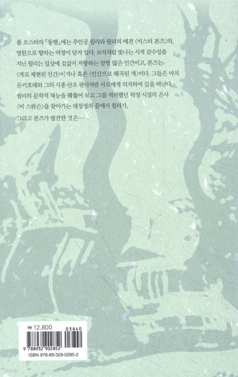 이야기는 주인공 윌리 G. 크리스마스의 영리하고 충직한 애견 '미스터 본즈'의 시점으로부터 시작된다. 콜리의 기질이 스며 있기도 하고 스파니엘의 피가 섞여 있기도 하고 래브라도 리트리버의 생김새를 닮기도 한 잡종 개 '미스터 본즈'는 그의 주인 윌리와 함께 볼티모어의 메릴랜드에 이르는 광대한 '신세계'의 모험을 떠난다. 그들의 긴 여정에서 떠오르는 생각들, 꿈들, 그리고 기억들은 적어도 아리스토텔레스만큼이나 멀리 거슬러 올라가는 아득한 물음을 던진다. 선의 본질은 무엇인가? 무슨 까닭에 인간은 다른 종의 동물들보다 우수하게 진화해 왔으며, 그들의 벗인 개들은 과연 영혼을 가지고 있는가? 무엇이 천국이며, 개는 거기에 이를 수 있는가? 이러저러한 의문들은 쉼이 없으며 어렴풋한 답들이 잇따라 꿰어 나온다. 『동행』을 읽은 후에 우리의 의식은 깨어나고 그로써 새롭게 변화된 몸뚱어리로 낯선 세계를 어슬렁거린다. 이것이 폴 오스터의 마법이다. |