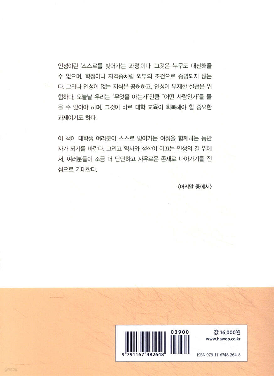 1. 생성형 AI 시대의 글쓰기의 의의 2. 생성형 AI 시대의 글쓰기 윤리 머리말 1장 전통의 힘 주나라의 봉건 제도 춘추시대의 전개와 사회적 특징 공자는 무엇을 보았는가 약속/전통을 왜 존중해야 하는가 우리에게 남겨진 두 가지 질문 2장 선함에 대한 믿음 전국시대의 등장 전국시대의 정치적 변화 전국시대의 전쟁과 지식인의 활동 맹자는 무엇을 보았는가 인간 본성은 선하다 선함에 대한 긍정적 사고 3장 어리석음에서 벗어나기 인도 문명의 태동 불교의 등장 배경 붓다는 무엇을 보았는가 붓다는 무엇을 깨달았는가 싯다르타의 가르침과 21세기의 청년 세대 4장 맹목성에서 벗어나기 종교 개혁의 배경 종교 개혁의 전개 종교 전쟁의 전개 맹목적 믿음에서 벗어나라(오캄) 기존 권위에 맞서다(루터) 계몽이란 무엇인가(칸트) 5장 저항과 침묵의 갈림길 독일사회와 유대인 제2차 세계 대전과 유대인 나치즘과 반(反)유대주의 전체주의의 본질과 인간성의 말살 악의 평범성과 도덕적 마비 도덕적 사유·판단의 회복 6장 연대의 가치 식민지 국가의 기근 배경 신자유주의와 기근 문제 협력을 위한 국제사회의 노력 가까운 사례에서 생각해보기 지구 반대편 사람들을 위해 기부하지 않는 것은 왜 부도덕한 것인가 세계적 차원에서 기근 구제하기 7장 전염병 시대의 돌봄 유럽 사회에서 신체에 대한 인식 서양의 질병 역사와 공간 분리 한국 역사 속 질병 문제 혐오의 기제로서 ‘질병’ 팬데믹 시대의 ‘돌봄’ ‘지구적 돌봄’의 가능성 8장 배움의 윤리학 유교의 제왕학(帝王學) 영조의 왕세자 교육 조선의 국왕교육 시스템과 정조(正祖)의 제왕학 군사(君師)로서 정조 자성(自省)과 신독(愼獨), 좌절 속에서 나를 묻는 공부 정심(正心), 감정과 욕망을 다스리는 기술 치성(致誠), 끝까지 실천하는 진심의 힘 9장 기계 시대와 인간의 삶 산업 혁명의 전개 과정과 유럽 사회 산업 혁명과 노동자 문제 기계의 등장과 인간 소외: 마르크스적 시선 기술이성의 비판: 호르크하이머와 아도르노의 시선 기술시대의 책임: 한스 요나스의 시선 10장 혐오를 넘어 공존으로 제국주의의 대두와 전개 과정 드레퓌스 사건과 1차 세계대전 이전 유럽 사회의 유대인 혐오 문제 제국주의와 1차 세계대전의 발발 혐오의 심리학적 이해: 심리학자들의 시선 혐오를 넘어서: 너스바움의 시선 공감과 상상력의 훈련으로서 인간성 교육: 너스바움의 시선 11장 환경문제와 인간의 위기 지구환경 문제와 인류의 위기 지속가능성을 향한 인류의 길: 환경 문제 해결의 역사 번역과 정화의 이중 논리 행위자-연결망과 생태정치의 재구성 녹색 계급의 실천윤리학 12장 AI 시대의 인간다움 인공지능(AI) 기술의 전개과정 인공지능(AI) 기술의 발전에 따른 문제들 기계에 압도당한 인간?: 위기이자 기회 판단을 대신하는 기계?: 책임을 지는 인간 알고리즘을 순응하는 기계?: 의미를 묻고 새로운 규칙을 만드는 인간 더 읽어볼 글 |