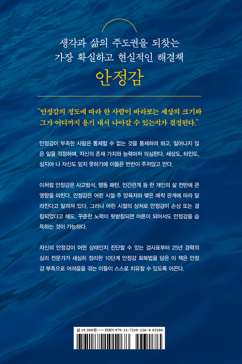 습득 가능한 안정감에 주목하라! 세대와 성별을 막론하고 수많은 사람들이 불안을 호소한다. 이러한 흐름에 호응하듯 불안을 관리하는 방법이나 한발 더 나아가 불안을 없애는 방법을 알려 주겠다는 솔깃한 주장을 하는 콘텐츠 역시 쏟아져 나오고 있다. 그런데 잠깐 멈춰 생각해 보자. 우리의 한정된 시간과 에너지를 쏟아야 할 대상이 정말 ‘불안’이 맞을까? 모두가 알다시피 인생은 예측할 수 없는 변수와 문제들로 가득하며, 이로 인해 촉발되는 불안감 역시 완벽한 통제나 제거의 대상이 될 수 없다. 지금 우리가 주목해야 할 것은 ‘안정감’이다. 언제 찾아올지 모르는 크고 작은 위기에 덜 흔들리고 주도적으로 대처할 수 있도록 내면의 기초를 단단히 쌓아야 하는 것이다. 안정감이 인생을 좌우한다면 믿을 수 있겠는가? 심리 치유 전문가인 저자가 ‘안정감’을 주제로 책을 쓰게 된 계기가 있다. 내담자뿐 아니라 심리 수업을 듣는 학생, 대중 강연을 찾는 사람들 중 스스로를 ‘안정감이 매우 부족한 사람’이라고 이야기하는 이들이 너무나 많았기 때문이다. 이처럼 안정감은 일상적으로 언급되지만 ‘안전’과 혼동되어 쓰이기도 한다. 안정감은 편안하고 안전한 상태를 바라는 심리적 욕구(안전 욕구)를 넘어서는 것으로, 자존감과 마찬가지로 내면의 핵심이자 개인 성장의 토대라 할 수 있다. 안정감은 나와 주변 환경 그리고 타인과의 관계가 안정적이고 예측 가능하다는 믿음에서 비롯되는데, 이를 뒤집으면 안정감이 부족한 사람들이 보이는 특징과 연결된다. 이들은 세상, 타인, 나 자신에 대한 믿음이 없다. 끝없는 걱정과 의심 속에서 사람들과 관계 맺기를 주저하고, 자신의 존재 가치와 능력에 대한 불신으로 인해 새로운 시도를 하지 못한다. 즉, 안정감은 한 사람의 사고방식과 행동 패턴, 인간관계 등 삶 전반에 큰 영향을 미친다. 저자는 책에서 안정감의 중요성을 다음과 같이 표현하기도 했다. “안정감의 정도에 따라 한 사람이 바라보는 세상의 크기와 그가 어디까지 용기 내서 나아갈 수 있는지가 결정된다.” 생각과 삶의 주도권을 되찾는 가장 확실하고 현실적인 해결책이 ‘안정감’에 있는 이유다. ‘안정감’을 본격적으로 다룬 첫 책이자 안정감 회복을 돕는 유일한 심리 치유서 안정감은 어린 시절 주 양육자와 맺는 애착 관계에 영향을 받는 것으로 알려져 있다. 생애 초기에 충분한 관심과 일관된 돌봄을 받지 못하면, 안정감이 손상되거나 결핍될 수밖에 없다. 다행인 것은 어린 시절 안정된 애착 관계를 경험하지 못했다 하더라도, 성인이 되어 의식적인 노력으로 애착 유형을 변화시킬 수 있듯, 안정감 역시 회복할 수 있다는 사실이다. 물론, 안정감을 회복하는 과정에는 긴 시간과 꾸준한 훈련이 필요한 만큼 전문가의 도움 없이는 첫발을 떼는 것조차 어려울 수 있다. 오랜 시간 내면화되어 혼자서는 깨닫기 어려운 ‘왜곡된’ 인지적 신념을 바로잡는 것부터 결코 만만치 않기 때문이다. 『안정감 수업』은 불안정한 어린 시절을 보냈던 당사자로서의 경험과 25년간 심리 치유 전문가로서 쌓아온 지식을 담은 책이다. 맞춤 처방처럼 10단계에 걸쳐 체계적으로 제시된 과제를 하나씩 풀고 직접 실천하다 보면, 당신도 분명 안정감 있는 사람으로 거듭날 수 있을 것이다. “평소 자신의 안정감이 어떤 상태인지 궁금했거나 취약한 안정감 때문에 고민인 분들에게 실질적인 도움을 주고자 이 책을 썼습니다. 책을 읽으며 자기 자신과 대화하고, 삶에 적용해 보면서 문제를 달리 바라보고 해석하는 기회를 가지면 좋겠습니다. 책의 메시지를 어떤 방식으로 활용하든 괜찮습니다. 자신의 내면을 더 깊이 이해하고, 외부와의 관계를 더 명확하게 알아차리기를, 안정감을 알아 가는 과정 끝에는 진정으로 자유롭고 편안한 행복을 만날 수 있기를 바랍니다.” (13~14쪽) [안정감 회복 과정에서의 핵심] · 1단계: 나에 대한 인식 재정의하기 → 자신에 대한 인식이 ‘과거의 상처 입은 나’에 머물러 있는 상태에서는 자신을 약하고 의존해야만 하는 존재로 보게 된다. · 2단계: 잘못된 신념 수정하기 → 왜곡된 채로 내면화된 인지적 신념들이 무엇인지 알아내야 나의 힘과 능력을 스스로 갉아먹는 악순환을 끊을 수 있다. · 3단계: 감정을 달래고 조절하기 → 감정 조절의 목적은 부정적인 감정이 주는 압박감을 완화하기 위함이다. 부정적 감정으로 생기는 압박감은 생존 본능을 자극해 불안감과 위기감을 일으킨다. · 4단계: 한계를 넘어서는 정신력 기르기 → 현재 겪고 있는 힘든 일이나 스트레스를 가능한 한 멀리 떨어져서 바라보려 노력한다. · 5단계: 자존감과 자기 가치감 다지기 → 다른 사람의 거절이나 반대를 ‘나의 중요성’과 ‘나의 가치’에 대한 평가로 연결 짓지 않는다. · 6단계: 통제 불가능한 요인 받아들이기 → 안정감은 결코 ‘통제’를 통해 얻어지지 않는다는 사실을 기억한다. · 7단계: 과거의 상처 의연하게 마주하기 → 과거의 경험들은 한때 내게 일어났으나 이미 지나간 것임을 인식하고, 그때 그 시공간 속에 있도록 놓아준다. · 8단계: 느리게 반응하고 사고하기 