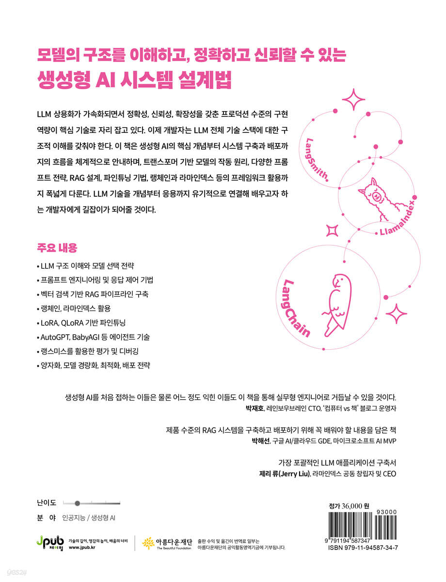 이 책은 현재까지 출간된 LLM 애플리케이션 구축에 관한 가장 포괄적인 교재로, 학습자들이 기본부터 간단한 응용까지 LLM 애플리케이션의 구성 요소를 이해할 수 있도록 돕는다. 응용 주제에는 프롬프트 작성, RAG, 에이전트, 파인튜닝, 배포 등 AI 엔지니어의 도구 상자에서 필수적인 주제가 포함된다. - 제리 류(Jerry Liu) (LlamaIndex 공동 창립자, CEO)