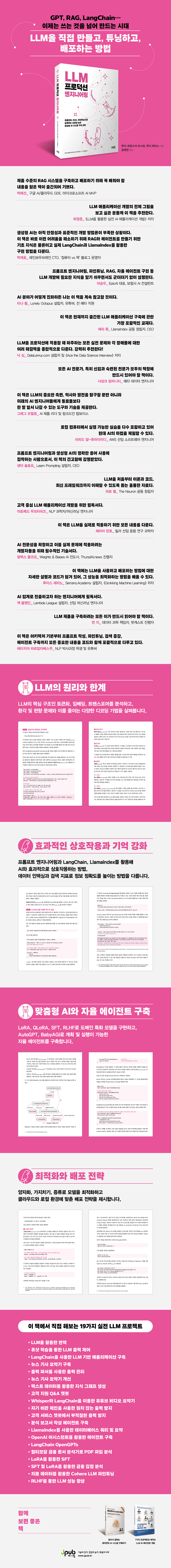 이 책은 LLM의 중요한 측면, 역사와 발전을 탐구할 뿐만 아니라 미래의 AI 엔지니어들에게 동료들보다 한 발 앞서 나갈 수 있는 도구와 기술을 제공한다. 프롬프트 엔지니어링, 에이전트 AI, SFT, RLHF, 양자화 등의 도전적이면서 중요한 주제를 다루며 즐거운 학습을 선사할 것이다. - 그레그 코퀼로(Greg Coquillo) (AI 제품 리더, 링크드인 탑보이스)