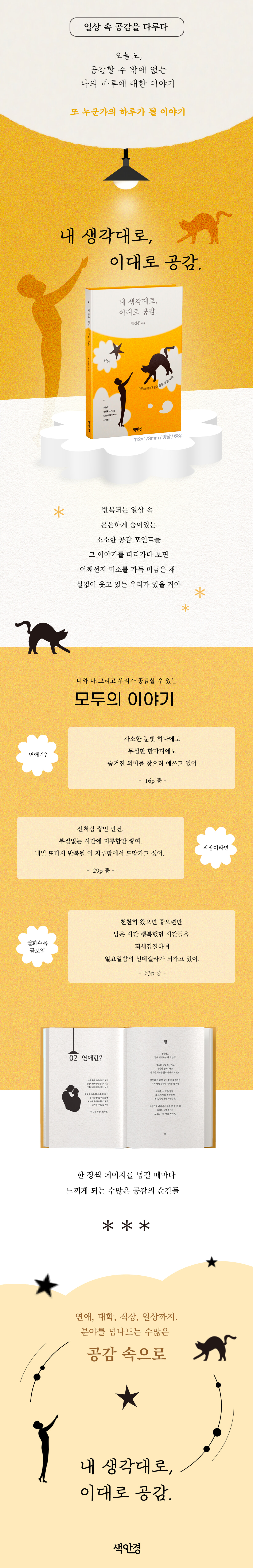 우리는 매일 반복되는 일상 속에서 수많은 감정을 마주합니다. 때로는 지치고, 때로는 설레며, 때로는 작은 행복에 미소 짓습니다. 『이대로 공감』은 바로 '오늘'을 살아가는 우리 모두의 솔직한 감정들을 섬세하게 포착하고, 그 안에 담긴 보편적인 공감대를 끌어내는 전진홍 작가의 새로운 시집입니다. 이 시집은 거창한 서사나 현학적인 언어 대신, 독자라면 누구나 고개를 끄덕일 만한 일상의 풍경들을 시인의 담백한 시선으로 풀어냅니다. '주말이 내일이라니, 아직 채 펼치지 못한 꿈처럼' 아쉬워하는 마음, '띵동, 익숙한 소리에 빨라지는 발걸음' 으로 배달 음식을 기다리는 소소한 기쁨 , '이불 밖은 왜 이리 싫지!' 라고 외치는 아침의 나른함 , 그리고 '조심스레 내민 손이 닿을 듯 말 듯' 한 '썸'의 떨림. 이 모든 순간들은 지극히 개인적인 듯 보이지만, 실은 우리 모두가 함께 겪는 감정의 조각들입니다. 『쓰여진 시간 8:39』을 통해 깊고 진한 사랑의 감성을 선보였던 전진홍 작가는, 이번 『이대로 공감』에서는 시야를 확장하여 '일상'이라는 거울에 비친 우리 자신의 모습을 비춥니다. 작가는 독자에게 "내 생각대로, 써 봤어" 라며 친근하게 말을 건네고, 독자는 시를 읽으며 "이대로 공감" 하게 됩니다. 이는 독자가 시에 완벽하게 동화되어 자신의 감정을 투영할 수 있도록 하는 작가만의 따뜻한 배려이자 뛰어난 재능입니다. |