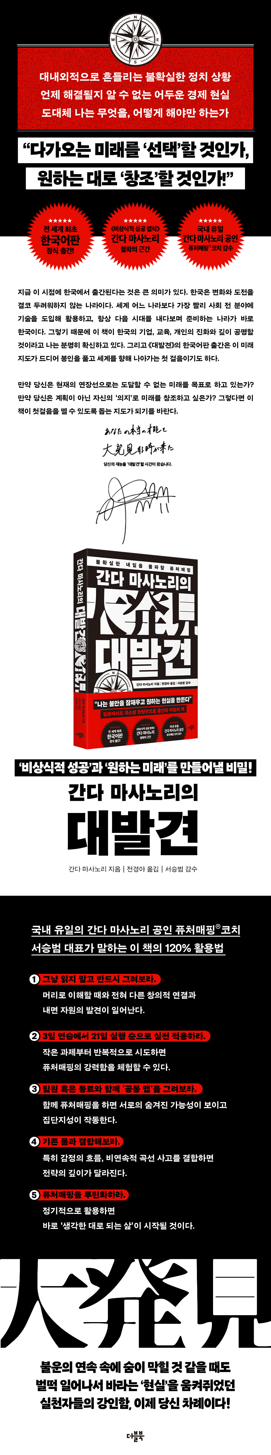 불확실한 내일을 돌파할 퓨처매핑“비상식적 성공”과 “원하는 미래”의 변화를 만들어낼 힘!일본의 출판계는 간다 마사노리의 등장을 기준으로 이전과 이후를 나눈다. 그 어떤 저자도 선보이지 못했던 신선한 시각과 분명한 철학을 담으면서도 누구나 어려움 없이 이해하고 바로 실천해볼 수 있도록 대화하듯 쉬운 문체로 풀어내 일대 혁신을 일으켰기 때문이다. 그렇게 그는 수많은 독자들을 새로운 세상으로 이끌며 열광하게 만들었다. 지금까지 간다 마사노리는 열정적으로 책을 펴내며 삶의 변화를 기대하는 수많은 독자들에게 사랑받아 왔지만, 단 한 권만큼은 비밀처럼 전해지며 모두가 가지고 싶어 하는 책이 되었다. 일본에서도 극소량 한정판으로 출간된 책, 간다 마사노리 철학의 근간이 되는 책, 전 세계에서 최초로 한국에 정식 번역 출간되는 책이 바로 《간다 마사노리의 대발견》이다.간다 마사노리가 이 책을 통해 보여주려는 것은 우리가 스스로 “비상식적 성공”과 “원하는 미래”의 변화를 만들어낼 힘을 발견하도록 하는 것이다. 그는 이를 실현하기 위해 “심리학, 신화, 양자역학, 신경언어프로그래밍 등 내가 관심을 가지며 다양하게 보고 듣고 배운 것들을 전부 엮어 이 책에 집어넣었다”고 강조한다. 그렇다면 대형 출판사에서 출간해 최대한 많은 홍보 속에 판매할 수 있지 않았을까. “대발견”이라는 제목에 걸맞은 힘을 가지고 있으면서도 극소량 한정판으로 출간할 수밖에 없었던 이유를 한국 독자를 위한 글에서 이렇게 설명한다. “너무나도 눈에 띄는 결과가 계속해서 나타났”지만 “이 도구의 힘이 진정으로 전달되기 위해서는 시대가 따라잡을 때까지 기다릴 필요가 있었”기 때문이다. 정치, 사회, 경제 등 모든 영역에서 당장 내일도 예측할 수 없이 불안으로 가득한 이 시점에, 일본 현지에서조차 구할 수 없는 이 책을 한국 독자들이 접할 수 있게 된 것은 큰 의미가 있다.다가오는 미래를 ‘선택’할 것인가,원하는 대로 ‘창조’할 것인가간다 마사노리가 이 책에서 말하는 ‘꿈’은 이상형을 연인으로 만난다느니, 좋아하는 일을 해서 부자가 되고 싶다느니 하는 것처럼 단순히 표면적 바람을 이루는 것이 아니다. 우리가 마주한 일에서 성과를 내는 것을 뜻한다. 한 장의 퓨처매핑을 그리면 꿈은 현실이 되고 그것은 우리가 살아가는 세계로 이어진다. 지금까지 유례가 없는 독특한 사고법이지만, 다른 방법론을 부정하지 않으면서 본질에 바탕을 두고 있다. 그는 이 책에서 결코 우리의 부족한 능력을 새롭게 갖추라고 강요하지 않는다. 이미 지닌 능력으로 성과를 내도록 이끈다. 그렇기에 “대발견”이라고 표현하는 것이다. 국내 유일의 간다 마사노리 공인 퓨처매핑 코치인 서승범 대표는 이 책을 120% 활용하기 위해 다음과 같은 조언을 한다.1. 그냥 읽지 말고 반드시 그려보라. 머리로 이해할 때와 전혀 다른 창의적 연결과 내면 자원의 발견이 일어난다.2. 3일 연습에서 21일 실행 순으로 실전 적용하라. 작은 과제부터 반복적으로 시도하면 퓨처매핑의 강력함을 체험할 수 있다.3. 팀원 혹은 동료와 함께 '공동 맵'을 그려보라. 함께 퓨처매핑을 하면 서로의 숨겨진 가능성이 보이고 집단지성이 작동한다.4. 기존 툴과 결합해보라. 특히 감정의 흐름, 비연속적 곡선 사고를 결합하면 전략의 깊이가 달라진다.5. 퓨처매핑을 루틴화하라. 정기적으로 활용하면 바로 ‘생각한 대로 되는 삶’이 시작될 것이다.간다 마사노리 철학의 근간을 담고 있는 이 책만 있다면 평생 성과를 창출할 수 있는 최강의 사고법을 손에 넣을 수 있음에도 실천하지 않을 이유는 없지 않을까. “불운의 연속 속에 숨이 막힐 것 같을 때도 벌떡 일어나서 바라는 ‘현실’을 움켜쥐는 실천자들의 강인함을 여러분과 공유하고 싶다”는 저자의 말처럼 지금 당장, 그가 이끄는 대로 하나씩 따라가며 바로 실천해보자.