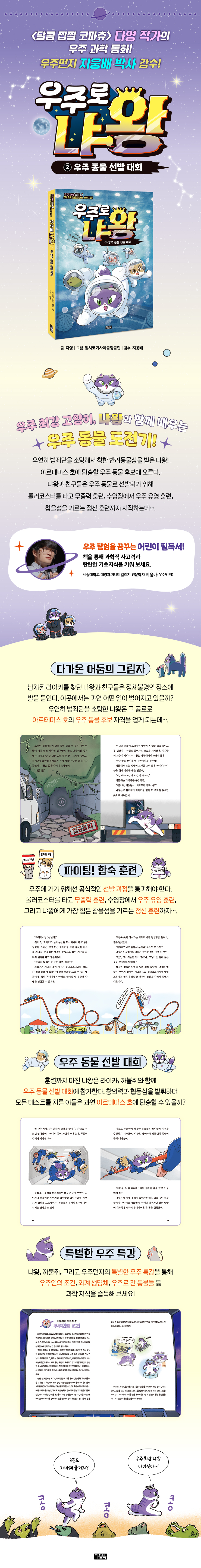 외계 고양이 냐왕, 다시 우주로 출발!우주 대모험을 꿈꾸는 냐왕의 특별한 지구 탈출 작전!발칙하고 귀여운 고양이 악당의 활약!-〈우주로 냐왕〉은 귀엽지만 대담한 마왕 냐왕이 우주로 돌아가기 위해 펼치는 유쾌한 모험담이다. -2권에서는 범죄단을 우연히 소탕한 냐왕이 우주 동물로 선발될 수 있는 절호의 기회를 잡게 된다. -냐왕의 황당무계한 계획과 예측 불가능한 전개는 독자들에게 큰 웃음과 흥미를 선사할 것이다.유머 + 과학 상식 = 우주 탐험을 꿈꾸는 어린이 필독서!-〈우주로 냐왕〉은 단순한 모험 이야기를 넘어 달 탐사, 중력, 로켓 기술 등 흥미로운 과학 정보를 절묘하게 엮어낸다. -‘우주여행’과 ‘천문학’이라는 소재를 쉽고 재미있게 풀어내 어린이 독자들에게 자연스럽게 과학적 호기심을 불러일으킨다. -냐왕과 친구들의 여정을 따라가며 독자들은 우주 탐사의 역사와 아르테미스 프로그램 등 다양한 과학 지식을 흥미롭게 익힐 수 있다. 읽기 독립 이후, 문장을 트이게 해주는 흥미진진한 책!-〈우주로 냐왕〉은 초등 저학년에서 읽기 독립을 시작한 독자들이 모험 속에서 자연스럽게 긴 문장과 서사를 경험할 수 있도록 구성되었다. -대화와 서술이 적절히 조화된 문장 구성을 통해 독서 능력을 키우고 문장 독립의 발판을 마련할 수 있다.-이 책은 글 읽기의 즐거움을 발견하고 스스로 책을 끝까지 읽는 자신감을 심어주는 최적의 독서 입문서다.