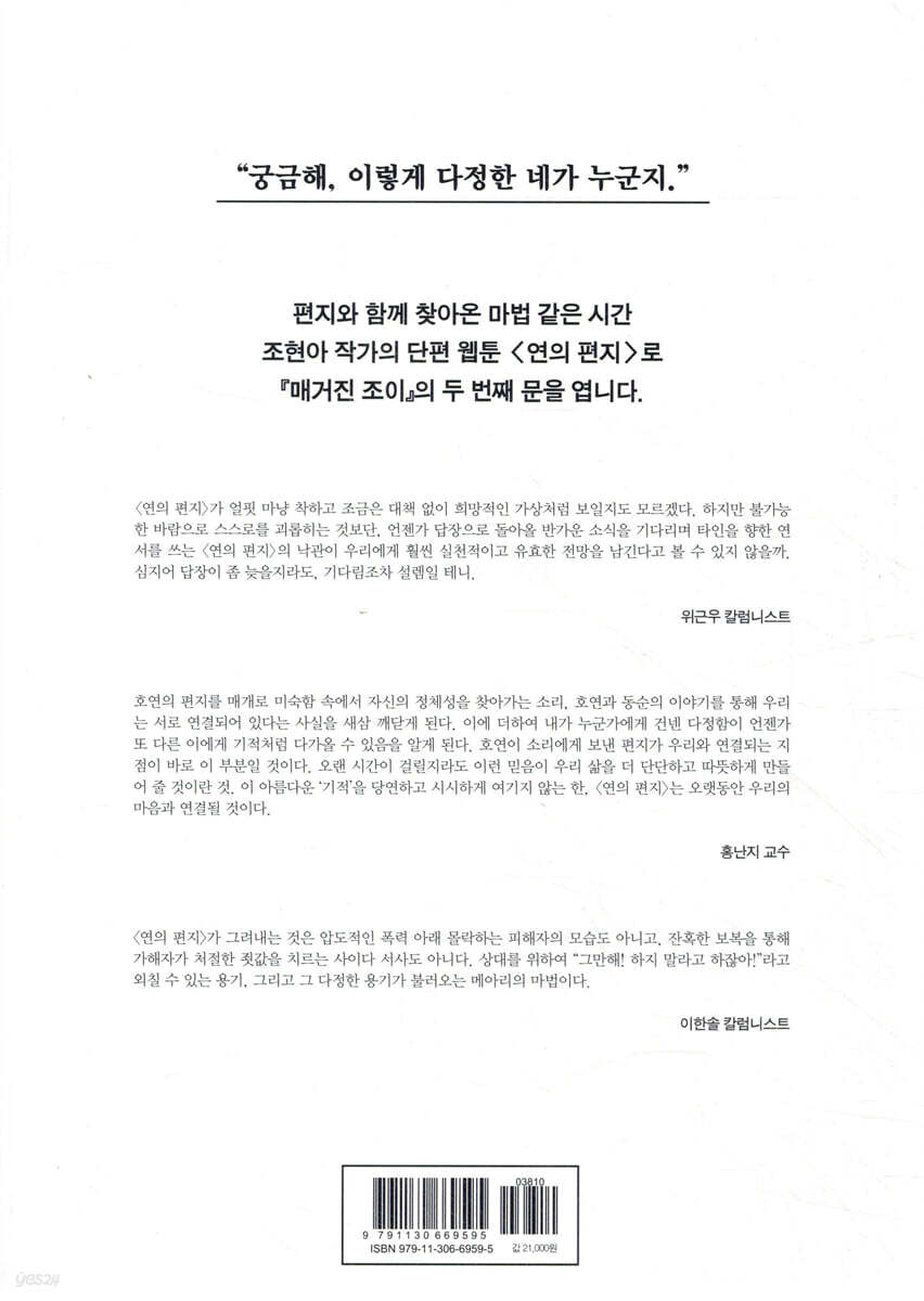 『매거진 조이』는 단 하나의 작품, 오직 한 명의 작가, 오로지 팬만을 위한 국내 최초 웹툰 전문 매거진입니다. 작품 정보와 등장인물 소개부터 원작의 감동을 그대로 옮겨 담은 명장면 다시 보기까지 웹툰의 모든 것을 한 권으로 일목요연하게 담았습니다. 메이킹 스토리와 작가의 이야기를 통해 웹툰이 탄생하기까지의 과정을 생생히 들여볼 수 있고, 작품을 둘러싼 입체적인 시선이 담긴 전문가 리뷰는 우리로 하여금 작품의 깊은 세계를 유영하게 만듭니다. 오직 매거진에서만 만나볼 수 있는 양질의 볼거리와 읽을거리로 웹툰을 넓고 깊게 감상할 수 있으며, 좋아하는 작품의 연재가 끝나더라도 책장을 펼치는 것만으로도 작품을 처음 봤을 때 느꼈던 설렘과 감동을 다시금 불러올 수 있도록 만들었습니다. 지루한 출퇴근길과 등하굣길을 웹툰과 함께하지만 스크롤과 함께 찰나로 흘러가 버리는 감상의 시간이 아쉬운 독자, 좋아하는 웹툰과 작가에 관한 깊고도 생생한 이야기를 조금 더 알고 싶어 하는 팬들, 웹툰 분야의 트렌드와 인사이트를 살펴보고자 하는 분들까지… 웹툰을 좋아하는 독자라면 다채로운 콘텐츠로 가득한 『매거진 조이』의 책장을 넘기며 웹툰을 새롭게 감상하는 즐거움을 느끼게 될 것입니다. 좋아하는 웹툰의 새로운 에피소드가 올라올 때마다 스크롤을 넘기며 느꼈던 짜릿한 즐거움을 『매거진 조이』라는 깊고 넓고 지속 가능한 즐거움을 통해 새롭게 체험해 보세요! 우연히 발견한 편지로부터 시작된 마법 같은 이야기 푸르른 여름의 끝자락을 따스한 감성으로 물들인 웹툰 〈연의 편지〉 2018년 8월 처음 공개된 이후 독자들에게 꾸준히 사랑을 받아 온 〈연의 편지〉는 조현아 작가의 여름 특선 10부작 웹툰으로, 발신인 불명의 편지를 받게 된 전학생 소리가 다음 편지를 찾아 나서게 되면서 벌어지는 마법 같은 이야기를 그려낸다. 웹툰 분야에서 로맨스, 판타지, 무협 등에 비해 인기가 적은 드라마 장르임에도 불구하고 〈연의 편지〉는 독자들에게 매년 여름 다시금 꺼내 곱씹어 읽고 싶은 웹툰으로 손꼽힌다. 오랜 시간 동안 〈연의 편지〉가 독자들에게 큰 사랑을 받은 비결은 청량하면서도 따스한 감성으로 깊은 여운을 남기는 작품이기 때문이다. 〈연의 편지〉는 웹툰에서 흔히 볼 수 있는 자극적인 요소를 덜어내고 늦여름의 정취를 물씬 담아낸 아름다운 작화와 서정적인 분위기, 그리고 마음을 움직이는 따뜻한 이야기로 그 빈자리를 채운다. 주인공 소리의 따뜻한 성장담, 편지라는 매개체를 통해 펼쳐 보이는 다정한 세계는 지친 우리의 마음을 부드럽게 어루만져 준다. 수많은 독자의 공감과 찬사를 받아 온 〈연의 편지〉는 '제16회 중국국제만화축제 금룡상 해외 특별상', '2019 오늘의 우리만화상'을 수상했을 뿐 아니라 '2019 우수만화도서', '2021년 부천의 책' 등 여러 기관과 단체에서 추천 도서로 선정되면서 대중성과 작품성을 모두 갖춘 수작임을 입증하기도 했다. 또한 올가을 개봉을 앞둔 극장판 애니메이션 〈연의 편지〉가 세계 주요 영화제 연이어 초청되면서 뛰어난 작품성을 다시금 입증하고 있다. 웹툰 〈연의 편지〉의 모든 것을 한 권에 담았다! 〈연의 편지〉에 의한, 〈연의 편지〉를 위한 단 한 권의 책 국내 최초 웹툰 전문 매거진 『매거진 조이 Vol.2: 연의 편지』 출간! 국내 최초 웹툰 전문지 『매거진 조이』의 2호 『매거진 조이 Vol.2: 연의 편지』가 출간된다. 다산코믹스는 다산북스의 웹툰 브랜드로 인기 웹툰 IP 〈가비지타임〉, 〈가짜 동맹〉, 〈토마토가 돼라!〉 등 웹툰을 좋아하는 독자들이 단행본으로 소장하고 싶어 하는 웹툰 IP를 찾아내서 발 빠르게 선보여 왔다. 다산코믹스는 그동안 쌓아 온 노하우를 담아 국내 최초 웹툰 전문지 『매거진 조이』를 준비하며 2호로 선보일 작품으로 조현아 작가의 웹툰 〈연의 편지〉를 만장일치로 선정했다. 『매거진 조이 Vol.2: 연의 편지』는 웹툰 〈연의 편지〉의 모든 것을 한 권에 담아낸 책이다. 작품 정보와 등장인물 소개부터 원작의 감동을 그대로 옮겨 담은 명장면 다시 보기까지 그야말로 〈연의 편지〉에 관한 모든 것을 일목요연하게 보여준다. 조현아 작가의 인터뷰와 메이킹 스토리를 통해 〈연의 편지〉가 웹툰으로 탄생하기까지의 과정을 생생히 들여다볼 수 있고, 〈연의 편지〉를 둘러싼 다양한 시선이 담긴 여섯 편의 리뷰는 읽는 이로 하여금 입체적인 시야로 작품의 깊이를 만끽하게 해준다. ‘〈연의 편지〉 독서 활동’, ‘전국연합덕력평가’ 등 〈연의 편지〉의 세계를 탐구하고자 하는 팬이라면 누구나 재미있게 즐길 수 있는 다양한 놀거리가 마련되어 있는 것 또한 이 책의 매력 포인트다. 특별 외전과 미공개 편지도 책의 소장 가치를 높이는 요소다. 그동안 어디서도 공개된 적 없는 이번 외전은 조현아 작가가 『매거진 조이』의 독자들에게 전하는 다정한 편지로, 〈연의 편지〉 완결 후 많은 독자들이 궁금해했던 소리·호연·동순 세 사람의 뒷이야기가 담겨 있다. 웹툰에서는 일부만 공개되었던 호연의 편지들 역시 『매거진 조이 Vol.2: 연의 편지』를 통해 처음 공개된다. 