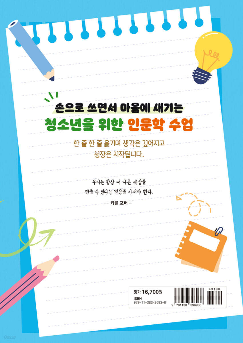 오늘날 사회는 빠르게 변하며 앞을 알 수 없는 불확실성으로 가득하다. SNS, 유튜브, 숏폼 등에서 수많은 정보가 쏟아지고 그 정보가 투영하는 생활 방식도 끊임없이 달라진다. 이런 시대를 살아가는 청소년에게 가장 필요한 것은 스스로 질문을 던지고 생각을 키워 나가는 힘이다. 이때 철학은 생각을 정리하고 진정으로 중요한 것이 무엇인지 판단할 수 있게 돕는 내면의 나침반과 같다. 읽고 쓰며 사고력을 기르는 통합 활동 『쓰는 순간 시작되는 진짜 생각 노트』는 시대를 뛰어넘은 철학자의 통찰이 담긴 문장을 담고, 각 사상과 연계되는 질문을 함께 수록하였다. 철학적 문장을 손으로 따라 쓰며 생각을 정리하고, 자신의 의견을 표현하는 활동을 통해 비판적 사고력과 창의적 사고력을 동시에 기를 수 있다. 아울러 자기 성찰을 통해 세상을 바라보는 시야를 확장하도록 돕는다. 내가 사는 사회를 이해하면 어떻게 살아야 할지 계획하는 일도 자연스럽게 이루어질 것이다. 한 줄 문장에서 시작해 삶으로 이어지는 청소년 철학 수업 책에 실린 사상가들은 각각 다른 시대와 국가에서 살며 삶에 대해 고민했다. 따라서 각 사상가와 사상이 등장한 배경 설명을 덧붙여 맥락을 이해하도록 돕고 있으며, 또 이 문장을 읽은 독자라면 같은 상황에서 어떻게 생각했을지 질문하여 사유의 물꼬를 튼다. 따라 쓰는 과정에서 나아가 왜 이 사상이 이토록 중요한지, 내 삶과 어떻게 이어지는지 등을 자연스럽게 묻는 것이다. 소크라테스, 공자, 쇼펜하우어, 니체 등 시대를 초월한 사상가의 문장은 십 대들이 중심을 잃지 않는 단단한 주체로 성장하는 데 큰 도움을 줄 것이다. |