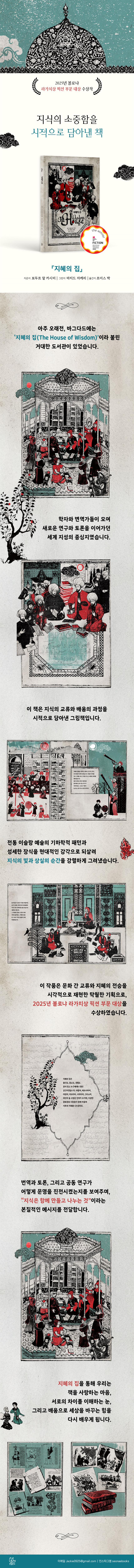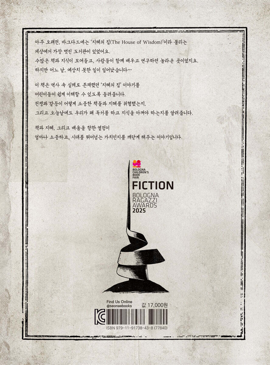 진정한 지혜는 책 속에 머무르지 않습니다. 사람과 사람 사이를 오가며 또 다른 형태로 살아나고, 삶의 방식이 되지요. 서로 다른 언어와 문화가 만날 때 비로소 더 넓은 세상을 향해 나아가는 힘이 됩니다. 『지혜의 집』은 과거 한 도서관의 이야기를 통해 지금 우리에게 필요한 그 가치를 일깨웁니다 이 책은 단순한 교훈에 머물지 않습니다. 실제 역사와 사건을 토대로 이야기를 엮어, 아이들이 자연스럽게 역사·인문·과학의 연결을 이해할 수 있도록 돕습니다. 번역과 토론, 그리고 공동 연구가 어떻게 문명을 전진시켰는지를 보여주며 “지식은 함께 만들고 나누는 것”이라는 메시지를 전합니다. 역사 속 사실을 바탕으로 한 서사는 아이들에게 인문학적 사고를 자연스럽게 선물합니다. 문명이 어떻게 발전해 왔는지, 왜 서로 다른 생각들이 만나야 하는지를 알려주며, 지혜의 본질은 나눔과 연결 속에 있다는 깨달음을 전합니다. 그림책이라는 형식을 빌렸지만 그 안에 담긴 메시지는 결코 가볍지 않습니다. 『지혜의 집』은 서로 다른 문화와 언어가 만나 인류 문명을 발전시켰던 과정을 어린이의 눈높이에 맞춰 아름답게 담아냅니다. 지식의 소중함과 문화 교류의 의미를 시적으로 표현하여, 단순한 역사 기록을 넘어 배움의 참된 가치를 전달합니다. 책과 지혜는 사라지지 않습니다. 다만 우리가 잊을 뿐입니다. 『지혜의 집』을 통해 아이들은 책을 사랑하는 마음, 서로의 차이를 이해하는 눈, 그리고 배움으로 세상을 바꾸는 힘을 배우게 될 것입니다. |