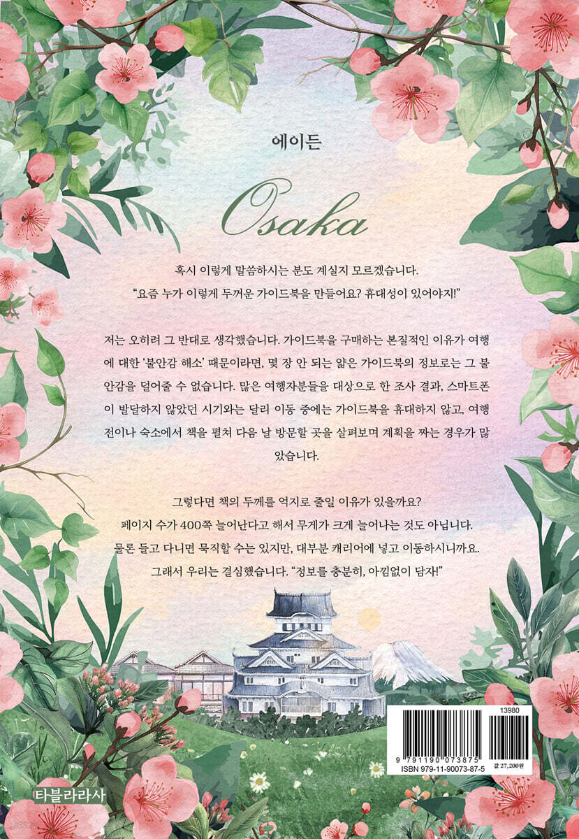첫 번째 해외 여행 가이드북!드디어 오사카·간사이(교토·고베·나라)로 출발합니다. 다들 그렇게 말합니다. 에이든이 만들면 신뢰할만 하다고!!! 에이든은 여러분께 단순 정보가 아닌 여행의 불안을 해소시켜 드립니다. 그냥 이책 하나면 이제 더이상 힘들게 인터넷 알아보지 않으셔도 됩니다. 타블라라사는 라틴어로 ‘빈 서판’을 뜻합니다. 아무것도 없는 백지에 그림을 그려가듯, 에이든은 아직 세상에 없는 여행 콘텐츠를 한 줄 한 줄, 하나씩 그려가고자 합니다. 마케팅에 의존해 브랜드를 키우지 않을 것이며, 오로지 콘텐츠만으로 여행자들에게 작은 빛이 될 것입니다. 타블라라사는 혁신을 지향하는 스타트업으로서 기존과는 다른 차별점을 제공할 것이며, 독자분들이 말하는 “미친 디테일”을 무기로 세계로 나아가겠습니다. ‘에이든(aiden)’은 고대 아일랜드어로 ‘작은 불빛’이라는 뜻을 지녔습니다. 여러분의 여행 준비가 막막할 때, 그 여정을 환히 비춰주는 작은 빛이 되겠습니다. 이 가이드북이 그 빛이 되어줄 수 있기를 진심으로 바랍니다. 에이든의 시작을 함께해주셔서 진심으로 감사드립니다. |