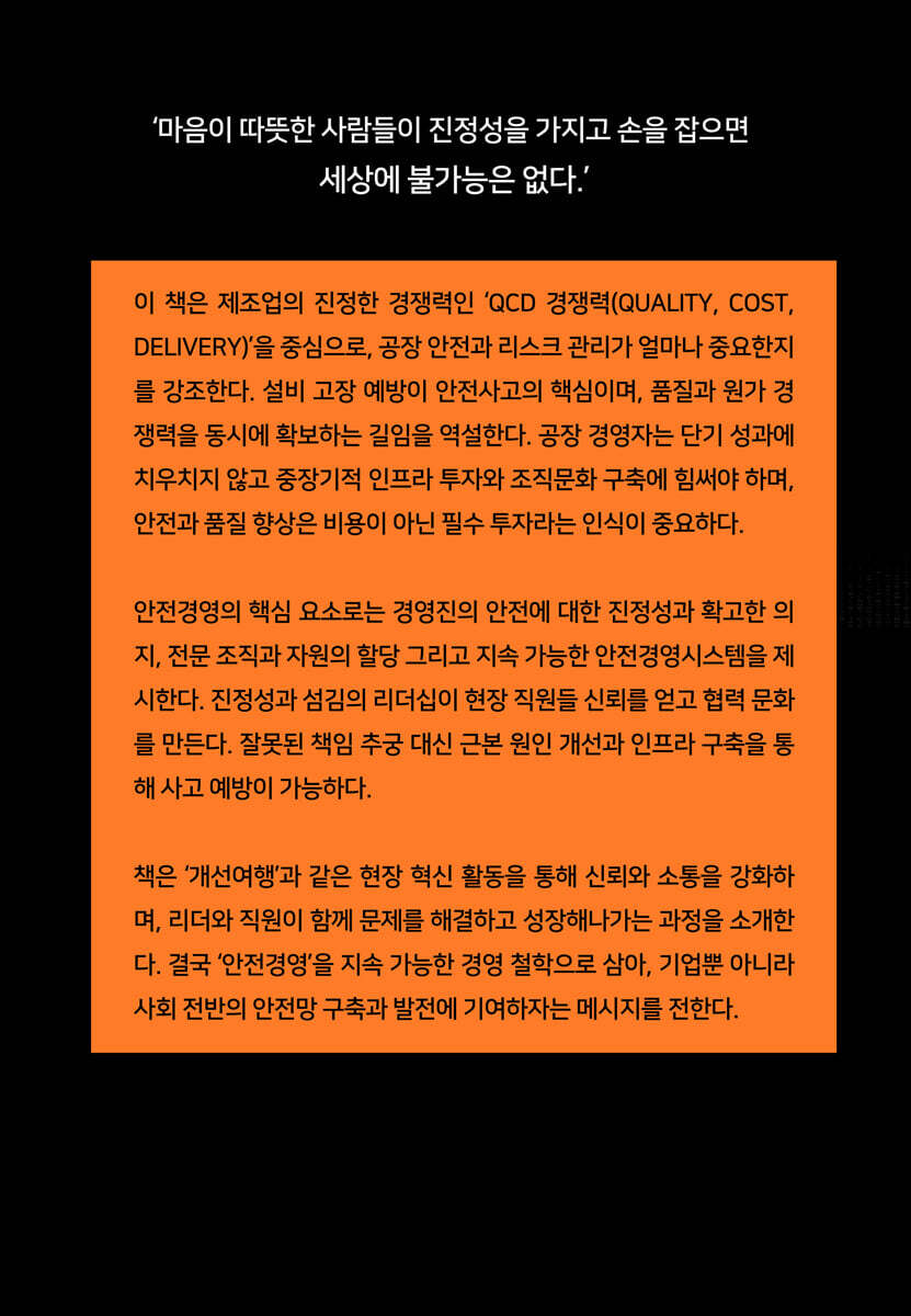 세상에는 이루지 못할 일이 없다.’ 1. 진정한 경쟁력 이란 제조경쟁력이란 한마디로 ‘QCD 경쟁력’이라고 정의할 수 있다. 고객과 시장이 원하는 제품을 균일한 품질(Quality, 품질 경쟁력)로, 가성비 있는 가격(Cost, 원가 경쟁력)으로, 원하는 때(Delivery, 납기 경쟁력)에 공급할 수 있는 경쟁력을 말한다.--- p.12 예를 들어 안전사고의 90% 이상이 설비고장이 있을 때 발생한다. 따라서 고장을 잡는 것 자체가 안전사고를 예방하는 일이다. 품질에서 산포가 나거나 고장이 나면 결국 비용이 상승하게 되어 있다. 그러나 대부분 거꾸로 일을 하고 있다. 품질과 원가를 한 번에 잡는 지름길은 안전 확보가 최우선이다. 동시에 그것이 진정한 제조경쟁력을 높이는 현명한 방법이다. --- p.17~18 2. 공장경영의 우선순위 공장 경영자는 공장경영의 우선순위가 리스크 관리임을 항상 명심하고 균형적인 공장경영을 해야 한다. 단기적인 성과에 매몰되어 중기적인 인프라 투자와 건전한 조직문화를 구축하지 않으면, 결국 후배 공장장이 그 리스크에 직면하는 불행한 일을 겪게 되기 때문이다. --- p.20 3. 안전과 품질은 비용이다? 정리하자면 설비 고장의 근본원인을 찾아서 고치는 것이 위험의 확률을 줄여 공장의 안전과 품질을 높이는 것이다. 이 근본원인에 대한 처방을 하지 않으면 맨날 고장 난 기계를 손 보느라 시간을 낭비한다. 자칫 설비를 수리하느라 분주한 직원이 일을 잘하는 것으로 보여질 수도 있다. --- p.23 4. 안전경영의 핵심3요소 첫째, Top의 안전에 대한 확고한 의지와 방침 둘째, 안전 전문 조직 구축과 자원의 할당 셋째, 지속 실행 가능한 안전경영 시스템 --- p.25 5. 진정성이 오는 순간 지방 사업장으로 발령을 받았을 때, 회사에서 직원들에 대해 무리하게 감사를 하려고 하기에 내가 나서서 막았다. 현장 직원들을 보호해 주고 싶었다. 내가 그렇게 방어를 해주니 되레 직원들이 내 걱정을 하면서 “공장장님, 그냥 가만히 계세요”라고 말할 정도였다. 아무 책임이 없는 신임 공장장이 나서서 자신들을 변호를 해주니 다 내 편이 되었다. 진정성으로 직원들을 지켜주려는 마음이 통한 것이다. 이윤을 추구하는 기업이지만 모든 것을 삐딱한 시각으로 보면 서로 힘들어진다. 일의 능률도 오히려 저하된다. 한번 맺은 소중한 인연으로 생각하면 현장의 직원들 모두 나를 돕는 고마운 존재들로 다가온. --- p.43 6. 원가보다 안전을 상석에 둬라 특히 안전경영 활동은 이론으로 되는 것이 아니다. 반드시 조직 구성원을 통한 현장의 확실한 변화를 이끌어내어 현장의 상시 안전상태(Risk Free)가 확보되어야 한다. 그러므로 현장 구성원들의 안전 책임자(리더)로서 역할을 다하기 위해서는 ‘모든 구성원이 안전한 작업 환경에서 즐겁게 일하는 환경을 최우선으로 확보하는 것’을 최종 목표로 삼아야 한다. --- p.55 7. 잘못된 신상필벌의 원칙 2014년 1월 모 사업장에서 불이 난 적이 있다. 수순에 따르면 공장장이 책임을 지고 사퇴하는 게 관례였다. 나는 당시 A공장장을 해임하는 것에 반대했다. “누가 해도 마찬가지입니다. 다음에 불이 또 나면 공장장과 함께 책임을 질 테니 저를 믿고 시간을 주십시오.” 눈 가리고 아웅해서는 근본원인이 해결되지 않는다. 질책과 책임 추궁이 만능이 아니다. 그 전에 사고예방 인프라를 갖춰놓지 못한 것이 원인이기 때문이다. 화재사고를 있는 그대로 복기하고, 대형화재로 확산된 원인들을 찾아내어 모두 개선하고 다른 사업장에도 수평전개 하였다. 그 이후 사업장의 대형화재는 더 이상 발생되지 않았다. --- p.57 8. 섬김의 출발점 ‘서번트 리더십’ ‘자랑스런 삼성인상’을 받았을 때 삼성경제연구소에서 인터뷰를 하러 온 적이 있다. 상을 받게 된 동력이 뭐냐는 질문에 나는 “같이 일하는 구성원들이 더 안전한 작업환경에서 생활하고 싶은 마음이 전부다”라고 대답했다. 공장 구성원이 다치면 관리자의 책임이 가장 크다. 지금까지 나와 함께 일 하는 구성원들의 안전을 책임진다는 마음으로 30여 년을 살아왔다. 그것이 동료도 살고 나도 사는 길이라고 여겼다. 그러다 보니 회사에서 어떤 목표가 내려오면 직원들이 자신감을 가지고 100% 이상의 실적을 달성하는 것을 체험했다. --- p.64 9. 바람직한 리더십 4가지 원칙 1) 비전공감의 리더(Visionary) 2) 변화추진의 리더(Change agent) 3) 인재육성의 리더(Empowerment) 4) 가치실천의 리더(Role model) --- p.66 10. 안전경영 시스템 사업장에서 발생 가능한 위험을 사전에 인식하여 발생원인을 규명하고 방지대책을 실행하여 위험의 발생 확률을 지속적으로 낮추어 가는 위험 관리체계이다. (인식 - 개선 - 예방 - 대응 - 진단) --- p.88 11. 개선여행의 4가지 프로세스 신뢰(Trust)를 바탕으로 오픈(Open)할 수 있도록 한 것이다. 그 다음으로 리더와 문제점을 공감하고 소통하는 자리를 마련했다. 리더와 스탭이 함께 여행단 활동을 지원할 수 있도록 지속적인 커뮤니케이션 (Communication)과 지원(Support) 활동을 실시했다. 매주 1회 이상 자발 적인 개선여행 활동과 지원을 통해 리더와 구성원 간의 벽이 허물어지고, 공감대와 소통이 이루어지게 되었다. --- p.165~166 12. 자발적 