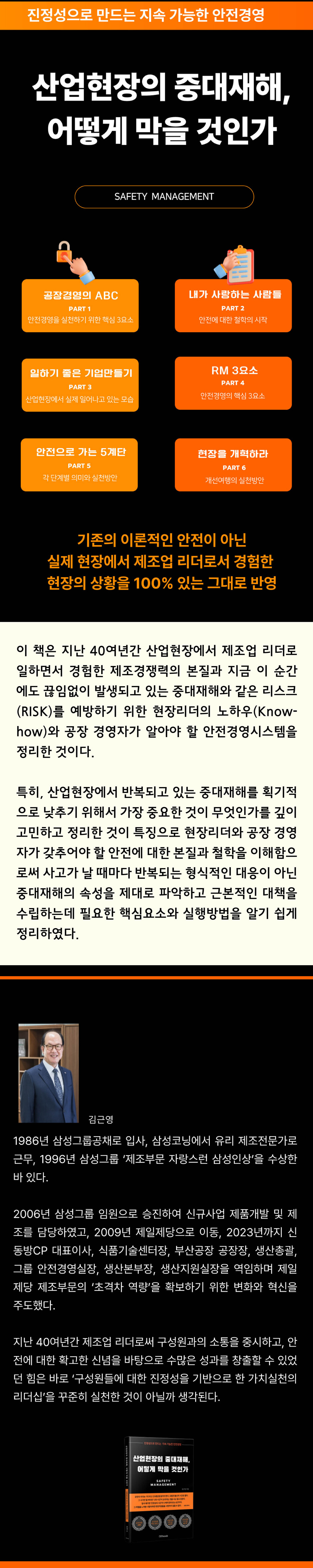 이 책은 저자가 현장에서 안전사고로 재해를 입은 구성원의 아픔을 막아 보겠다는 신념과 열정으로 안전제일의 현장경영을 통해 터득한 안전경영의 본질을 정리하여 중대재해는 반드시 예방할 수 있다는 공감대를 이끌어내고 획기적인 중대재해 감소의 성과를 만들어내고자 하는 간절함으로 출간되었다.