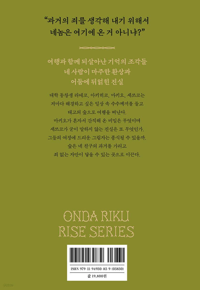 --- p.13-14 이미 익숙해진 숲의 공기가 농밀하게 밀려들었다. 나무들의 끈끈한 숨결이 어둠 속에 뒤섞인다. 안도감과 성가신 듯한 기분이 동시에 솟았다. 숲은 과보호하는 어머니 같다. 숲속을 걷는 이의 귓가에 요염하게 속삭이며, 살갗에 들러붙고 머리털에 감겨들면서 온몸을 감싸안으려고 두 팔을 벌리고 기다린다. 그녀의 속삭임은 온몸의 모공과 점막을 통해 안으로 파고든다. 어디에 있어도 도망칠 수 없다. --- p.44 글쎄, 어떨까. 한번 천천히 생각해 봐. 그러기 위한 즐거운 여행이잖냐? 분명히 아키히코도 처음에 말했지. 우리는 과거를 되찾기 위해 여행한다. 과거에야말로 진짜 미스터리가 있다. 십수 년 전의 시간과 자기 자신을 환기시켜 주는 멤버, 보다 깊은 사색을 하는 데에 안성맞춤인, 속세와 단절된 목적지. 여기서 천천히 과거의 죄를 생각해 내기 위해서 네놈은 여기에 온 거 아니냐? --- p.98 네가 죽였냐? 가지와라 유리에 관해 아키히코와 이야기한 적이 있었던가. 리에코와 친했으니 몇 번 화제에 오른 적은 있었을 것이다. 실은 그의 먼 친척이라는 이야기는 들은 것 같지만, 직접 이야기해 본 적은 없는 모양이다. 어째서 아키히코는 나와 가지와라 유리의 관계를 의심하고 있었을까? --- p.113 딱히 감출 생각은 없었지만 굳이 말할 필요도 느끼지 못했고, 좌우지간 당사자들은 하루하루 싸우느라 솔직히 그럴 여유가 없었다. 내 친구들은 아무도 이 일을 모른다. 이번 여행에서도 세 사람에게 털어놓을 마음은 나지 않았다. 모처럼 온 여행인데 그런 이야기를 하면 엉망이 될 것이다. 그들이 이 사실을 알게 되는 것은 노리유키의 부고를 받고 나서일 것이다. --- p.238 되살아나는 추억에 가슴이 벅차올랐다. 나는 그 꿈의 의미를 알아냈다. 하지만 애석하게도 고소공포증의 이유는 그 속에 없다. 어차피 인생은 수수께끼가 한두 개쯤 있어도 곤란할 것 없다. 오히려 그 편이 풍취가 있다. 미안하지만 내가 발견한 의미를 아키히코에게 가르쳐줄 마음은 없었다. 그에게도 풀리지 않는 수수께끼를 조금은 남겨주는 게 친절이 아닐까. --- p.327 |