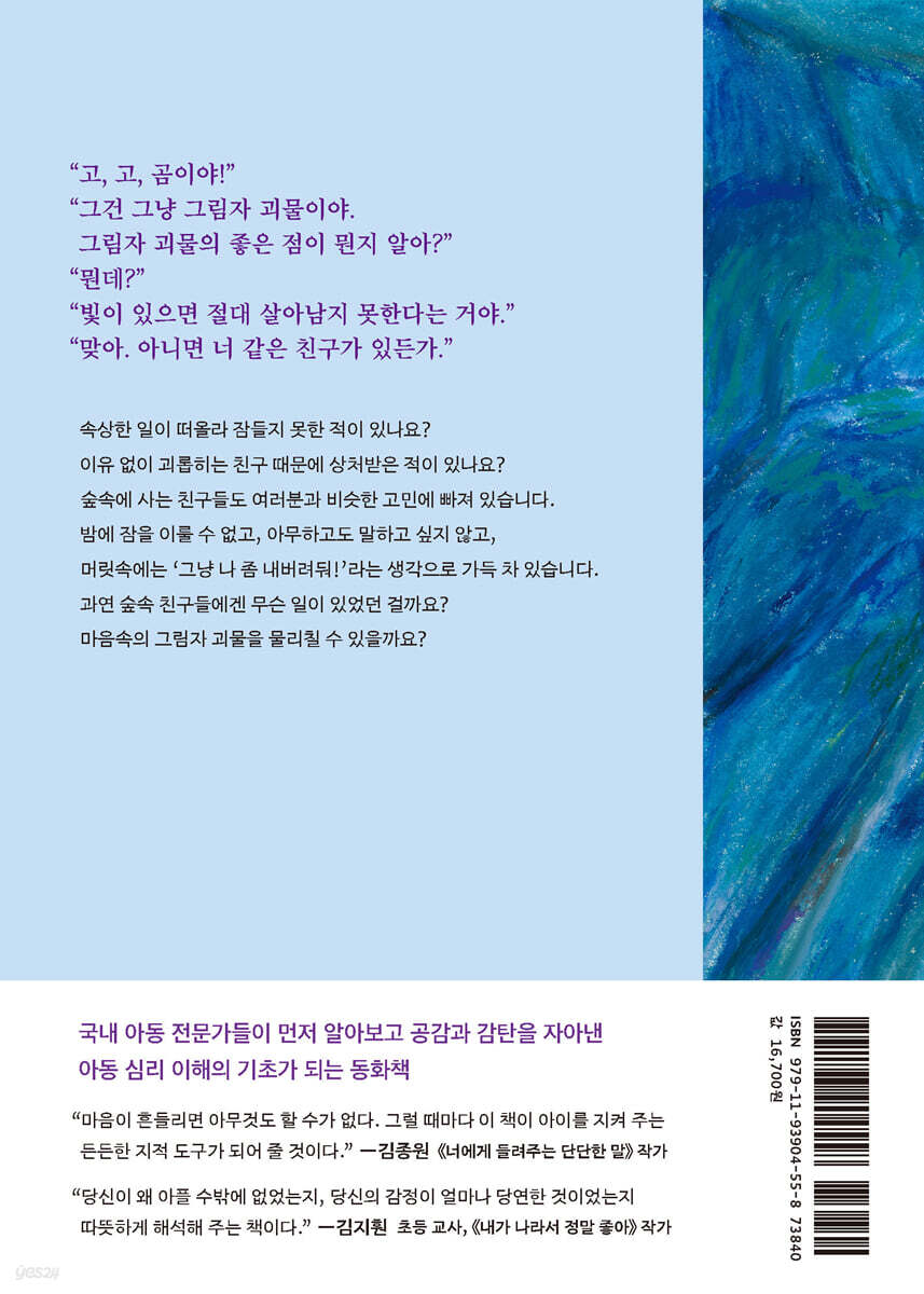 “어린이가 자신을 설명하기 어렵고 어른이 어린이를 이해하기 어려울 때 이야기가 필요하다는 사실만은 기억해야 한다. 어린이와 어른을 동시에 사로잡는 책” 국내 아동 전문가들이 먼저 알아보고 공감과 감탄을 자아낸 아동 심리 이해의 기초가 되는 동화책 ◆ “아이가 갑자기 감정과 행동을 다스리기 힘들어하며 고군분투하는 것은 당신이나 당신의 아이가 ‘나빠서’ 그런 것이 아니다. 절대, 아니다” 이제는 도통 마음을 알 수 없는 아이에게 그래도 한 번 더 말 걸고 싶은 어른들을 위한 책 영국에서 아동·청소년 전문 심리치료사이자 트라우마 전문 치료사로 인정받고 있는 헤일리 그레이엄의 첫 번째 동화책 《그림자 괴물과 마음의 숲》은 《마당을 나온 암탉》의 작가 황선미, 그리고 김종원, 김지훤 등 국내 아동 전문가들이 먼저 알아보고 공감과 감탄을 자아낸 책이다. 초등 고학년이 되면 아이가 무엇 때문에 힘이 드는지, 무엇을 고민하고 있는지 깊이 있는 대화를 나누기가 쉽지 않다. 자신의 고민과 감정에 대해 부모에게 터놓고 이야기하는 대신, 또래 친구에게 공유하거나 자신만의 비밀로 간직하는 쪽으로 점차 변하기 때문이다. 설령 어떤 문제가 생겨서 힘들어하고 있다는 것을 알아채도 바쁜 일상에서 대화를 시작하기는 무척 어렵다. 의도가 좋다 치더라도 솔직한 얘기가 오가기는커녕 어색해지거나 말다툼으로 이어져 소통이 단절되기 일쑤다. 그러다 보면 아이는 아이대로, 부모는 부모대로 ‘내가 나빠서’, ‘내가 부족한 사람이라서’라고 생각하며 자기 탓을 하게 된다. 그러나 초등 고학년은 사춘기를 앞두고 아이와 부모가 솔직하게 대화를 나눌 수 있는 매우 중요한 시기로 허무하게 흘려보낼 수 없는 때이기도 하다. 이 시기를 어떻게 보내야 할지, 어떻게 아이와 속 깊은 이야기를 나눌 수 있을지 고민하는 부모를 위한 책이 바로 《그림자 괴물과 마음의 숲》이다. 이 책은 다섯 편의 짧은 동화와 해설, 아이들이 스스로 생각을 정리해 볼 수 있는 질문지로 구성되어 있다. 그간 한국에서는 만나볼 수 없었던 독특한 형식으로, 저자가 현장에서 마주한 가장 흔한 마음의 문제인 불안과 강박장애, 애착, 수치심, 슬픔, 트라우마를 어떻게 이해하고 치유할 수 있을지에 대한 전문가의 조언을 담고 있다. 아이가 방문을 닫고 자신만의 세계로 들어가기 전에 한 번이라도 더 이야기를 나누고 싶은 부모와 선생님, 심리치료 전문가에게 아이를 이해하고 대화를 시작하게 도와주는 훌륭한 도구가 되어 줄 것이다. ◆ “나는 네가 괜찮은 아이라는 걸 알아” 깊은 상처를 받고도 끝내 스스로 극복하고, 내 옆의 친구를 다정히 위로할 줄 아는 용기 있는 아이들에게 “속상한 일이 떠올라 잠들지 못한 적이 있나요? 이유 없이 괴롭히는 친구 때문에 상처받은 적이 있나요? 숲속에 사는 친구들도 여러분과 비슷한 고민에 빠져 있습니다. 밤에 잠을 이룰 수 없고, 아무하고도 말하고 싶지 않고, 머릿속에는 ‘그냥 나 좀 내버려둬!’라는 생각으로 가득 차 있습니다. 과연 숲속 친구들에겐 무슨 일이 있었던 걸까요? 마음속의 그림자 괴물을 물리칠 수 있을까요?” 여우, 부엉이, 산토끼, 수사슴 등 숲속 친구들이 등장하는 다섯 편의 동화는 단순하고 예상 가능한 이야기다. 착하고 다정한 주인공이 이유를 알 수 없는 마음의 문제로 홀로 괴로워하다 우연히 친구를 만난다. 친구와 함께하는 동안 숨겨져 있던 용기와 힘을 되찾은 주인공은 상처를 스스로 극복하고 한 뼘 더 자란 모습으로 친구와 행복한 결말을 맞이한다. 그러나 이 짧은 이야기 속에 주인공의 심리 상태는 누구나 공감하고 이해할 수 있는 언어로 섬세하게 표현되어 있고, 친구를 다정히 위로하는 말은 단순하지만 울림이 커서 나도 모르게 눈물이 핑 돌게 만든다. 쥐는 알았다, 그냥 알았다. 이게 모두 자기 잘못이라는 것을. 만약 쥐가 더 빨리 달렸거나, 더 빨리 생각했거나, 아니 망설이지만 않았어도, 이런 일은 절대 일어나지 않았을 것이다. ‘정말 멍청하고, 바보 같아!’ 그런 생각을 하며 쥐는 벌떡 일어나 달렸다. 달리고 달리다가 결국 돌 밑에 있는 구멍에 빠져 흐느껴 울었다. (중략) "난 다 봤어. 자책하지 마. 어떤 것도 네 잘못이 아니야. 넌 아무 문제 없어. 넌 괜찮은 친구야.” “아주 괜찮은 친구지. 네가 구했어. 네가 꼬마 토끼를 구했다고.” _본문 중에서 십여 년이 넘는 기간 동안 수많은 아동·청소년 심리상담을 해 왔던 저자는 이렇게 말한다. “마음의 문제를 겪고 있는 아이들은 자기 비판적인 성향이 굉장히 심하고 자신이 어떤 해를 입힐까 봐 두려워하며, 책임감을 매우 강하게 느끼는 신중한 아이인 경우가 많다. 근면 성실한 이 완벽주의자들은 다른 사람들을 보호하려는 배려심 깊고 예민한 사람들이다. 그런 아이들이 자신을 ‘나쁜 사람’이라고 믿거나 자신이 어딘가 근본적으로 ‘잘못’되었다고 생각하는 것은 아이러니다.” 이 책은 깊은 상처를 스스로 극복할 수 있을 만큼 용감하고, 곁에 있는 친구를 눈여겨 보고 위로할 줄 아는 배려심 깊은 아이들에게 “너는 참 괜찮은 아이”라고, 잘하고 있다고 
