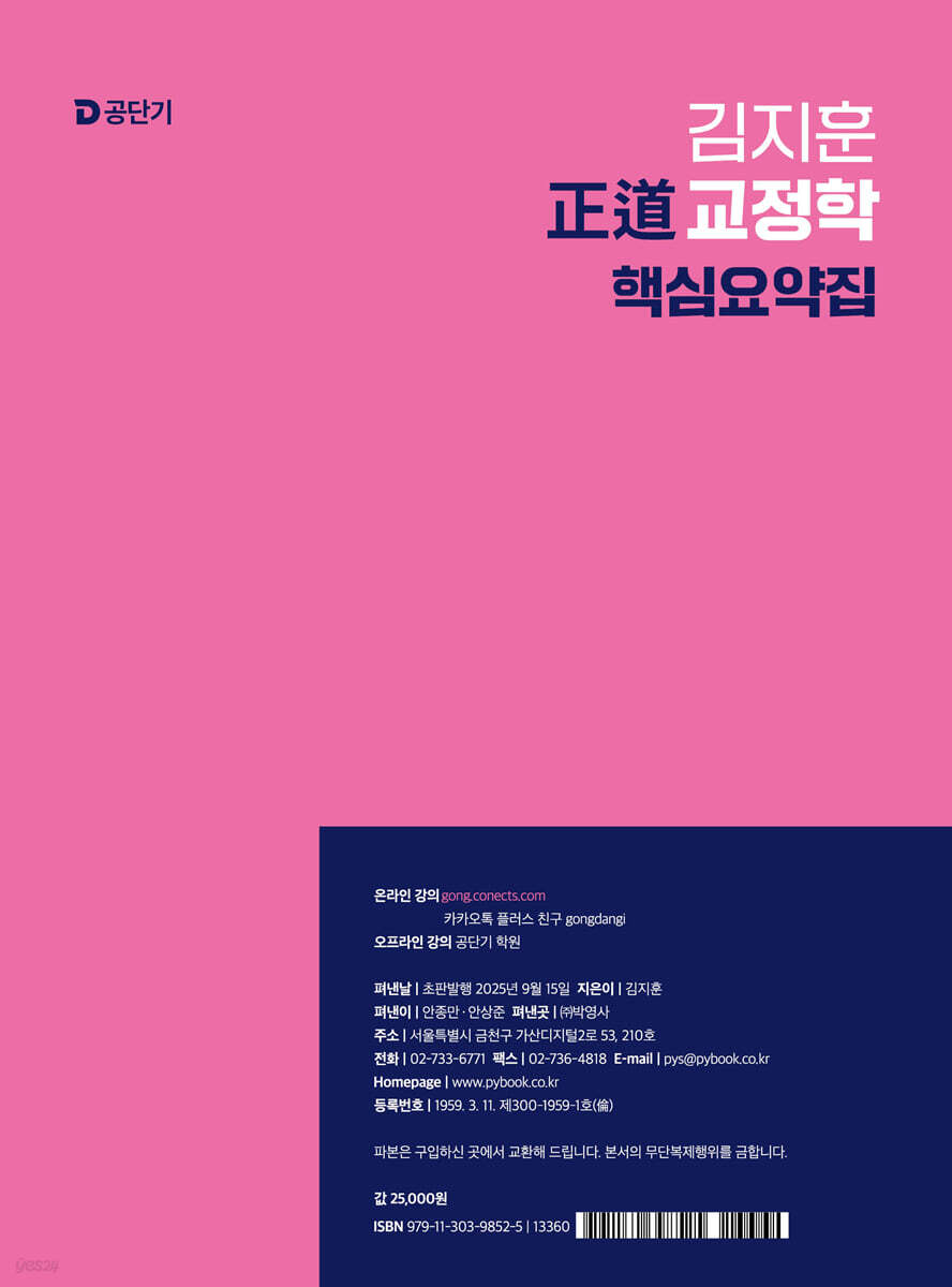 PART 01 | 형사정책의 개관 CHAPTER 01 | 형사정책의 개관 CHAPTER 02 | 암수범죄 PART 02 | 범죄원인의 이해 CHAPTER 01 | 범죄원인에 대한 시각과 처벌의 정당성 CHAPTER 02 | 범죄학이론의 역사적 발전 CHAPTER 03 | 범죄학 이론 CHAPTER 04 | 사회학적 범죄원인론 PART 03 | 범죄현상론 CHAPTER 01 | 주요 범죄별 특징과 추세 CHAPTER 02 | 환경인자와 관련된 범죄 PART 04 | 범죄피해자론 CHAPTER 01 | 범죄피해자학 CHAPTER 02 | 범죄피해자보상제도 PART 05 | 형벌과 보안처분론 CHAPTER 01 | 양형의 합리화와 판결 전 조사제도 CHAPTER 02 | 형벌의 종류 CHAPTER 03 | 보안처분론 CHAPTER 04 | 현행법상 보안처분제도 PART 06 | 범죄예방과 범죄예측 CHAPTER 01 | 범죄예방 CHAPTER 02 | 과학적 범죄예측 PART 07 | 소년범죄론 CHAPTER 01 | 소년범죄의 특징과 대책 CHAPTER 02 | 소년법 CHAPTER 03 | 보호소년 등의 처우에 관한 법률 CHAPTER 04 | 아동 · 청소년의 성보호에 관한 법률 PART 08 | 범죄인 처우론 CHAPTER 01 | 범죄인 처우의 개관과 처우모델 CHAPTER 02 | 범죄인 처우의 새로운 동향 부록 CHAPTER 01 | 위임규정과 숫자 및 암기법 정리 2부 교정학 PART 01 | 교정학의 이해 CHAPTER 01 | 개관 CHAPTER 02 | 교정의 역사 PART 02 | 교정시설과 수용제도론 CHAPTER 01 | 교정시설 CHAPTER 02 | 구금제도 CHAPTER 03 | 교도소 사회의 연구 CHAPTER 04 | 과밀수용 해소방안 PART 03 | 수용자의 지위와 처우 CHAPTER 01 | 수용자의 법적 지위와 권리구제 CHAPTER 02 | 분류와 처우 CHAPTER 03 | 시설 내 처우제도 PART 04 | 교정처우론시설 내 처우 CHAPTER 01 | 형의 집행 및 수용자의 처우에 관한 법률의 이해 CHAPTER 02 | 수용관리 CHAPTER 03 | 교정교화 CHAPTER 04 | 교도작업과 직업훈련 CHAPTER 05 | 미결수용자와 사형확정자의 처우 CHAPTER 06 | 시설 내 처우의 종료 PART 05 | 교정처우론사회적 처우와 사회 내 처우 CHAPTER 01 | 사회적 처우(개방처우) CHAPTER 02 | 지역사회교정(사회 내 처우) CHAPTER 03 | 가석방 제도 PART 06 | 교정의 민영화와 유엔최저기준규칙 부록 CHAPTER 01 | 교정관련 판례 CHAPTER 02 | 위임규정, 숫자, 암기법 정리 CHAPTER 03 | 교정학 파트 암기법 |