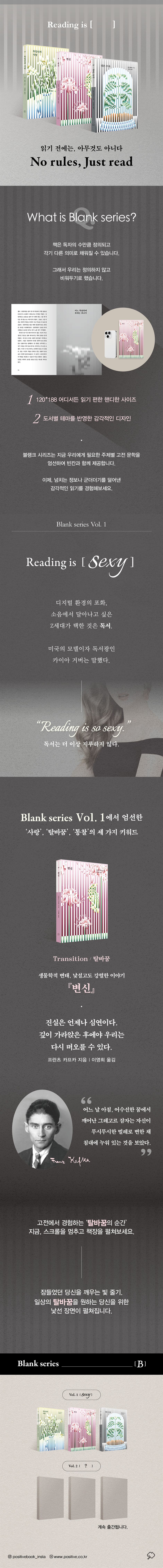 읽기 전에는, 아무것도 아니다 No rules, Just read 책과 독자 사이에 정답이나 규칙은 없다. 한 권의 책은 독자에게 각기 다른 의미로 채워지고 그 경험은 언제든 새롭게 갱신된다. 비워진 칸은 독자의 감각과 해석으로 채워지며 책은 그때마다 새로운 얼굴을 갖는다. 블랭크 시리즈는 지금 우리에게 필요한 주제별 고전 문학을 엄선하여 빈칸과 함께 제공한다. 넘치는 내용이나 정보보다 작품에 집중한 핸디하고 감각적인 구성은 독자들에게 독서의 새로운 경험을 제공할 것이다. 블랭크 시리즈 첫 번째, ‘매혹’ Reading is [ sexy ] 디지털 환경의 포화, 소음에서 달아나고 싶은 Z세대가 택한 것은 독서. 미국의 모델이자 독서광인 카이아 거버는 말했다. “Reading is so sexy.” 독서는 더 이상 지루하지 않다. 독서는 자신을 발견하고 내면의 풍요로움을 채우는 특별한 도구로 자리 잡고 있다. ‘사랑’, ‘탈바꿈’, ‘통찰’이라는 세 가지 키워드를 중심으로, 좋은생각이 엄선한 고전 문학 3선은 『독일인의 사랑』, 『변신』, 그리고 『검은 수사』. 이 작품들은 각기 다른 주제와 감각으로 독자들에게 깊은 울림과 영감을 선사한다. 책 한 권과 떠나는 여행은, 낯선 풍경 속에서 더 깊은 나를 만나는 특별한 방법이 되어줄 것이다. 스크롤을 멈추고 책장을 넘기면 보이는 것들 이번 시리즈를 접하는 독자들은 단순히 책을 읽는 것에 그치지 않는다. 각 작품이 선사하는 테마와 감정은 내면을 여행하게 하며 새로운 시각과 가치를 발견하게 만든다. 지금, 사랑, 탈바꿈, 통찰의 여정을 시작해 보라. 독서가 당신의 내면을 풍요롭게 하고, 삶의 또 다른 방향성을 제시할 것이다. |