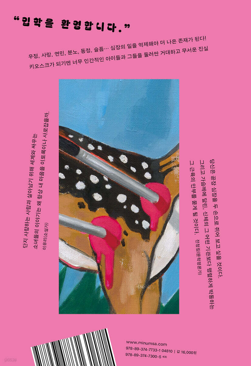 우정과 사랑, 연민과 분노, 기쁨과 슬픔. ‘키오스크 학교’가 존재하는 시대, 사람을 단숨에 울게도 웃게도 하는 심장의 일은 구세대의 잔재로 취급받은 지 오래다. 일이 잘 돌아가게 하기 위해서라면 심장의 역할을 최대한 배제해야 한다는 논리가 사실이자 진실처럼 취급받는 때, 아이들은 효율적인 존재로 거듭나기 위해 키오스크 학교에 입학하기를 원한다. 키오스크 학교가 아이들에게 요구하는 기조는 단순하다. 부디 쓸모있는 존재가 될 것. 학교는 현대 사회에 적응이 어려울 확률이 높은 지원자를 입학시키기 위함이라며 아이들에게 입학 지원서에 자신의 불행과 우울을 증명하라고 요구한다. 그 결과 갈 곳이 없는 아이, 무더위를 견디지 못한 아이, 가족으로부터 버림받은 아이들이 키오스크 학교에 모였다. 학교의 위치를 파악하지 못하도록 고글을 쓴 채 버스를 타고 학교에 도착한 아이들을, 교장 키오스크가 맞이한다. “입학을 환영합니다.” 연단에서 교장 키오스크의 목소리가 어마어마한 성량으로 들려온다. 기이한 직업 훈련 키오스크 학교의 아이들은 배정받은 반에서 직업 훈련을 받는다. 이때 훈련이란 꿈이나 장래희망과는 관련이 없다. 학교에서 학생이 제출한 입학 원서를 바탕으로 해당 직업에 자질이 있다고 판단한 결과에 따라 직업 배정이 이루어진다. 키오스크 학교가 숱한 괴소문을 몰고 다니듯, 직업 훈련에도 이상한 점이 한둘이 아니다. 보건실에서 약을 분류하는 일의 무료함, 강당에 집합하여 엎드리기?기어다니기?일어나기를 명령받고 행하는 일의 모욕감, 인간과 꼭 닮은 모습의 미니 로봇을 무작정 해치면 그만이라는 일의 무자비함. 아이들은 기이한 직업 훈련으로부터 배우는 게 있으리라고 믿고 싶어 하다가, 이 일을 통해 배우는 게 과연 있기나 한 것인지 분노하다가, 이내 학교의 의도는 그저 굴종임을 깨닫기에 이른다. 입학만 하면 환한 미래가 보장된 것처럼 굴던 학교가 정작 학생들에게 가르치는 것은 굴종일 때, 갈 곳 없던 아이들은 다시 한번 목적지를 잃어버린다. 그 허망한 눈빛들이 전혀 낯설지 않은 것은 왜일까. 서로가 서로를 바라보는 눈 키오스크 학교에는 어디에나 감시의 눈이 도사리고 있다. 학교 부지를 빈틈없이 감싼 철조망, 양쪽으로 숲과 절벽을 면한 고립된 위치, 학교 안 어디에나 존재하는 감시인의 차가운 은빛 피부는 학교의 가르침이나 명령에 불복종하는 즉시 엄청난 불이익이 따르리라는 공포를 심어 주기에 충분하다. 숨 막히는 환경이 주는 공포심을 견디다 못한 아이들이 희생되는 일이 벌어져도 학교는 학생의 흔적을 없애는 일에 열중할 뿐이다. 질문은 용납되지 않으며 그 안에서 아이들은 점점 없는 존재가 되어 간다. 아이들에게 드리워진 것은 사랑과 보호의 시선이 아닌 감시와 처벌의 시선이 전부이지만, 이때 아이들은 서로가 서로를 지킨다. 감시자의 눈을 피해 우정과 사랑이 어린 눈으로 친구를 바라보며 서로의 안위를 살핀다. 입학 전 함께 숲속 벙커 생활을 하며 언제나 함께할 것을 다짐했던 모라와 초희, 병원에서 처음 만나 푹푹 찌는 집에서 더위를 견디다 못해 함께 학교에 입학한 원혜와 주디. 이 소녀들이 보여 주는 우정은 다름 아닌 심장이 하는 일이다. 『키오스크 학교』는 그 슬프고도 자명한 진실을 소녀들의 모험을 통해 보여 주고 있다. |