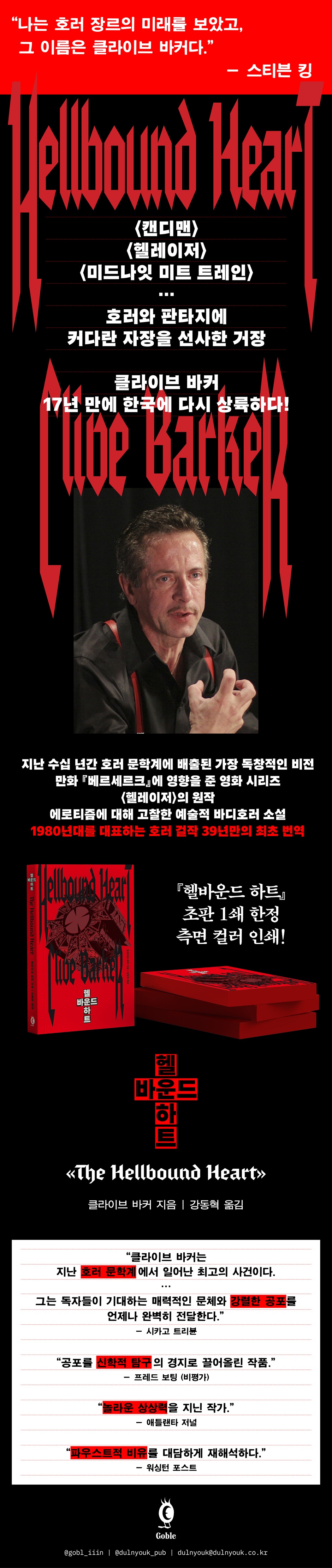 만화 『베르세르크』에 영향을 준 영화 시리즈 〈헬레이저〉의 원작 에로티즘에 대해 고찰한 예술적 바디호러 소설 1980년대를 대표하는 호러 걸작, 39년만의 최초 번역! 인간이 경험하지 못한 쾌락의 영역에 도달할 수 있게 해준다는 전설 속 ‘르마샹의 상자’. 프랭크 코튼은 이 르마샹의 상자를 오랜 기간 추적한 끝에 손에 넣는다, 마침내 상자를 연 프랭크 앞에 나타난 그 누구보다 기괴한 존재, 지옥의 수도사 ‘세노바이트’. 프랭크는 세노바이트에게 끝없는 쾌락을 경험할 수 있는 계약을 맺고, 전에 경험한 적 세계로 소환되는데… 프랭크는 그 세계의 고통스럽고 끔찍한 풍경을 보며, 자신이 잘못된 계약을 맺었다고 깨닫는다. 몇 년 뒤, 프랭크가 실종된 주택인 로도비코 스트리트 55번지에 그의 동생 로리 코튼과 부인 줄리아가 이사를 온다. 그리고 줄리아는 프랭크가 사라진 어둡고 축축한 방에서 기이한 기운을 감지하는데…. 소설 『헬바운드 하트』는 1980년대 공포 문화계에 엄청난 영향력을 남긴 프랜차이즈 〈헬레이저〉의 원작이다. 이 세계관 속 아이콘인 핀헤드(클라이브 바커는 이 명칭을 싫어해서 추후 ‘헬 프리스트(Hell Priest)’라는 이름을 붙여준다.)는 캔디맨과 더불어 클라이브 바커가 창조한 가장 유명한 캐릭터에 속할 것이다. 그것도 영화상의 캔디맨이 원작 소설과는 면면이 꽤나 다르다는 점을 감안하면, 핀헤드는 클라이브 바커가 직접 창조한 캐릭터 중 가장 유명할 것이다. 『헬바운드 하트』는 유명세만 높을 뿐 아니라 고전적인 모티프를 가져와 재해석하여 또다시 원류로서 가치를 인정받고 있다. ‘파우스트의 계약’이라는 원형적인 이야기를, 80년대 신자유주의적 쾌락과 욕망이 넘쳐나는 시대에 걸맞은 형태로 재창조하기도 했으며, 소설 속 프랭크 코튼과 줄리아의 기이한 관계는 ‘미녀와 야수’를 스플래터 호러 장르에 걸맞게 해석했다. (이는 언데드와 인간의 금지된 사랑을 다루는 다른 모든 작품에도 영향을 끼쳤다.) 그리고 무엇보다 전통적인 악마의 형상이 아닌, 인간의 상상 너머의 쾌락을 추구하는 핀헤드와 그의 동료 수도사(세노바이트)의 모습들은 유명 만화 〈베르세르크〉에 영향을 미쳤다는 건 주지의 사실이다. 『헬바운드 하트』는 인간의 마음과 그 끝없는 영역 안에 있는 거대한 공포와 황홀경을 다룬 소설이기도 하다. 모든 호러 소설은 인간의 욕망을 깊이 있게 직시하는데, 이 소설은 그중에서도 가장 눈에 띄는 통찰력을 자랑한다. 이 작품은 탐욕과 사랑, 사랑 없는 관계 속의 절망, 욕망과 죽음, 삶과 속박에 대해서 탐구한다. 등장인물 프랭크, 줄리아, 로리, 커스티는 상징계라는 질서 속에서 살아가는 인간들의 욕망을 다룬다는 점에서도 깊이 고민할만한 단서를 제공한다. 뒤틀린 욕망과 폭력을 지닌 프랭크와 그 누구보다 사회적인 모범상으로서의 남성의 모습을 재현하는 로리는 무엇을 상징하는가? 또한 평생 주어진 이상적인 여성의 모습을 수행해야만 했던 줄리아의 일탈적 욕망. 커스티의 인정에 대한 갈망, 그리고 마치 지금의 세계에서 금지하는 것들의 총집합으로 보이는 세노바이트들에 대해 고민하다보면, 우리 사회 질서의 금기가 어떻게 또 다른 욕망을 불러일으키는지, 그러한 욕망이 얽히고 뒤섞여 어떤 비극을 만들어내는지를 깊이 있게 통찰할 수 있을 것이다. |