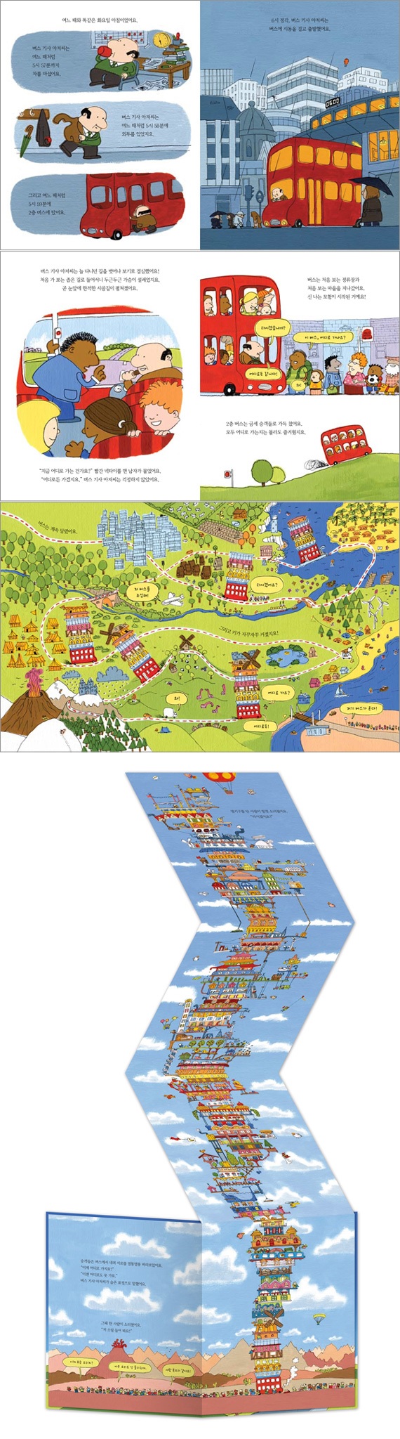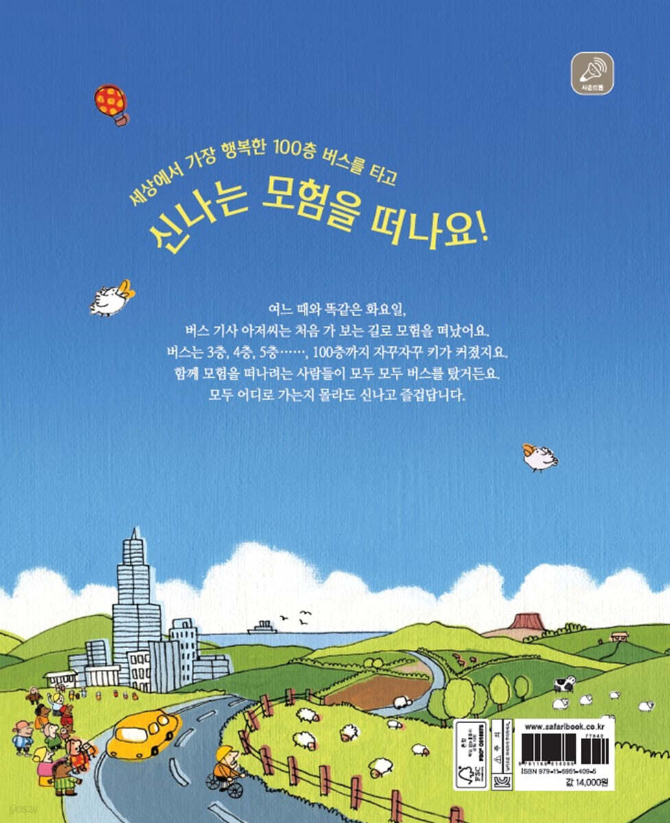그 속에 담긴 성장과 통합의 의미! 책을 읽고 가만히 생각해 보면 ‘세상에서 가장 행복한 100층 버스의 모험’은 우리 아이의 ‘성장’과 닮았다. 아이들이 커 가는 동안 빨간 버스처럼 길이 막히거나 차가 고장 나 더는 앞으로 나아가지 못하는 상황에 맞닥뜨릴 수도 있기 때문이다. 빨간 버스에서 일어나는 사건은 아이가 자라며 겪는 수많은 경험이며, 버스에 탄 사람들은 아이가 만나게 될 수많은 사람들이라고 할 수 있다. 또한 100층은 아이가 갖게 되는 풍부한 지식에 비견할 수 있다. 따라서 아이들은 책을 읽으면서 100층까지 키가 커지는 버스처럼 자신도 다양한 경험과 지식 그리고 만나는 다양한 사람들을 통해 쑥쑥 성장하는 모습을 자연스레 상상하게 된다. 그리고 버스에 탄 모든 사람들이 힘을 모아 버스 층을 높이고 함께 즐겁게 지내는 모습에서 여러 사람의 힘과 생각을 모으면 무엇이든 거뜬히 이겨 낼 수 있다는 것을 깨닫게 될 것이다. 다른 사람들과 ‘함께하는 삶’이 더욱 즐겁다는 것을…! 톡톡 튀는 상상력과 아기자기한 그림이 어우러진 유쾌한 그림책! 《세상에서 가장 행복한 100층 버스》는 평범한 2층 버스가 처음 보는 정류장과 처음 보는 마을들을 지나며 3층이 되고, 4층이 되고, 결국에는 100층까지 키가 커진다는 상상력으로 이야기를 이끌어 간다. 생각치도 못한 기발한 방법으로 장애물을 뛰어 넘는 재치도 담겨 있어 더욱 흥미롭다. 무엇보다 펼치고 또 펼쳐서 자꾸자꾸 길어지는 폴더 구성으로 100층이라는 높이를 흥미진진하고 생생하게 표현하여 자유와 꿈의 실현을 극대화했다. 기다란 폴더 페이지에 그려진 100층 버스를 들여다 보면 다양하고 독특한 집들과 정원, 풍차, 수영장, 놀이 공원, 목장, 심지어는 축구장까지 있는 것을 발견할 수 있다. 폴더 페이지를 한 번, 두 번, 계속해서 펼치면서 그림 속에 숨어있는 아기자기한 요소들을 찾아 보는 재미를 느낄 수 있다. 100은 액면 그대로 숫자 100을 뜻하기도 하고 ‘아주 많음’을 의미하기도 한다. 아이들은 길고 긴 100층 버스에 탄 다양한 사람들의 모습에서 ‘아주 많고 다양한 행복’을 발견할 수 있다. 또한 ‘내가 100층 버스를 타게 된다면 무엇을 만들까?’ 하고 상상해 보는 즐거움도 느낄 것이다. |