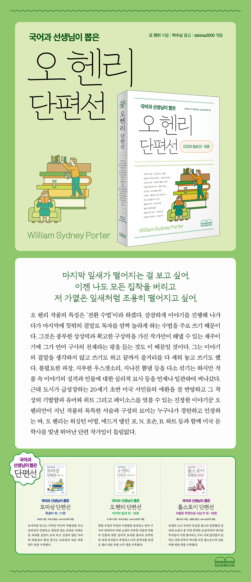 마지막 잎새 - 11 크리스마스 선물 - 22 20년 후 - 32 식단에 찾아온 봄 - 38 되찾은 양심 - 48 떡갈나무 숲의 왕자님 - 61 경관과 찬송가 - 77 천 달러 - 88 잘 손질된 램프 - 99 황금의 신(神)과 사랑의 신 - 122 추수 감사절의 두 신사 - 134 할렘의 비극 - 143 마녀의 빵 - 154 시계추 - 161 녹색의 문 - 169 인생은 연극이다 - 182 붉은 추장의 몸값 - 194 벽돌 가루 거리 - 213 시인과 농부 - 228 백작과 결혼식 하객 - 238 연보 - 250 |