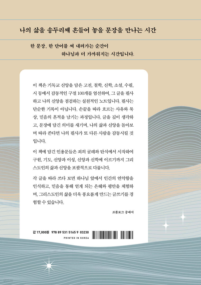 식욕은 사라졌고, 밤잠을 이루지 못했다. 일할 기회조차 놓쳐 버린 채, 공포와 불안 속에서 하루하루를 보냈다. … 인간은 죄를 저지르지 않을 것처럼 보이지만, 결국 죄를 범하는 존재다. 인간은 정결하게 될 의무와 힘을 가지고 있지만, 그것을 이루지 못한다. 천사가 될 자격을 가진 존재임에도 불구하고, 끊임없이 금수로 하락하며, 올라가면 천상의 사람이 될 수 있지만 내려가면 지옥의 아귀가 된다. 인간은 무한한 영광과 무한한 추락, 양극단에 도달할 가능성을 함께 지닌 존재다. 지구가 절정과 절하의 극단을 품고 있는 것처럼, 인간도 그 사이에서 머무는 존재다. * 우치무라 간조, 『구안록』, 제1부 ● 19세기 말 일본의 대표적 사상가 우치무라 간조(?村鑑三, Uchimura Kanz?, 1861-1930)의 1893년 저서 『구안록』(求安錄)은 일종의 신앙고백록이다. 그는 당시 유행하던 독일의 합리주의와 자유주의 신학을 비판하며 하나님의 초월성을 강조하였다. 그리스도의 신성과 인간의 원죄를 부정하고 속죄론을 거부하는 신학과 신앙에 정면으로 맞서, 예수 그리스도를 통한 죄 사함과 구원의 진리를 체험적 신앙으로 설명한다. 인간은 죄를 짓지 말아야 하나 결국 죄를 짓는 존재이며, 무한한 영광과 깊은 타락 사이를 오가는 절망적인 존재다. 로마서 7장에 담긴 바울의 고민, 그리고 인간이 죄로부터 자유로울 수 있는 유일한 길은 오직 예수 그리스도뿐임을 손끝으로 새겨 보자. --- p.14 「1. 나에게는 소망이 없구나」 중에서 나는 평안을 얻는 길을 알게 되었다. 그러나 길을 안다는 것이 반드시 그 길에 들어선다는 것을 의미하지는 않는다. 그리스도에 대한 신앙은 나를 죄에서 구하는 것이다. 그러나 신앙도 또한 하나님의 선물이다. 나는 믿음으로 구원을 얻을 뿐 아니라 또한 믿게 되어서 구원을 받은 것이다. 이에 이르러 나는 전혀 자신을 구할 힘이 없는 자임을 깨닫게 되었다. 나는 내 ‘믿음’마저도 하나님께 구해야 한다. 그러므로 내가 할 수 있는 것은 오직 기도뿐이다. * 우치무라 간조, 『구안록』, 제2부 ● 인간은 누구나 의미와 평안을 갈망한다. 일본의 사상가 우치무라 간조(內村鑑三, 1861~1930)가 겪었던 내적 고통은 현대를 살아가는 많은 이들과 닮아 있다. 그는 학문과 자연, 윤리와 사역, 가정과 쾌락이라는 인생의 여러 길을 탐색했지만, 마음의 평안은 어디서도 발견되지 않았다. 모든 길은 결국 죄의 문제 앞에서 무력했고, 그는 “우리는 하나님을 만날 때 비로소 참된 안식을 얻는다”고 고백하게 된다. 이렇듯 인간은 자신의 노력이나 결단만으로는 참된 평안을 얻을 수 없다. 하나님과의 만남, 곧 믿음은 전적인 하나님의 은혜로 주어지는 선물이다. 믿음의 여정에서 내가 걸어온 길을 돌아보면, 언제나 하나님의 인도하심과 은총이 있었다. 내가 깨달음을 얻은 순간, 변화된 삶을 살게 된 동기, 그 모든 전환점에는 하나님의 손길이 있었다. 사도 바울의 “내가 나 된 것은 하나님의 은혜”(고전 15:10)라는 고백 속에서 구원은 하나님의 선물임을 감사하며 글을 써 보자. --- p.40 「13. 하나님을 만날 때 비로소 얻게 되는 것들」 중에서 제120문: 그리스도께서는 왜 하나님을 “우리 아버지”로 부르라고 명령하셨습니까? 답: 우리가 기도를 시작하는 순간부터, 그리스도께서는 우리 기도의 본질적인 요소를 깨닫도록 일깨워 주십니다. 즉 그리스도를 통해 하나님께서 우리의 아버지가 되셨다는 사실을 어린아이처럼 믿고 경외하도록 가르치신 것입니다. 육신의 아버지가 세상의 것들에 대한 자녀들의 요청을 거부하지 않는 것 이상으로, 하나님 아버지께서는 우리가 믿음으로 구하는 것을 결코 거부하지 않으십니다. * 하이델베르크 요리문답, 제120문과 답 ● 하이델베르크 요리문답 제120문은 주기도문에 대한 문답이다. 이 문답에서는 기도할 때 하나님을 아버지로 고백하며 자녀 된 자격으로 기도하라고 한다. 우리가 기도를 시작하는 순간부터 그리스도께서는 우리 기도의 본질적인 요소를 깨닫도록 일깨워 주신다. 즉 그리스도를 통해 하나님이 우리의 아버지가 되셨다는 사실을 어린아이처럼 믿고 경외하도록 가르치신다. 육신의 아버지가 필요한 것들을 구하는 자녀들의 요청을 거부하지 않는 것 이상으로, 하나님 아버지는 우리가 믿음으로 구하는 것을 결코 거부하지 않으신다. 하나님이 나의 아버지 되심을 고백하며 자녀의 마음으로 기도문을 써 보자. --- p.78 「28. 하나님은 나의 아버지이시다」 중에서 스스로 마음이 평화로운 사람은 다른 이들과도 평화롭게 지낼 수 있습니다. 그러나 자신의 내면에 평화를 이루지 못한 사람은 타인과도 평화를 이루기 어렵습니다. 이러한 사람들은 다른 이들에게 괴로움을 주며, 결국 자신에게 더욱 큰 고통을 안기게 됩니다. 반면, 마음에 평화를 지닌 사람은 타인에게도 평화를 나누어 주고자 노력할 것입니다. * 토마스 아 켐피스, 『그리스도를 본받아』, 제2권 ● 토마스 아 켐피스는 네덜란드 아그네텐베르크 수도원(Agnetenberg Monastery)에서 대부분의 삶을 보내며, 공동생활의 형제회(Brethren of the Common Life)의 일원으로서 경건한 삶을 실천했다. 수도원의 작은 골