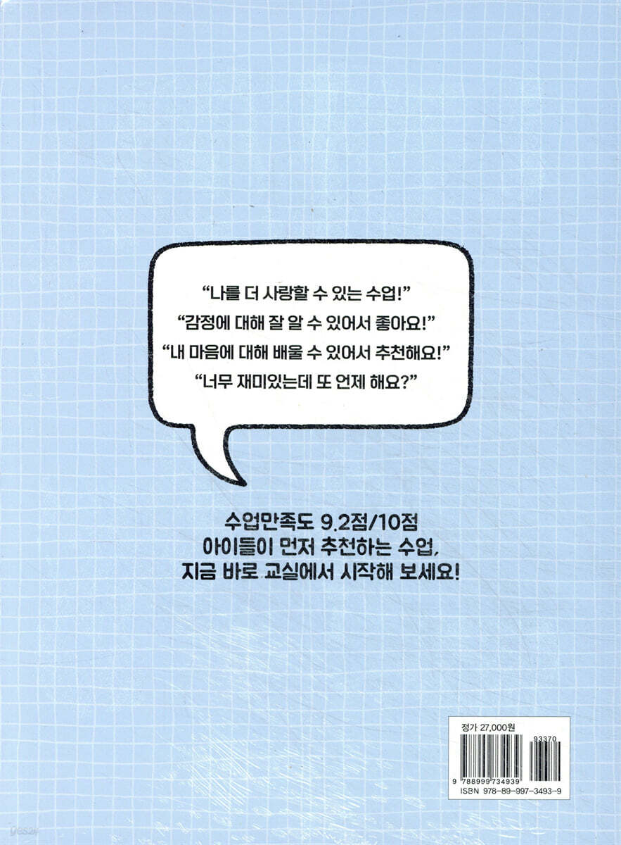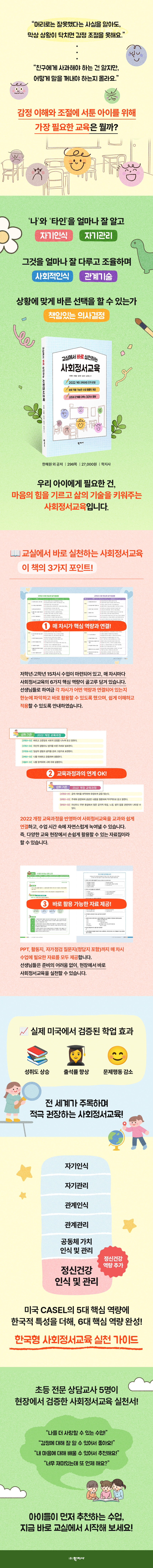프롤로그. 교실에서 만나는 사회정서교육의 모든 것 제1부 저학년 1. 내 마음을 이해하고 표현해요 2. 내 마음을 조절하고 돌봐요 3. 더 나은 나로 성장해요 4. 함께라서 더 좋아요 5. 공감하고 대화해요 6. 갈등을 해결해요 제2부 고학년 1. 내 마음을 이해하고 표현해요 2. 내 마음을 조절하고 돌봐요 3. 더 나은 나로 성장해요 4. 함께라서 더 좋아요 5. 공감하고 대화해요 6. 갈등을 해결해요 부록 1 사회정서역량을 키우는 교사의 언어 부록 2 교실 속 작은 갈등을 해결하는 미니 활동지 부록 3 사회정서교육 프로그램, 이렇게 효과가 나타났어요! 참고문헌 |