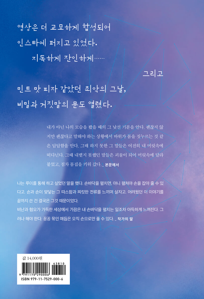 --- p.9 나드림과 강루이라니. 마치 민트 맛 피자를 받아 든 것처럼 아이들이 묘한 표정을 지었다. 하리가 얼굴을 찌푸린 채 중얼거리는 게 보였다. 하지만 차마 선생님 앞에서 ‘저 강루이랑 같은 조 하기 싫은데요?’라고 말할 용기는 없는 것 같았다. --- p.22 ‘너 같은 애’라는 표현으로 차현우가 지칭한 동화의 특징을 말해 보자면, 일단 덩치가 크다. 우리 반에서 제일 크다. 곰돌이 푸 같다. 눈이 조금 작은데, 웃을 때 눈에 주름지는 게 브이를 닮았다고 누군가 장난치듯 말했다가 브이를 뻥튀기 기계로 튀겨 놔도 동화보다 브이가 낫다며 차현우는 그때도 빈정거렸다. --- p.28 누군가를 안다는 건, 이런 거다. 간섭하게 되고 판단하게 된다. 그래서 누군가를 잘 알게 되는 게 싫다. 나에 대해 안다고 떠들어 대는 것도 싫고. ‘네가 그럴 줄은 몰랐어. 어떻게 그럴 수 있어?’라는 말도 다시는 하고 싶지 않다. 내 속에 있는 걸 조금도 들키고 싶지 않다. 그랬으면서 난 동화에 대해 다 아는 것처럼 굴었다. 나야말로 구리다. 찌질하다. --- p.52 내가 아닌 나의 모습을 봤을 때의 그 낯선 기분을 안다. 괜찮지 않지만 괜찮다고 말해야 하는 상황에서 바위가 몸을 짓누르는 것 같은 답답함을 안다. 그때 하지 못한 그 말들은 여전히 내 머릿속에 떠다닌다. 그때 내뱉지 못했던 말들은 괴물이 되어 머릿속에 달라붙었고, 점차 몸집을 키워 갔다. --- p.65 생각할수록 가슴이 답답하고 화가 났다. 수없이 나에게 물었던 질문이 다시금 떠올랐다. 만약 그때로 다시 돌아간다면 난 어떻게 하고 싶을까. “우리 범인 잡자.” --- p.75 나는 루이를 통해 하고 싶었던 말을 했다. 손바닥을 펼치면, 아니 펼쳐야 손을 잡아 줄 수 있다고. 손과 손이 맞닿는 그 따스함과 찌릿한 전류를 느끼며 살자고. 어려웠던 이 이야기를 끝까지 쓴 건 결국은 그것 때문이었다. 비난과 혐오가 가득한 세상에서 가끔은 내 손바닥을 펼치는 일조차 아득하게 느껴진다. 그러나 해야 한다. 꽁꽁 묶인 매듭은 오직 손으로만 풀 수 있다. --- 본문「작가의 말」중에서 |
