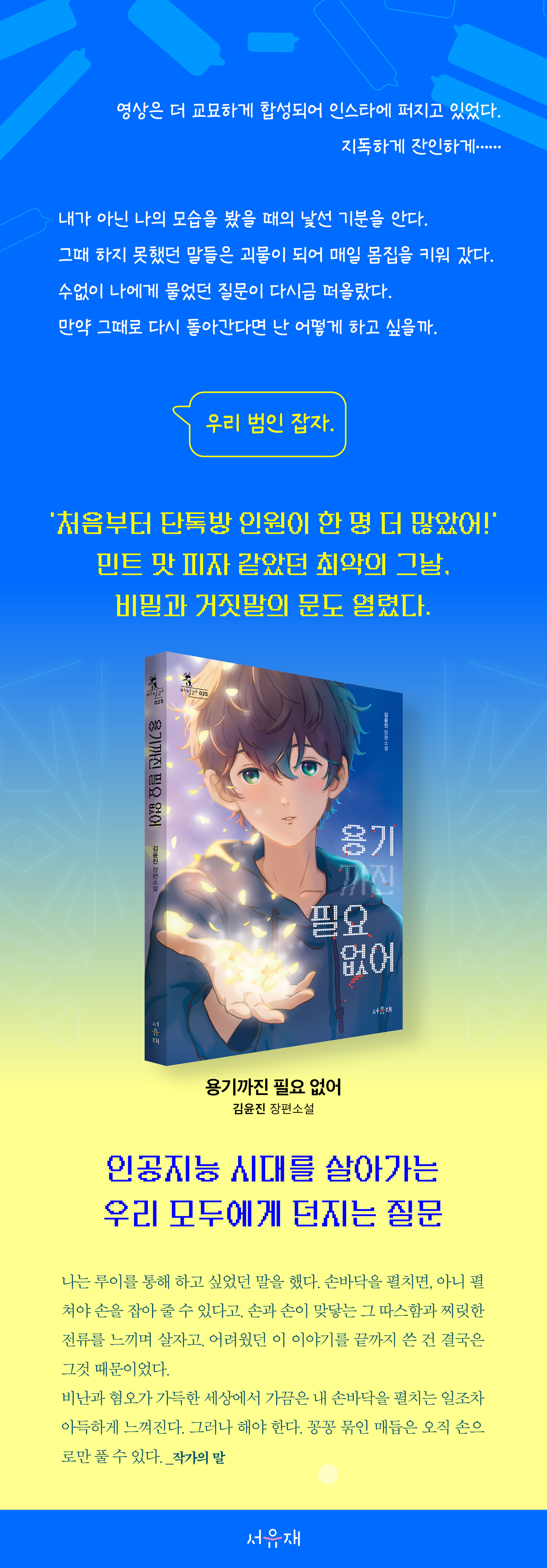 민트 맛 피자 같았던 최악의 그날, 비밀과 거짓말의 문도 열렸다 『용기까진 필요 없어』의 주인공 강루이는 딥페이크로 인해 상처받고 누구에게도 마음을 열지 못한 채 살아가고 있다. 반 단톡방에 페이스앱을 활용하여 가공한 사진들이 유행처럼 올라올 때 자신도 모르게 “괴물 같은 사진들 좀 그만 올리라”며 급발진했던 것도 그 트라우마 때문이었다. 이로 인해 가뜩이나 묻는 말에 대답도 잘 하지 않는 루이에 대한 친구들의 반감은 더 골이 깊어진다. 그러던 중 조별 수행평가 과제로 찍은 동화의 춤 영상이 반 단톡방에 실수로 공유된다. 이 영상은 누군가의 의해 처음에는 인기 아이돌 가수의 몸으로 합성되었다가 그다음에는 돼지의 몸으로 변형되어 SNS를 통해 학교 밖으로 퍼져 나간다. 그리고 끊임없이 더 교묘하게 합성되어 지독하고 잔인한 조롱으로 동화를 괴롭힌다. 상처받은 동화를 지켜보며 강루이는 이번에야말로 도망가서는 안 되겠다고 결심한다. 그리고 결코 물러설 수 없는 이 싸움은 동화를 위한 것인 동시에, 강루이 자신을 위한 것임을 깨닫는다. 수행평가 조원들인 나드림, 유미소, 장하리도 강루이와 함께하기로 하면서 조금씩 사건의 실마리를 찾아 나간다. 그러는 동안 강루이는 아무에게도 드러내지 못한 채 오래 묻어 두었던 혼자만의 비밀을 용기 내어 꺼내 놓기로 결심한다. 인공지능 시대를 살아가는 우리 모두에게 던지는 질문 인공지능이 일상적으로 활용되기 시작하면서 디지털 범죄 또한 나날이 증가하고 있다. 미국에서는 14살 소년이 챗봇과의 대화 후 자살하는 사건이 일어났고 부모는 “취약한 미성년자를 표적으로 허구와 현실의 경계를 모호하게 만들기 위해 의도적으로 의인화된 특성을 가진 생성형 AI 시스템을 설계하고 개발하여 부모의 통제를 벗어나게 함으로써 정신적 고통을 가했다”면서 개발사에 소송을 제기하기도 하였다. 어린이청소년의 AI기술 활용이 일으키는 문제는 이미 전 세계적으로 사회적 이슈가 되고 있다. 그중 특히 딥페이크 범죄의 경우 피의자 다섯 명 중 네 명이 십 대라는 통계가 있을 만큼 심각하고 무엇보다 성범죄에 악용되는 경우가 많다는 점에서 문제적이다. 이 작품의 딥페이크 에피소드는 어쩌면 보기에 따라 가벼운 장난쯤으로 넘길 수 있을지도 모르겠다. 그러나 딥페이크 합성물이 좋은 의도를 갖고 만든 거라면 괜찮을까? 과연 타인의 동의 없는 행위는 어디까지 허락할 수 있고, 어디부터 안 되는 것일까? 작가는 말한다. 딥페이크 영상 뒤에 그 영상을 만든 사람이 있듯, 그 영상으로 인해 상처받고 고통 받는 건 결국 우리 곁에 함께 있는 사람들이라는 걸 생각하자고. 하여 주인공 루이와 그의 친구들의 깨달음은 작가가 독자에게 전하고 싶은 메시지이기도 하다. 비난과 혐오가 가득한 세상에서 가끔은 손바닥을 펼치는 일조차 아득하게 느껴질 수 있지만 그럼에도 꼭 쥔 주먹을 펼쳐 내밀어야 한다고, 꽁꽁 묶인 매듭은 오로지 손으로만 풀 수 있다고 말이다. |