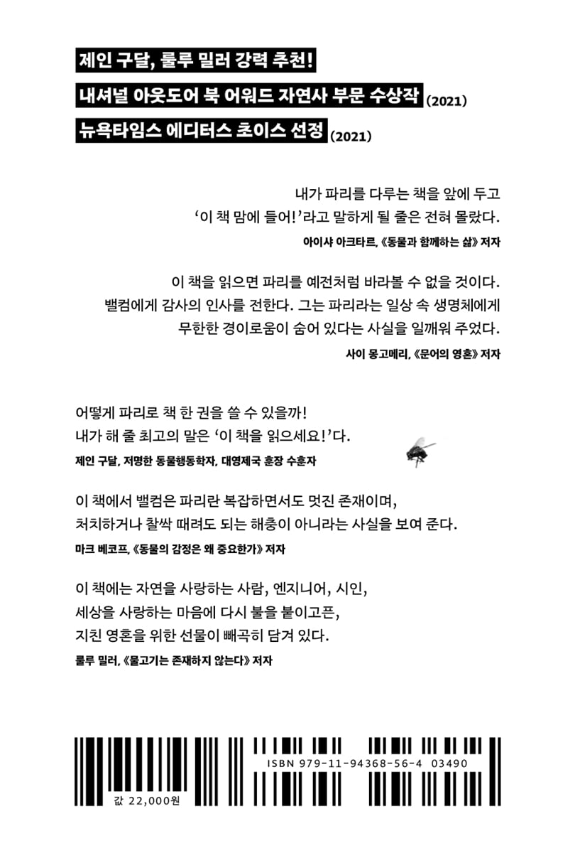 이 책을 읽으면 파리를 예전처럼 바라볼 수 없을 것이다. 밸컴에게 감사의 인사를 전한다. 그는 파리라는 일상 속 평범한 생명체에게 무한한 경이로움이 숨어 있다는 사실을 일깨워 주었다. - 사이 몽고메리 (동물학자, 『문어의 영혼』 저자)