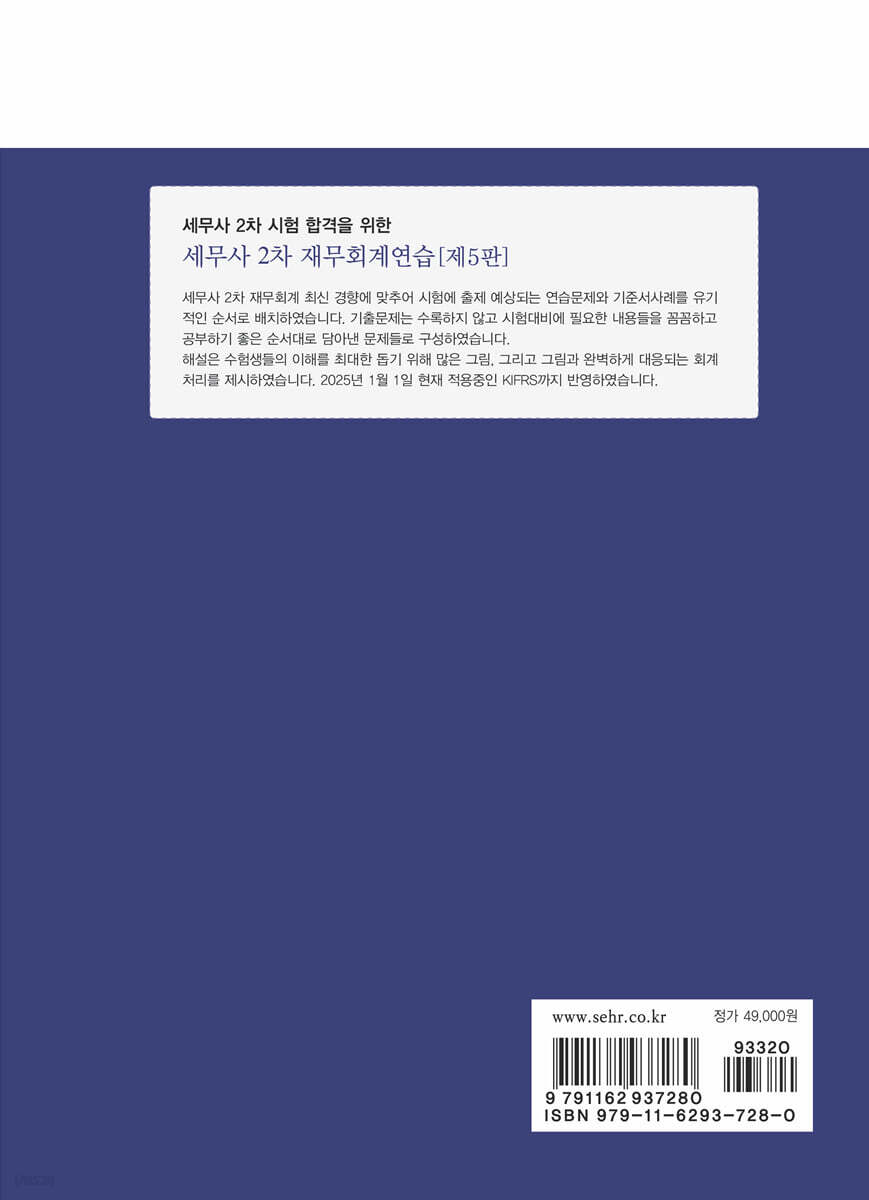 본서는 세무사 2차 시험을 대비하기 위한 교재입니다. 이 교재는 회계학 1부 중 재무회계 부분을 다룹니다. 2025년 1월 1일 현재 적용 중인 KIFRS까지 반영되어 있으며 이 교재의 특징은 다음과 같습니다. (1) 최대한 많은 기준서 사례 수록 세무사 시험에 출제 예상되는 기준서 사례를 최대한 많이 수록하였습니다. 동차를 준비하는 입장에서는 기준서 사례보다는 기본적인 문제에 좀 더 집중을 해야 하고 유예생은 기준서 사례까지 꼼꼼하게 보셔야 합니다. (2) 기출문제 없음 기존의 2차 연습서는 기출문제에 출제예상문제들을 추가하는 형식입니다. 이러한 교재는 기출문제와 출제예상문제를 한 권으로 정리할 수 있다는 장점이 있지만, 2차에 필요한 내용들을 유기적인 순서대로 공부하는 것이 불가능합니다. 저는 단권화보다는 유기적인 순서를 택했습니다. 그리하여 이 책에는 기출문제는 하나도 포함되어 있지 않습니다. 대신 2차에 필요한 내용들을 꼼꼼하고 공부하기 좋은 순서대로 담아낸 문제들로만 구성되었습니다. 물론 시험대비에 있어 기출문제도 매우 중요합니다. 따라서 세무사 2차 수험생에게 최근 5개년 회계사, 세무사 2차 기출문제 해설강의를 추가로 제공합니다. 이 연습서로 기본기를 탄탄히 다지고 기출문제를 모의고사처럼 활용하면 최선의 시험대비가 될 것입니다. (3) 그림과 회계처리의 완벽한 조화 1차 교재의 장점이 그대로 남아 있습니다. 최대한 많은 그림, 그리고 그림과 완벽하게 대응되는 회계처리를 제시함으로써 여러분들의 이해를 최대한 도울 것입니다. (4) 문제난이도 구분 교재에 수록된 문제의 난이도를 동차/유예/초고득점으로 구분하였습니다. 동차생은 동차 문제까지, 유예생은 유예문제까지 공부하기를 권장합니다. 회계사 2차시험 수준으로 어렵게 나오는 경우까지 대비하고자 한다면 초고난이도문제까지 풀어봐야 합니다. 다만, 그러한 경우까지 대비하고자 한다면 세무회계/세법학/원가관리회계에 대한 공부가 이미 마무리 된 상태여야 합니다. 다른 과목에 대한 준비가 부족한 상태에서 재무회계 초고난이도 대비를 하는 것은 가장 안좋은 공부전략입니다. 공부하다가 궁금한 점이 있으면 학원 홈페이지 또는 이메일, 카페로 질문주시기 바랍니다. 정오표는 이메일로 요청주시기 바랍니다. 이메일 : yunahwang@naver.com 카페 : cafe.daum.net/yunahwang 저의 교재를 선택해 주신 수험생 여러분들께 진심으로 감사를 드립니다. 열심히 공부하셔서 좋은 결과가 있기 바랍니다. 공인회계사 황윤하 |