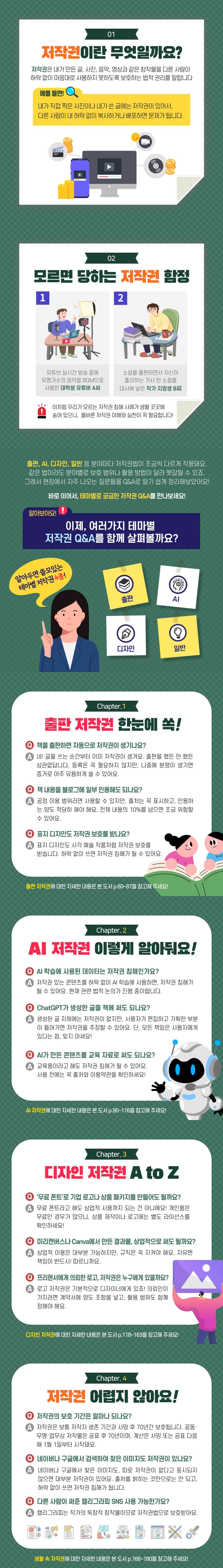 Part 01우리가 놓치기 쉬운 저작권 리스크알아두면 좋은 저작권 핵심 용어 정리 Part 02저작권 실무 가이드 일상 속 궁금증 해소 FAQQ1. 지식재산권은 어떻게 분류되나요?Q2. 누가 저작자가 될 수 있나요?Q3. 공동으로 콘텐츠를 제작한 경우 저작권은 어떻게 되나요?Q4. ‘업무상 저작물’이란 무엇이며, 저작권은 누구에게 귀속되나요?Q5. 저작권 침해 시 발생하는 주요 권리 침해 유형은 무엇인가요?Q6. 초상권과 퍼블릭시티권은 무엇이며 어떻게 다른가요?Q7. ‘부정경쟁방지법’은 어떤 상황에 적용될 수 있나요?Q8. 저작권 침해 시 민형사상 책임은 어떻게 되나요?Q9. 저작권 관련 교육은 어디서 받을 수 있나요?Q10. 강의 자료에 인터넷에서 가져온 이미지나 유튜브 영상을 사용해도 되나요?Q11. 강사가 만든 강의 자료의 저작권은 강사에게 있나요, 회사에 있나요?Q12. 강의 영상이 수강생에 의해 녹화 공유되는 경우 법적으로 대처할 수 있나요?Q13. 강사 스스로 만든 교안, 워크북, 학습자료의 저작권 등록은 가능한가요?Q14. 로열티 프리(RoyaIty-Free) 스톡 이미지 구매 시, 로고나 브랜드가 노출된 이미지를 광고에 사용해도 되나요?Q15. 공공기관 자료를 인용하거나 일부 수정해 사용하는 것도 허락이 필요한가요?Q16. 한국저작권위원회는 어떤 서비스를 제공하나요? Part 03저작권 FAQ(출판·AI·SNS분야)ㆍ출판 저작권 FAQ - 빠르게 알아보는 출판 분야 저작권 FAQ 10Q1. 저작권은 언제 발생하며, 등록 절차가 필요한가요?Q2. 저작권 보호 기간은 어떻게 되나요?Q3. 이미 저작권이 만료된 작품은 자유롭게 이용할 수 있나요?Q4. ‘판권’이라는 용어는 무엇이며 법적으로 유효한가요?Q5. 출판사가 인지(印紙)를 붙이지 않고 책을 발행할 경우 어떤 문제가 발생하나요?Q6. 구매한 전자책 파일을 타인과 공유해도 괜찮을까요?Q7. 책 내용의 일부를 블로그나 과제물에 인용하고 싶은데 어느 정도까지 허용되나요?Q8. 공공도서관에서 책을 스캔하여 보관하는 것은 저작권법상 허용되나요? 만약 스캔 자료를 온라인에 업로드하거나 공유한다면 어떻게 되나요?Q9. 책이나 콘텐츠를 번역 출판하려면 반드시 허락을 받아야 하나요?Q10. 제가 쓴 칼럼이 타인 블로그에 인용되었는데 저작권 침해인가요?Q11. 논문이나 리포트를 AI로 요약한 내용을 공유해도 되나요?Q12. 중고 서점에서 산 책을 다시 팔면 저작권 문제가 없나요?Q13. 출판사가 도서의 표지 디자인에 대한 저작권을 주장할 수 있나요?Q14. 출판사가 저작자의 원고를 편집할 때 저작인격권을 침해할 수 있나요?Q15. 출판사가 파산하면 출판권은 어떻게 되나요?Q16. 출판사가 저작자에게 지급하는 인세의 법적 성격은 무엇인가요?Q17. 출판사가 저작물의 일부만 발췌하여 출간할 수 있나요?Q18. 출판사가 저작물을 해외에 수출하려면 어떤 절차가 필요한가요?Q19. 출판사가 저작물을 광고나 홍보에 사용할 수 있나요?Q20. 번역자는 번역한 저작물에 대해 어떤 권리를 갖나요?Q21. 편집자가 원고를 편집할 때 저작권이 발생하나요?Q22. 전자책과 종이책의 저작권에 차이가 있나요?Q23. 전자책을 인쇄해서 사용해도 되나요?Q24. 웹소셜 플랫폼에 연재하는 것과 출판하는 것의 차이는 무엇인가요?Q25. 전자책을 대여 서비스로 제공할 수 있나요?Q26. 오디오북의 저작권은 어떻게 처리되나요?Q27. 전자책을 해외에 수출할 때 주의사항은 무엇인가요?Q28. 구독형 전자책 서비스의 저작권 처리는 어떻게 하나요?Q29. 전자책을 AI가 읽어주는 서비스를 제공할 수 있나요?Q30. 전자책을 클라우드에 백업해도 되나요?ㆍAI 저작권 FAQ - 빠르게 알아보는 AI 분야 저작권 FAQ 10Q1. AI가 만든 콘텐츠에도 저작권이 인정되나요?Q2. 인간이 AI를 사용하여 작품을 만들 경우 저작권은 누구에게 귀속되나요?Q3. AI로 생성한 콘텐츠를 판매해도 되나요?Q4. AI가 학습 데이터로 저작물을 사용하는 것은 합법인가요?Q5. 생성형 AI로 인한 저작권 침해를 피하기 위한 방법은 무엇인가요?Q6. AI가 다른 사람의 저작물을 학습 데이터로 사용하는 것은 합법인가요?Q7. AI로 생성한 콘텐츠를 상업적으로 판매해도 괜찮을까요?Q8. AI로 만든 캐릭터를 저작권 등록할 수 있나요?Q9. AI가 만든 이미지를 상업용 굿즈(Goods)로 써도 괜찮을까요?Q10. 외국에서 생성한 AI 콘텐츠를 국내에서 상업적으로 쓰면 문제가 될 수 있나요?Q11. AI 기반 제안서 자동생성 프로그램을 사용할 시 저작권 위험은 무엇인가요?Q12. ChatGPT나 Claude 같은 AI 서비스를 상업적으로 이용해도 되나요?Q13. AI로 생성한 이미지나 텍스트가 기존 저작물과 유사하면 저작권 침해인가요?Q14. 오픈소스 데이터셋을 AI 학습에 사용할 때 주의사항은 무엇인가요?Q15. 소셜미디어에서 수집한 데이터를 AI 학습에 사용할 수 있나요?Q16. 정부나 공공기관에서 공개한 데이터를 AI 학습에 사용해도 되나요?Q17. 학술 논문이나 연구 데이터를 AI 학습에 사용할 수 있나요?Q18. AI 학습 데이터의 출처를 공개해야 하나요?Q19. AI가 생성한 콘텐츠가 기존 저작물을 표절한 것 같으면 어떻게 해야 하나요?Q20. AI가 생성한 콘텐츠의 저작권을 등록할 수 있나요?Q21. AI가 생성한 콘텐츠로 수익을 얻을 수 있나요?Q22. AI가 생성한 콘텐츠를 NFT로 만들어도 되나