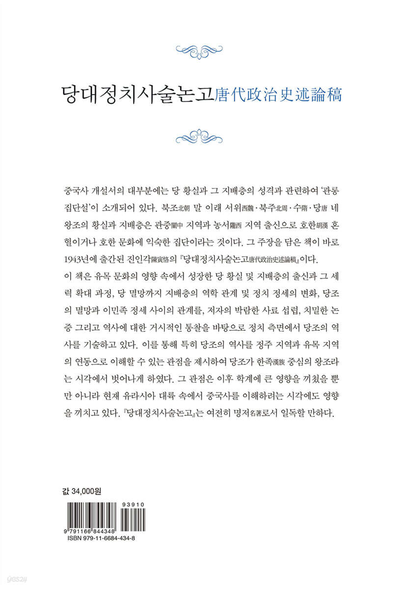 1943년 중경(重慶)의 상무인서관(商務印書館)에서 처음으로 출간된 『당대정치사술논고』는 모두 세 편의 글로 구성되어 있다. 「상편 통치계급의 씨족 및 그 부침」, 「중편 정치 혁명 및 당파 분립」, 「하편 이민족 성쇠의 연동성 및 외환(外患)과 내정(內政)의 관계」 등이다. 상편에서는 당의 초대 황제 이연(李淵) 및 당의 건국 세력은 서위 우문태(宇文泰)의 관중본위정책으로 결속된 관롱집단의 일원으로서 권세를 가지고 있었지만 무측천(武則天)이 관중본위정책을 거부하고 산동(山東)과 강남(江南) 출신의 과거 합격자를 중용함으로써 관롱집단이 결국 현종(玄宗)대에 이르러서는 와해되었다는 것을 기술하고 있다. 중편에서는 현무문(玄武門)의 변(變)의 성격, 안사(安史)의 난(亂) 이후 환관의 권력 장악, 황위 계승의 불안정, 우이당쟁(牛李黨爭)의 성격 등 당초(唐初)부터 당말(唐末)까지 벌어진 주요 정치 사건 및 권력 투쟁의 역사적 의미를 설명하고 있다. 하편에서는 주변 민족의 흥망과 당조와의 관계에 대해 당과 돌궐, 위구르, 토번, 고구려, 남조(南詔) 등 사이의 관계 변천 및 이민족 세력 사이의 연동성과 그 위협이 당조의 정치에 미친 영향을 기술하며 당의 멸망이 단지 황소(黃巢)의 난(亂) 때문이 아니라 계림(桂林) 등 서남지역의 혼란 때문이라고 하여 당의 성쇠가 주변 민족과의 관계와 연동되어 있다는 점을 지적하고 있다. 곧 이 책은 유목 문화의 영향 속에서 성장한 당 황실 및 지배층의 출신과 그 세력 확대 과정 등 당 건국의 지배층의 성격을 분석하고 이어서 당 멸망까지 지배층의 역학 관계 및 정치 정세의 변화를 추적하여 정치 측면에서 당조의 역사를 기술하고 있다. 마지막으로 당 황실 및 지배층이 이민족의 영향을 받아 등장하고 성장한 것처럼 당조의 멸망도 이민족의 관계가 주요 요인이라는 것을 지적하여 당조 내내 당조의 정치에서는 이민족과의 관계가 중요하다는 점을 강조하였다. 이를 통해 당조의 역사를 정주지역과 유목지역의 연동으로 이해할 수 있는 관점을 제시하였던 것이다. 그 논증을 위해 『구당서(舊唐書)』, 『신당서(新唐書)』 등 정사만이 아니라 『태평광기(太平廣記)』 등 필기 소설, 비명(碑銘), 돈황 출토 문서 등 다양한 사료를 박람하게 인용하고 신중하게 분석하고 있다. 이 책의 내용은 이후 당대사 연구 및 중국사에 대한 시각에 큰 영향을 끼쳤다. 우선 당조가 한족(漢族) 중심의 왕조라는 시각에서 벗어나게 하였다. 이것은 중국학계만이 아니라 우리나라 학계, 일본학계, 그리고 구미학계 모두에 영향을 끼쳤다. 그의 연구는 이후 당조가 광대한 영토를 지배한 이유를 설명하는 연구나 당조를 이른바 ‘세계제국’으로 성격 규정하는 연구 등에서 주요한 논거로 여전히 인용되고 있다. 더욱이 오늘날 중국사에 대한 새로운 연구 경향 중 하나인 유라시아 대륙 속에서 중국사를 이해하는 연구 경향에서도 그의 영향을 확인할 수 있다. 종래 중국과 그 인근 지역과의 관계를 설명할 때 주된 관점이었던 ‘동아시아세계론’ 혹은 ‘동아시아문화권’은 중국 중심적 시각이었으나 근래에는 유목지역의 역사적 위상을 강조하면서 유라시아대륙 속에서 중국사를 파악하여 중국을 상대화하는 연구 성과가 많은 관심을 끌고 있다. 정주지역과 유목지역의 연동으로 당조의 역사를 파악하려는 그의 관점이 더욱 긍정적으로 재평가되고 있는 이유이다. 이처럼 『당대정치사술논고』는 이제까지 진행된 당대사 연구뿐만 아니라 오늘날 주목받고 있는 유라시아 대륙 속에서 중국사를 이해하려는 시각에도 영향을 지속적으로 끼치고 있다는 점에서 여전히 명저(名著)로서 손색이 없다고 할 것이다. _옮긴이의 말 中에서 |