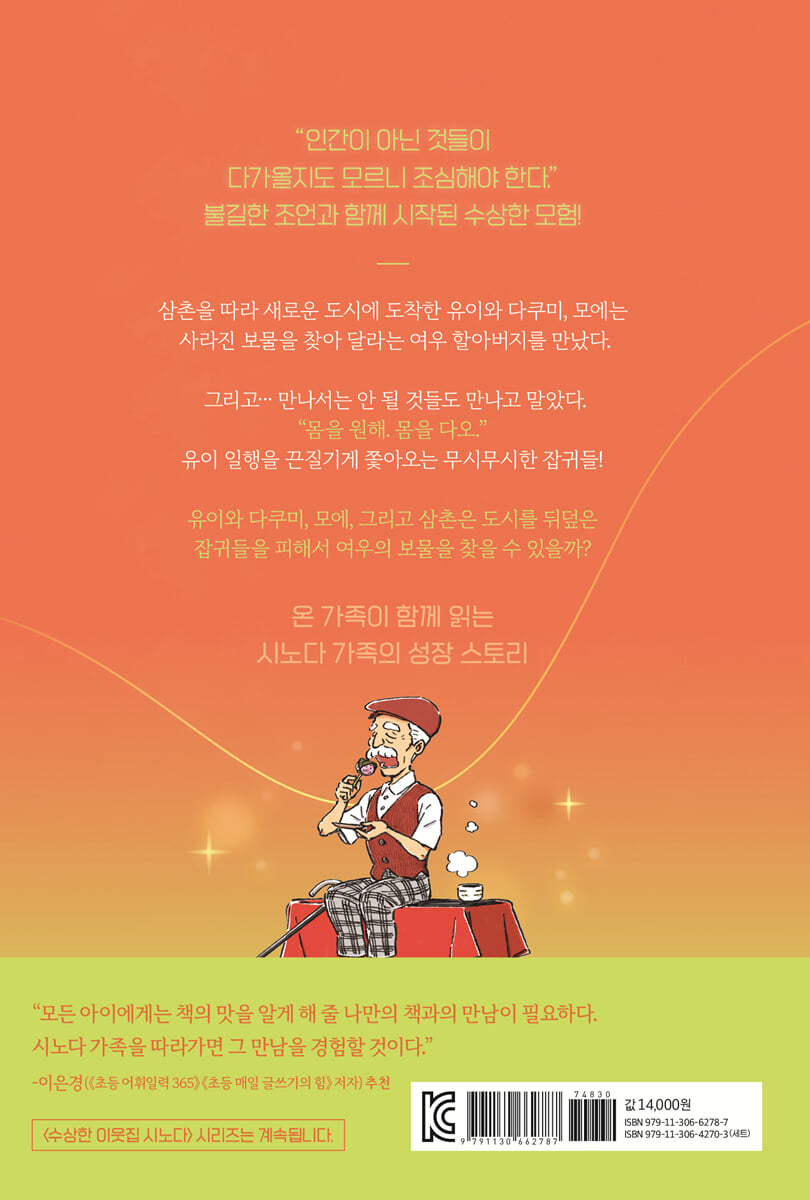 유이의 시선을 따라가면서 도무지 결말을 예측하기 어려운 전개에 점점 더 깊이 몰입할 수밖에 없었다. 책을 덮으면서는 다음 권의 출간을 기다리는 독자가 되었다. 지금까지 읽어 왔던 이야기들과는 다른 색다르고 낯선 이야기, 상상력을 자극하여 나도 모르게 빠져드는 기발한 이야기, 판타지와 현실을 자유자재로 넘나드는 이야기를 기다려 온 어린이 독자라면 나와 같은 마음일 것이다. 독서의 시작은 ‘나만의 정말 재미있는 이야기책’ 한 권이다. 모든 아이에게는 책의 맛을 알게 해 줄 나만의 책과의 만남이 필요하다. 지금껏 그림책, 학습 만화 등에 치우쳐 글맛을 알지 못했던 친구들, 영상과 게임에 익숙해져 자연스레 책을 멀리하기 시작했던 친구들도 유이네 가족에게 일어난 흥미진진한 사건을 따라가다 보면 이어질 내용이 궁금해 책장을 빨리 넘기는 경험을 하게 될 거라 확신한다. - 이은경 (《초등 어휘일력 365》 저자, 자녀교육 전문가, 전 초등학교 교사) |