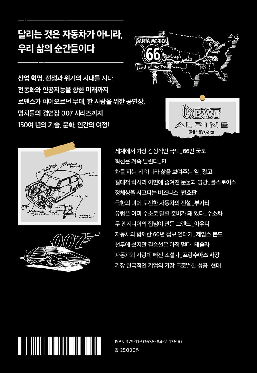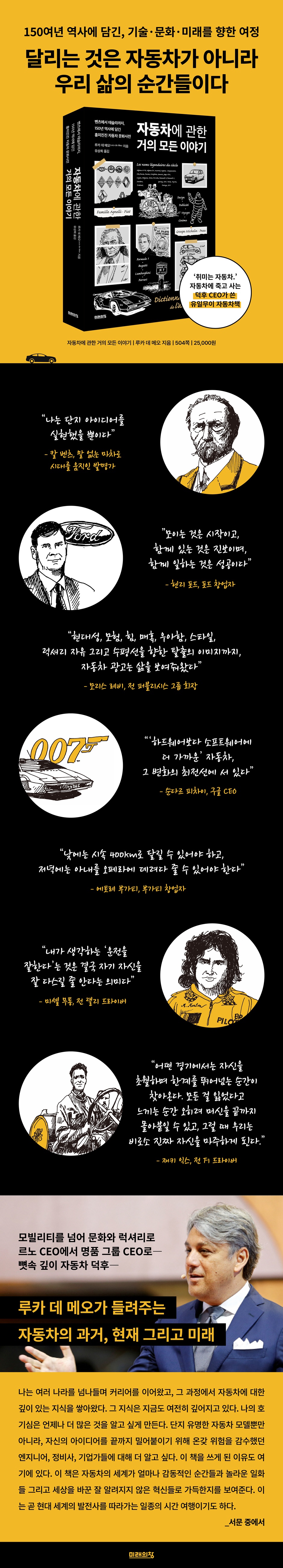 ‘나눔’, 바로 이것이 내가 이 책을 혼자 쓰지 않기로 결심한 이유다. --- p.11 눈부신 성장이 중요한 만큼, F1은 경기가 열리는 모든 지역에 긍정적인 영향을 남겨야 한다는 책임 또한 깊이 인식하고 있다. 우리가 내세우는 핵심적인 약속 중 하나는 2030년까지 넷제로 Net Zero를 달성하는 것이다. 지속 가능한 발전은 이제 모든 스포츠의 미래에서 필수적인 요소이며, 이는 우리 비즈니스의 모든 측면에서 중요한 핵심 가치다. 나는 우리가 기술 리더로서의 입지를 활용해, 단순한 자동차 경기를 넘어 사회 전체의 탄소 배출을 실질 적으로 줄이는 데 이바지할 수 있어야 한다고 믿는다. F1은 100% 지속 가능한 연료의 사용과 2026년 도입 예정인 차세대 하이브리드 엔진을 통해 사회 전반에 긍정적인 파급 효과를 일으킬 수 있다. 현재도 전 세계에는 14억 대 이상의 내연 기관 차량이 도로를 달리고 있으며, 그 수는 여전히 증가하고 있다. 우리가 개발 중인 드롭인 연료는 별도의 개조 없이 기존 내연 기관 차량에 그대로 사용할 수 있도록 설계됐다. 이 기술이 사회에 미칠 잠재적 영향은 실로 막대하다. ---p.28 람보르기니의 탄생은 믿기 어려울 만큼 테스토스테론이 넘치는 이야기에서 비롯됐다. 1960년대 초, 자존심 강하고 다혈질적인 두 이탈리아 남자가 한 판 대결을 벌였다. 한 명은 알파 로메오의 전직 레이싱 드라이버이자 매니저로, 1947년 자신의 이름을 내건 회사를 창립한 엔초 페라리. 다른 한 명은 움브리아 지방 출신의 농부였지만 운명에 순응하지 않고 1948년부터 트랙터를 만들기 시작한, 야심가 페루치오 람보르기니였다. 페루치오 람보르기니는 자동차 경주의 열혈 팬이었고, 사업에 성공해 번 돈으로 여러 대의 페라리를 구입했다. 그는 페라리의 명성과 우아함을 부러워하면서도 어딘가 경쟁심을 품고 있었다. 1960년, 자신이 소유한 페라리 차들이 자꾸 고장을 일으키자, 불만을 품은 람보르기니는 직접 항의하기 위해 마라넬로의 엔초 페라리를 찾아간다. 보통이라면, 특히 고객이 불만을 제기할 때 공급자는 정중하게 대응하는 것이 상식이다. 하지만 이번엔 달랐다. 두 사람 사이에 곧바로 언성이 오갔고, ‘일 코멘다토레(사령관)’로 불리던 페라리는 람보르기니를 면전에서 노골적으로 모욕했다. “페라리 말고 트랙터나 몰 줄 알지!”, “트랙터나 계속 만들어라, 이 촌놈아!” 이 대화를 둘러싼 여러 가지 버전이 전해지지만 요지는 하나다. 그날 람보르기니는 엄청난 굴욕감을 느꼈고, 그 감정은 곧 거대한 추진력으로 바뀌었다. 그리고 그날 밤, 그는 마음을 굳혔다. 바로 스포츠카 제조 사업에 뛰어들기로 한 것이다.. --- p.96 대부분의 소비자가 어두운 색상을 선호한다고 해서, 자동차 디자인 부서들이 과감한 색상 트렌드를 고민하지 않는 것은 아니다. 실제로 신차가 처음 공개될 때 강렬하고 개성 있는 색상으로 선보이는 경우가 많지만, 그 색을 실제로 선택하는 고객은 거의 없을 뿐이다. 그래도 괜찮다. 이런 시도는 색상 혁신을 실험하고 가능성의 지평을 넓히는 계기가 되기 때문이다. 예를 들어, 자동차 도료 분야의 선두 주자인 바스프(BASF)의 연구진은 최근 아시아 시장을 겨냥해 일렉트로닉 시트러스(Electronic Citrus)라는 형광 연두색을 제안했다. 이 색상은 성장과 기술 발전이라는 의미를 담고 있다. 반면, 유럽 시장을 위해서는 프레딕터(Predictor)라는 이름의 밝은 베이지 오렌지색을 채택했는데, 이는 인공지능이 눈부시게 발전하는 시대에도 여전히 인간적인 요소가 중요하다는 메시지를 담고 있다. 하지만 이 모든 흐름을 완전히 뒤바꿀 기술 혁신이 등장할지도 모른다. 머지않은 미래에 우리는 자동차의 색상을 단 몇 초 만에 자유롭게 바꿀 수 있게 될 것이다. 전자책 단말기로 잘 알려진 E-Ink는 2023년 라스베이거스 CES에서 이 기술을 선보였다. 당시 실험 대상은 BMW 차량이었고, 차체에는 수많은 마이크로캡슐이 포함된 특수 필름이 입혀져 있었다. 이 캡슐 안의 색소가 전기 자극에 반응해 색상을 바꾸는 구조였다. 이것이 진정한 진보일까? 어쩌면 머지않아 우리는 매일 아침 셔츠 색깔을 고르는 것 외에 또 다른 고민을 하게 될지도 모른다. “오늘 차는 어떤 색으로 하지?” --- p.213 비행기의 등장은 이동의 속도를 극적으로 끌어올리며 여행의 ‘리듬’을 통째로 바꿨지만, 오직 자동차만이 여행을 ‘과정’으로 만든다. 자동차는 꿈에서 현실로 이어지는 여정의 진정한 매개체이며, 사실 여행은 차를 고르는 순간부터 시작된다고 할 수 있다. 전시장 한편에서든, 모터쇼 한복판에서든, 아니면 온라인 차량 설정 페이지 앞에서든, 어떤 모델을 상상하느냐에 따라 마음속 풍경도 달라진다. 알파 로메오에 앉으면 토스카나 언덕길이 떠오르고, 랜드로버에 앉으면 사막의 모래 언덕을 달리는 환상이 펼쳐진다. 누구나 한 번쯤은 상상해봤을 것이다. 언젠가 나만의 차를 몰고 출근길을 달리거나, 주말여행과 긴 휴가를 떠나는 장면을 말이다. 이 여정은 절대 짧지 않다. --- p.310 테슬라는 눈부신 속도로 성장했다. 거의 무(無)에서 출발한 이 브랜드는 불과 몇 년 만에 전기차 시장의 절대 강자로 떠올랐