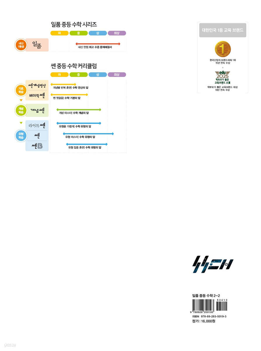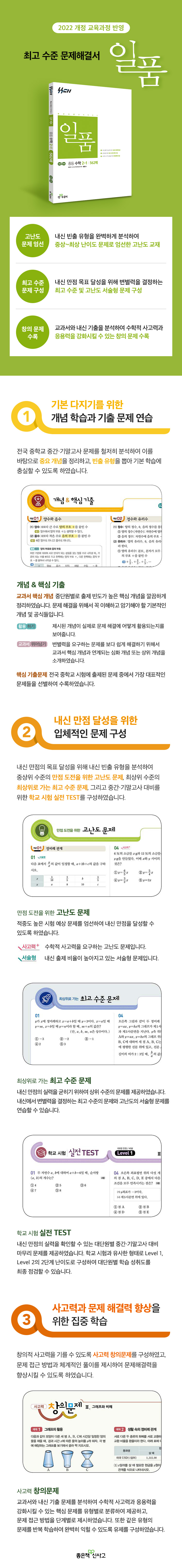 2. 내신 빈출 유형을 완벽하게 분석하여 중상~최상 난이도 문제까지 구성한 고난도 교재 3. 창의적 사고력과 문제 해결력 향상을 위한 집중 학습 최고 수준 수학 학습을 위한 천하일품 문제집 ‘일품 수학’ 까다로운 내신 문제를 완벽히 대비하는 내신 만점 대비서 ‘일품 수학’ 『일품 수학』은 중상위권 학생들에게 적합하도록 수준 높은 문제들로 구성하였습니다. 내신 출제 가능성이 높은 "개념&핵심 기출", "만점 도전을 위한 고난도 문제", "최상위로 가는 최고 수준 문제"와 중간, 기말고사의 실전 연습을 할 수 있는 "학교 시험 실전 TEST", 창의적 사고력을 기를 수 있는 "사고력 창의문제"를 통해 내신 만점을 달성할 수 있습니다. 『일품 수학』은 수학에서 최고 실력을 꿈꾸는 학생이라면 꼭 봐야 하는 필수 교재입니다. |
