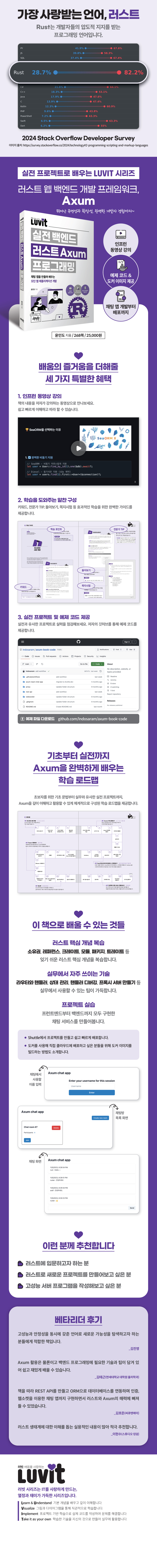 뛰어난 유연성과 확장성, 완벽한 개발자 경험까지 웹 백엔드 개발 프레임워크 Axum은 전 세계 개발자들의 주목을 받고 있습니다. 최소한의 코드만으로 원하는 기능을 구현할 수 있도록 설계된 Axum은 웹소켓, SSE, HTTP/2와 같은 최신 프로토콜을 모두 지원합니다. 고성능 서버를 간단하게 구축하고 싶다면 사용성과 성능을 모두 갖춘 Axum이 답입니다. 빠르게 변화하는 개발 트렌드와 러스트 생태계에 남들보다 먼저 앞서 나가보세요.이 책만의 특별한 점이 책은 가장 빠르게 성장하고 있는 러스트 프레임워크 Axum을 이해하기 쉽게 설명하는 최고의 가이드입니다. 러스트 입문자부터 고성능 서버 프로그램을 작성해보고 싶은 실무자까지 다양한 독자층을 고려하여 구성했습니다.1. 입문자를 위한 러스트 핵심 개념 복습이 책을 이해하기 위해 필요한 러스트 핵심 개념을 단계적으로 정리합니다. 풍부한 예제 코드와 쉬운 설명으로 처음 배우는 분들도 막힘없이 따라 할 수 있습니다.2. 실무 중심의 프로젝트 예제이론 학습만으로 실무에 적용하는 기술을 배우기는 어렵습니다. 이 책은 실무 감각을 익힐 수 있도록 프런트엔드와 백엔드를 모두 구현한 채팅 서비스를 만들어봅니다. 코드를 완성한 후에는 Shuttle, 도커를 이용해 웹에 배포하는 과정도 배웁니다.3. 저자의 인프런 동영상 강의책만으로 부족하다고 느낄 초보자들을 위해 저자는 인프런 동영상 강의를 제작했습니다. 책의 흐름에 맞춰 진행되는 강의는 핵심 이론과 실습 프로젝트를 알기 쉽게 설명하며, 실전에서 유용한 팁까지 담았습니다. 이 책은 누가 읽으면 좋을까요?- 러스트에 입문하고자 하는 타 언어 개발자- 새로운 프로젝트를 만들어보고 싶은 러스트 개발자- 고성능 서버 프로그램을 작성해보고 싶은 실무자먼저 읽은 독자들의 한줄평- 이미 다른 언어로 웹 개발 경험이 있으면서 고성능과 안정성을 동시에 갖춘 언어로 새로운 가능성을 탐색하고자 하는 분들에게 추천합니다. _김진영 님- 러스트는 인지도 있는 언어가 되었지만 아직 라이브러리를 활용한 학습 자료가 부족하여 초심자들에게 새로운 것을 만들며 배울 기회가 적었습니다. 이 책은 그런 면에서 가뭄에 단비 같은 존재입니다. _김태근 님- 책을 따라 REST API를 만들고 ORM으로 데이터베이스를 연동하며 인증, 웹소켓을 이용한 채팅 앱까지 구현하면서 러스트와 Axum의 매력에 빠져들 수 있었습니다. _김호준 님- 러스트 생태계에 대한 이해를 돕는 실용적인 내용이 많아 적극 추천합니다. _이현수 님