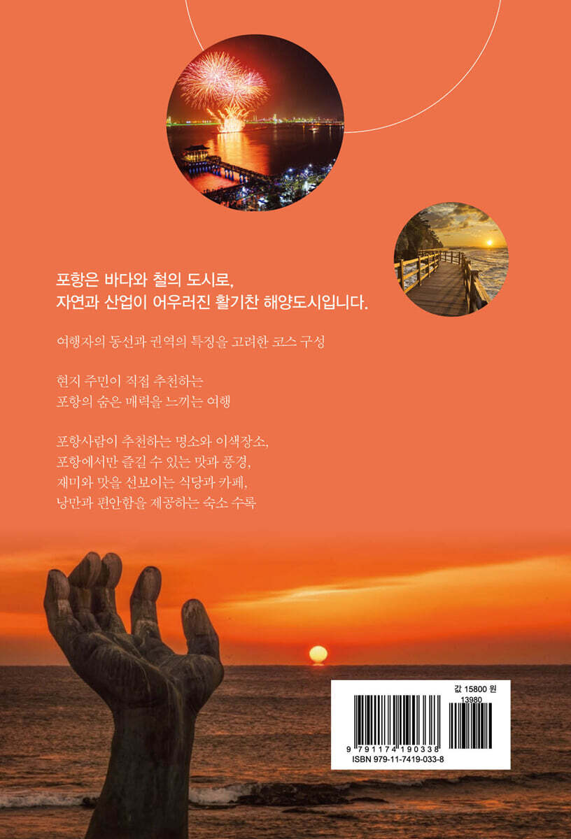호미곶 한민족 해맞이 축전, 포항 국제불빛 축제, 포항스틸아트페스티벌, 매년, 포항 해병대 문화축제 등 크고 작은 포항의 축제와 포항 12경, 포항 10미를 소개한다. 한반도에서 가장 먼저 해가 뜨는 곳, 포항 호미곶. 이곳은 매년 새해를 맞이하는 상징적인 장소로 자리 잡았으며, ‘호미곶 한민족 해맞이 축전’은 전국에서 가장 주목받는 해맞이 행사 중 하나로 손꼽힌다. 1999년을 시작으로 매년 12월 31일부터 1월 1일까지 이틀간 열리는 이 축전은, 단순히 해를 맞이하는 것을 넘어 한민족의 화합과 새로운 시작을 기원하는 의미 깊은 시간을 선사한다. --- p.32 포항을 대표하는 이색 명소 스페이스워크(Space Walk)는 단순한 조형물이 아닌, 직접 걸으며 체험할 수 있는 세계 최초의 걷는 롤러코스터형 구조물이다. 철강 도시 포항의 상징인 철로 만들어진 이 대형설치미술은 예술과 산업, 그리고 자연 풍경이 어우러진 독창적인 공간으로, 도시 전체의 새로운 랜드마크로 자리매김했다. 스페이스워크는 환호공원 정상부에 자리하고 있으며, 총 길이 약333m, 최고 높이 25m에 이른다. 마치 공중에 떠 있는 롤러코스터 트랙처럼 구불구불 이어진 구조는 보기만 해도 압도적인데, 실제로 그 위를 걸을 수 있다는 점에서 더욱 특별하다. 루프 구간과 급경사 구간은 안전상의 이유로 진입이 제한되어 있지만, 걸을 수 있는 구간만으로도 시야가 탁 트이는 멋진 체험이 가능하다. --- p.67 포항에 가면 꼭 들러봐야 할 맛집이 있다. 영일대해수욕장 근처에 위치한 마라도횟집은 30년 넘는 전통을 자랑하며, 현지인뿐 아니라 관광객들에게도 꾸준히 사랑받고 있는 곳이다. 이곳의 대표 메뉴는 단연 ‘달인물회’다. SBS 〈생활의 달인〉에도 소개된 이 메뉴는 신선한 해산물은 물론 전복, 해삼 등 고급 재료가 아낌없이 들어가 깊고 풍부한 맛을 자랑한다. 얼음을 동동 띄운 고추장 양념 육수는 시원하면서도 감칠맛이 뛰어나, 한입 먹는 순간 여름 더위가 싹 가시는 기분이다. 단순한 물회가 아닌, 제대로 만든 한 끼로 기억에 남는 특별한 맛이다. --- p.91 포항의 푸른 바다와 따스한 햇살을 배경으로 펼쳐졌던 인기 드라마 〈동백꽃 필 무렵〉은 2019년 방영 당시 큰 사랑을 받았고, 지금도 많은 사람들의 기억 속에 따뜻한 울림으로 남아 있다. 드라마 속 감성 가득한 장면들이 촬영된 장소들은 시간이 지나도 여전히 여행자들의 발걸음을 사로잡으며, 포항을 대표하는 명소로 자리 잡았다. 그 중심에는 포항시 남구에 위치한 구룡포가 있다. 극 중‘ 옹산’이라는 이름으로 등장한 이곳은 구룡포 근대문화역사거리와 구룡포항일대를 무대로, 드라마 속 따뜻하고 정겨운 분위기를 고스란히 담아냈다. 좁고 오래된 골목에는 세월의 흔적이 묻어난 건물들이 늘어서 있고, 바다를 따라 이어지는 풍경은 드라마의 정서를 그대로 간직하고 있다. --- p.133 영일대해변의 북쪽 끝, 수평선 너머로 동해가 끝없이 펼쳐지는 그곳에 라한 호텔 포항이 우아하게 서 있다. 도심의 소란을 잠시 내려두고 푸른 바다의 품에 안기고 싶을 때, 이곳은 그 어떤 곳보다 완벽한 안식처가 되어준다. 전 객실이 오션뷰로 구성되어 있어, 아침이면 물안개를 헤치며 떠오르는 일출을 맞이할 수 있고, 해 질 무렵이면 수면 위로 번지는 노을빛이 하루를 따뜻하게 감싼다. --- p.216 과메기란? 과메기는 원래 꽁치를 겨울철 찬 바람에 반쯤 마르게 말린 발효식품이었다. 최근에는 꽁치 대신 청어나 고등어를 사용해 더 고소하고 부드러운 맛을 내며, 내장을 제거하고 손질한 생선을 하루 이틀 얼렸다 녹이며 바람에 말리는 방식으로 만든다. 구룡포의 해풍은 이 숙성과정을 천천히 진행시켜 과메기 특유의 짭짤하면서도 진한 감칠맛을 살려준다. 구룡포 과메기의 매력 풍부한 오메가-3 지방산과 단백질로 건강식으로도 주목받는 겨울 보양식. 바삭하게 구운 김, 초장, 마늘, 고추, 배추, 미역 등과 함께 싸 먹는 조합은 남녀노소 모두를 매료시킨다. 씹을수록 고소한 맛과 촉촉한 식감이 잘 어우러져, 술안주는 물론 밥반찬으로도 손색이 없다. 과메기를 제대로 즐기려면? 겨울철(11월~2월) 구룡포 일대에는 과메기 판매점들이 줄지어 있고, 포장 판매는 물론 시식도 가능하다. 구룡포 과메기문화관에서는 과메기의 역사와 제조과정을 직접 보고 체험할 수 있어 관광객들에게 인기다. --- p.233 |