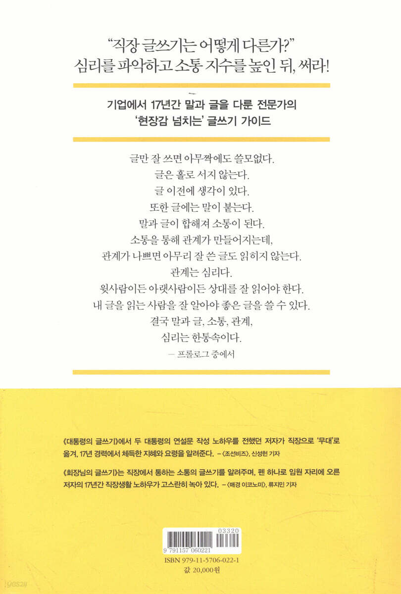 글만 잘 쓰면 아무짝에도 쓸모없다. 글은 홀로 서지 않는다. 글 이전에 생각이 있다. 또한 글에는 말이 붙는다. 말과 글이 합해져 소통이 된다. 소통을 통해 관계가 만들어지는 데, 관계가 나쁘면 아무리 잘 쓴 글도 읽히지 않는다. 관계는 심리다. 윗사람이든 아랫사람이든 상대를 잘 읽어야 한다. 내 글을 읽는 사람 을 잘 알아야 좋은 글을 쓸 수 있다. 결국 말과 글, 소통, 관계, 심리는 한통속이다. - 프롤로그