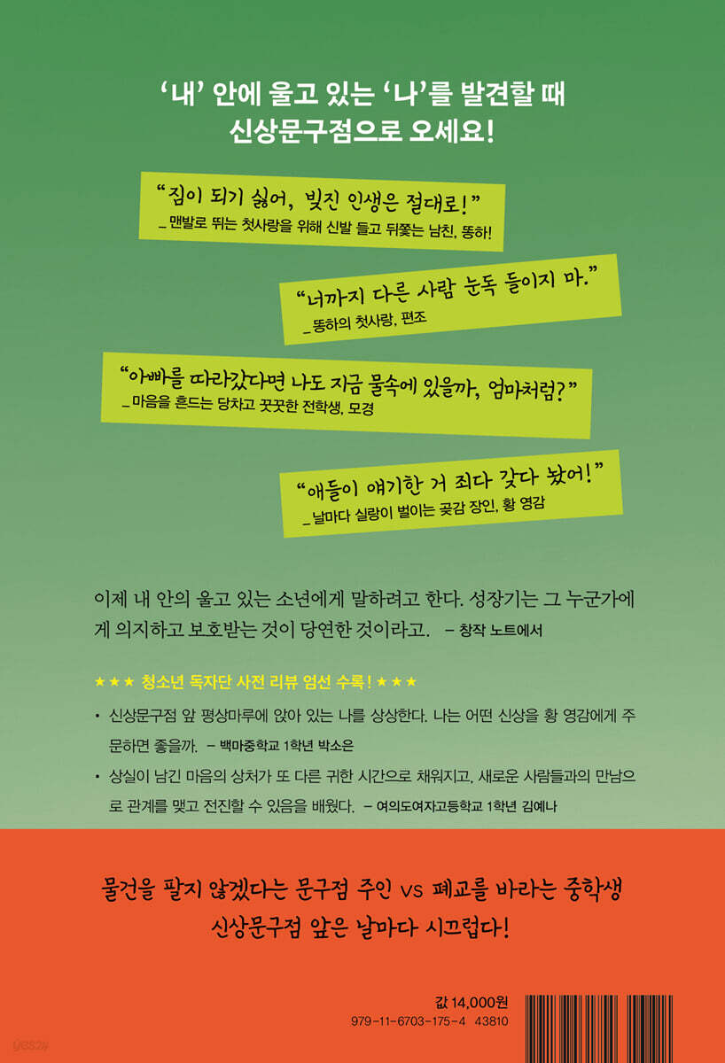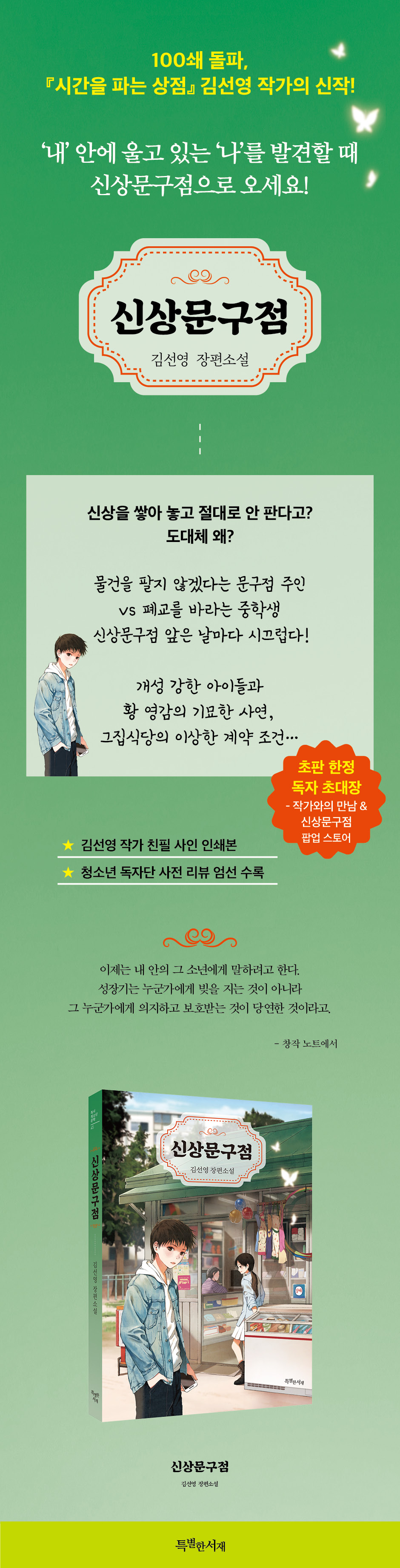 ‘내’ 안의 또 다른 나를 불러내 위로하는 시간 발톱이 깨지고 발바닥이 찢어져서 피가 흘러도 맨발로 뛰는 편조. 편조의 신발을 들고 뒤쫓는 남친 동하. 동하의 마음을 흔드는 당차고 꿋꿋한 전학생 모경이 나타났다. 주인공 동하는 한 인생이 한 인생에게 빚지고 살아야 하는 게 늘 괴롭다. 할머니에게 기생하는 인생 같아서 자신이 싫어질 때면 흰뫼 정상까지 단숨에 뛰어오른다. 하지만 동하의 마음을 가장 깊이 흔드는 건 편조다. 편조를 보면 심장이 일렁인다. 예민하고 섬세한 편조는 백석리를 떠나 그토록 원하던 집으로 돌아갔지만 연극 무대 같은 집이 불편하기만 하고, 그 마음을 표현할 곳은 스프링 노트뿐이다. 하지만 노트를 찢어 공유할 수 있는 동하가 곁에 있어 든든하다. 모경의 등장으로 동하의 마음이 흔들릴까 봐 단속하는 편조는 엄마를 독차지하기 위해 여행을 떠난다. 소문을 몰고 전학 온 모경은 꿋꿋하고 당찬 아이다. 체육복을 구하기 위해 이른 아침부터 신상문구점을 뒤지기도 하는 모경은 물속에 잠긴 엄마와 아빠를 생각할 때마다 마음이 벅차다. 하지만 모경에게 이제 든든한 친구들이 있다. 아무도 당할 수 없는 개성 강한 주인공들은 누군가의 부재를 각기 다른 방식으로 해석하며 나아간다. 청소년기에 맞닥뜨린 아픔을 위로하는 그들만의 방식은 독자를 함께 회복시킨다. 영원히 자랄 것 같지 않은 또 하나의 ‘나’를 불러내 위로하는 것이다. 마을의 두 중심부, 그곳에 숨은 진실이 있다 비밀을 추척하는 재미, 놀라운 반전! “물건도 안 팔 거면서 문구점은 왜 여신 거예요?” 신상을 쌓아 두고 절대 팔지 않는 황 영감의 기묘한 사연은 이야기가 전개될수록 궁금증을 더해 간다. 황 영감은 조금씩 마음을 열며, 외지 사람들과 마을을 잇는 ‘그집식당’의 팥 수매를 위해 발 벗고 나서고, 그집식당을 운영하는 택이 아저씨는 황 영감의 숨겨진 진실을 듣게 된다. 그집식당은 외지 사람들의 발길이 끊이지 않는 마을의 또 다른 중심부이다. 사람들의 허기를 채우고 마음까지 배부르게 하는 그집식당에도 비밀 가득한 나름의 운영 방침이 있다. 택이 아저씨는 가게 운영에 엄격한 계약이 있다고 하는데……. 마을의 두 중심부인 신상문구점과 그집식당의 비밀을 추적하는 재미와 놀라운 반전은 마음을 졸이던 독자의 마음을 시원하게 한다. 닫혔던 신상문구점이 다시 살아난 것은 단순한 회복이 아니라, 아이들과 마을이 다시 이어지는 상징이다. 신상문구점은 아이들의 아지트였기 때문에 잃었던 일상을 되찾는 출발점이 된다. 그집식당은 따뜻한 먹거리로 위로를 전하며, 상실 속에서도 계속 이어지는 공동체의 힘을 보여 준다. ★★★ 청소년 독자단 사전 리뷰 엄선 수록 ★★★ 사전에 『신상문구점』을 읽은 청소년 독자단은 작품의 핵심을 이해했다. 신상문구점과 그집식당의 사연에 깊이 공감하며 주인공을 통하여 인생의 계단을 두려움 없이 걸어가고 싶다고 밝힌 청소년은 작품을 읽는 내내 울컥했다고 소회를 밝혔다. ‘상실’이 마냥 슬픈 것만은 아니며 새로운 만남과 길로 전진할 수 있음을 배웠다고도 했다. 길 위에서 흔들리는 이들에게 이 소설은 조용히 그러나 분명하게 가야 할 길을 비춰 준다고 전했다. 베스트셀러 작가의 섬세한 표현과 빼어난 문장, 깊이 있는 이야기가 청소년 독자단을 통해 검증되었다. 책 말미에 청소년 사전 리뷰를 엄선, 수록하여 청소년 독자와 소통할 수 있도록 했다. |