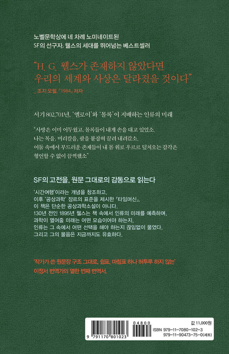 ‘공상과학’ 장르의 표준을 제시한 『타임머신』 19세기 영국 산업사회의 계급 불평등과 인류의 운명을 예리하게 성찰한 H. G. 웰스의 『타임머신』. 이 소설은 단순한 공상과학 소설이 아니다. 130년 전인 1895년 웰스는 인류의 미래를 예측하며, 과학이 열어줄 미래는 어떤 모습이어야 하는지, 인류는 그 속에서 어떤 선택을 해야 하는지 책 속에서 끊임없이 물었다. 그리고 그의 물음은 지금도 유효하다. 초판 출간 이후, 이 작품은 ‘시간 여행’의 개념을 본격적으로 대중문화에 도입한 기념비적 소설로 평가받아 왔다. 영화와 드라마, 만화, 게임 등 다양한 매체에서 꾸준히 각색되어 오늘날까지도 새로운 상상력을 자극하고 있다. 일찍이 『1984』의 저자 조지 오웰은 “H. G. 웰스가 존재하지 않았다면 우리의 세계와 사상은 달라졌을 것”이라며 그의 역량을 높이 평가했다. 오웰의 작품 세계를 보건대, 아마도 웰스의 사회구조를 꿰뚫어보는 통찰력과 지식인으로서 비판적인 시각을 높이 샀을 것이라고 추측된다. 『타임머신』에는 웰스의 이러한 시각이 잘 드러나 있다. 아마도 어린시절 부모의 이혼으로 열세 살부터 포목상 도제, 초등학교 교생, 약제사 조수, 백화점 견습사원 등 온갖 궂은 일을 하며 생계를 해결한 그의 이력이 그의 세상 보는 눈을 넓혔을 수도 있다. 런던대학 졸업 뒤에 생물학 강사 생활을 하던 그는 전업작가로 나선 뒤, 『타임머신』에서 SF의 환상성, 기괴함, 섬뜩함을 탁월하게 보여주었다. 그럼에도 이야기 전개가 허황되게만 느껴지지 않는 것은 그의 탄탄한 과학적 상식이 뒷받침하기 때문이다. 그가 드넓은 미래의 우주로 타임머신을 타고 날아갈 수 있었던 배경에는 대학에서 전공한 생물학, 동물학을 기반으로 한 탄탄한 과학적 상식이 바탕이 되었다. 그의 소설이 고급스러운 과학소설로 읽히는 이유이다. SF의 고전을, 원문 그대로의 감동으로 읽는다 『타임머신』의 번역은 3년여의 작업 끝에 완성되었다. 이정서 번역가는 원문의 서술구조를 해치지 않고 충실히 직역하며, 원작의 생생한 리듬을 그대로 전하는 데 중점을 두었다. 그는 『타임머신』을 옮기며 왜 웰스가 SF의 선구자로 불리는지, 왜 그가 조지 오웰 등 후대 작가들에게 사상적 영향을 미쳤는지를 새삼 느꼈다고 한다. AI가 언어의 장벽을 허물고, 전기차와 무인 자동차가 거리를 달리며, 민간 우주선이 화성에 도달하는 시대에도 웰스의 『타임머신』은 여전히 낯설지 않은 질문을 던진다. “과학이 열어 줄 미래는 어떤 모습이어야 하는가? 그리고 그 속에서 인간은 어떤 선택을 해야 하는가?” 『타임머신』은 19세기의 상상력으로 21세기를 꿰뚫으며, 우리들에게 다시금 인간과 문명의 본질을 묻는다. |