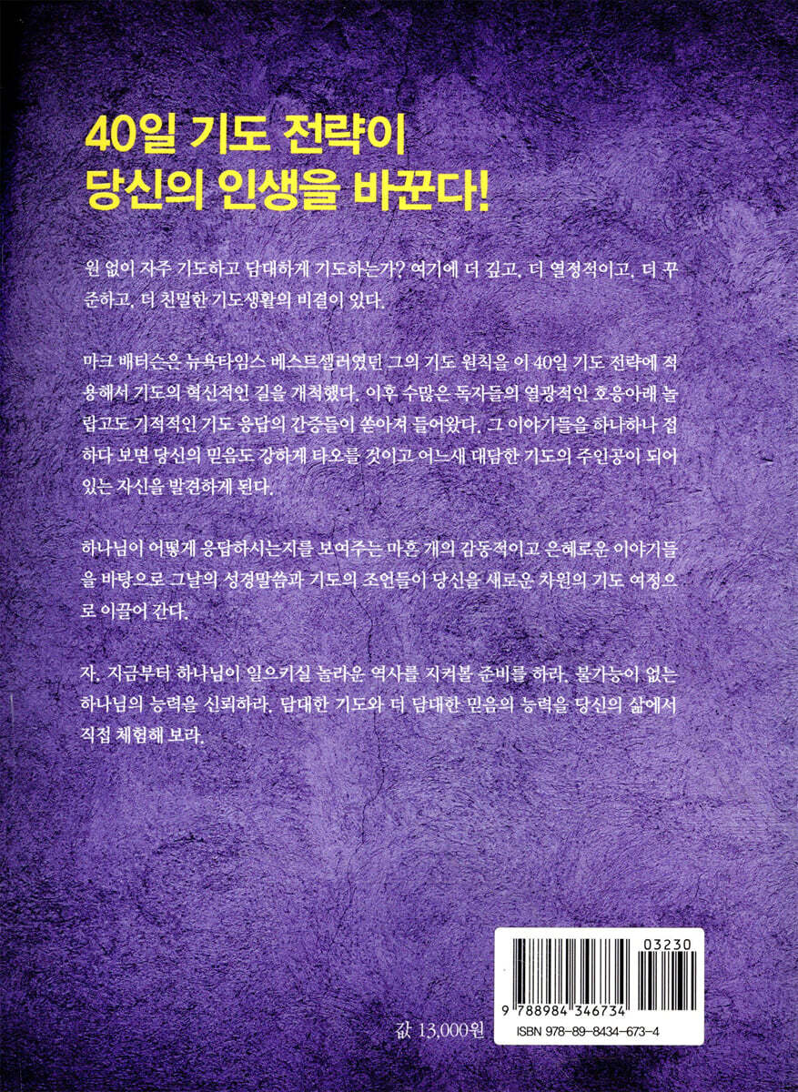 베스트셀러 작가 마크 배터슨(Mark Batterson)이 제시하는 더 깊고, 더 꾸준하고, 더 친밀한 기도 생활의 비결 ? 뉴욕타임스, 아마존 베스트셀러 작가인 마크 배터슨의 기도 원칙을 40일 기도 전략에 적용 ? 하나님이 어떻게 응답하시는지를 보여주는 마흔 개의 감동적이고 은혜로운 이야기 ▶ 더 깊고 꾸준하고 친밀한 기도 생활을 위한 기도 지침서! 원 없이 자주 기도하고 담대하게 기도하는가? 여기에 더 깊고, 더 열정적이고, 더 꾸준하고, 더 친밀한 기도생활의 비결이 있다. 마크 배터슨은 뉴욕타임스 베스트셀러였던 그의 기도 원칙을 이 40일 기도 전략에 적용해서 기도의 혁신적인 길을 개척했다. 이후 수많은 독자들의 열광적인 호응아래 놀랍고도 기적적인 기도응답의 간증들이 쏟아져 들어왔다. 그 이야기들을 하나하나 접하다보면 당신의 믿음도 강하게 타오를 것이고 어느 새 대담한 기도의 주인공이 되어있는 자신을 발견하게 된다. 하나님이 어떻게 응답하시는지를 보여주는 마흔 개의 감동적이고 은혜로운 이야기들을 바탕으로 그 날의 성경 말씀과 기도의 조언들이 새로운 차원의 기도 여정으로 안내한다. 하나님이 일으키실 놀라운 역사를 지켜볼 준비를 하라. 불가능이 없는 하나님의 능력을 신뢰하라. 담대한 기도와 더 담대한 믿음의 능력을 당신의 삶에서 직접 체험해 보라. ▶ 배터슨의 영적 기도의 방법과 마흔 가지 기도의 전략 제시 40일 기도 자체에 마법의 힘이 숨어 있는 건 아니다. 하지만 저자는 40일 기도가 매우 성경적인 전략이라는 이야기 한다. 예수님이 광야에서 금식하며 기도하신 기간이 정확히 40일이었다. 또한 그 기간은 예수님 생애의 중요한 한 장이기도 했다. 육신적 아버지의 일을 하다가 하늘 아버지의 일로 옮겨가는 일대 전환점이 되는 시간이었다. 예수님은 광야에서 사상 유례가 없는 시험을 받으셨다. 이 경험은 그 후 원수들을 이기고 제압하는 그분의 위대한 승리의 무대가 되어 주었다. 죄와 사탄에 대한 승리는 갈보리 십자가 위에서 거두셨지만 그 열쇠가 되는 전투는 이미 3년 전 광야에서 치르셨다고 말할 수 있다. 광야 시험을 마치고 갈릴리로 돌아오신 예수님은 이전과 다른 분이 되어 있었다. 저자는 우리도 마찬가지일 것이라고 주장한다. 이 40일간의 기도를 마치고 나면 예수님처럼 성령의 능력 안에서 전혀 새로운 사람이 될 것이라고 장담한다. 저자는 또한 하나님이 우리에게 뭔가 새로운 일을 하시길 원한다면 우리도 예전의 일만을 되풀이해서는 안 되고 그와는 다른 일을 해야 한다고 말한다. 그렇게 할 때 하나님이 우리 안에서 새로운 가능성을 만들어내실 것이고 새로운 은사와 사람들을 보내주실 것이라고 한다. 하지만 그러기 위해서는 먼저 기도의 대가를 치러야 한다고 주장하며 마흔 가지 기도의 전략을 제시한다. 저자 마크 배터슨은 워싱턴 DC에 교회를 개척하기로 마음을 먹고 마음이 막막하였다. 그러던 중 〈The book of Legends〉(《전해져 내려오는 이야기》 : 신구약 중간시대, 선지자들이 끊기고 예수가 오기 전의 기간들에 대한 기록이 담긴 책)라는 책을 읽던 중 한 이야기를 접하게 된다. 오랜 가뭄으로 이스라엘 백성들은 고통에 처하게 되었다. 그때 ‘호니’라는 사람이 기도를 하기 시작한다. 그는 예전부터 비를 오게 하는 기도로 유명한 사람이었다. 그는 지팡이로 땅에 원을 그리고, 그 안에 들어가서 하나님이 비를 내려주시기 전까지는 나오지 않겠다는 결단의 기도를 한다. 첫 번째 원을 그리고 기도를 시작하자 보슬비가 오기 시작했다. 그는 거기서 만족하지 않고, 두 번째 원을 그리고 더욱 큰 비가 내리기를 기도한다. 그러자 소낙비가 이스라엘 백성들에게 풍성하게 내렸다. 그런데 호니는 기도를 멈추지 않고, 세 번째 원을 그리고 다시 기도하기 시작한다. 이번에는 사람들의 심령에 은혜와 사랑의 비를 내려달라고 기도한다. 그러자 치유의 비, 은혜의 영적인 비가 이스라엘 백성들에게 가득 내렸다는 이야기이다. 배터슨은 이 이야기를 기억하고 호니처럼 기도하기로 결정한다. 본인이 개척하고 싶은 곳 주위를 커다란 원을 그리며 기도한다. 마치 여리고 성을 돌듯이 말이다. 하나님께서 그의 기도에 응답하시고, 바로 그 지역을 그에게 주셨다. 그리고 워싱턴 DC에 7개의 지교회를 세우는 큰 교회로 성장시켜 주셨다. 저자는 하나님이 어떻게 응답하시는지를 보여주는 마흔 개의 감동적이고 은혜로운 이야기들을 바탕으로 그날의 성경말씀과 기도의 조언들을 제시하여 우리를 새로운 차원의 기도 여정으로 이끌어 간다. |