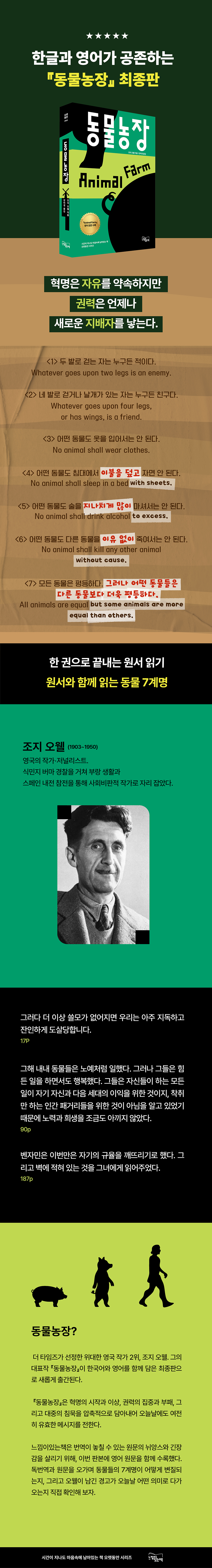 --- p.18 이제 우리가 무엇을 해야 하겠습니까? 그것은 모두 일어나 우리의 온 힘을 다하여 인간을 몰아내는 것입니다. 동무들, 내가 여러분에게 전하는 말은 바로 이것입니다. 여러분, 반란을 일으킵시다! --- p.21 우리가 인간과 싸우면서 인간을 닮아서는 안 된다는 것도 명심하십시오. 여러분이 인간을 정복한 뒤에도 그들의 나쁜 짓을 배워서는 안 됩니다. --- p.24 동물들은 언덕 꼭대기에 올라가 눈부시게 맑은 아침 햇살 속에서 사방을 둘러보았다. 그랬다. 그것은 모두 그들의 것이었다. 사방에 보이는 모든 것이 그들의 것이었다. --- p.38 이 농장의 경영과 조직이 모두 우리에게 달려 있습니다. 밤낮으로 우리는 여러분의 안녕과 복지를 살피기 위해 고심하고 있습니다. 그렇습니다. 결국 우리가 우유를 마시고 그 사과를 먹는 것은 바로 여러분들을 위한 것입니다. --- p.56 그들은 나폴레옹 곁에 계속 붙어 서서 그를 호위했다. 예전에 농장의 개들이 존스 씨에게 했던 모습 그대로 개들은 나폴레옹을 향해 꼬리를 치는 것이었다. --- p.83 그런 것들이 기록으로 남아있지 않다는 것은 확실했다. 그러므로 동물들은 자신들이 잘못 알았을지 모른다는 사실에 만족했다. --- p.97 동무들, 우리가 요즘 하고 있는 두뇌 노동에 견주어 보면 그것은 결코 분에 넘치는 안락은 아닙니다. 여러분은 설마 우리에게서 휴식을 빼앗으려는 생각은 아니겠지요? --- p.102 그녀가 나름대로 그린 미래의 꿈은, 모든 동물이 배고픔과 채찍으로부터 해방되어 모두가 평등하고 각자 자기 능력에 따라 일하고, 마치 메이저 영감의 연설이 있던 날 밤 자신의 앞다리로 오리새끼들을 감싸 준 것과 같이, 강한 자가 약한 자를 보호해 주는 그러한 동물들의 사회였던 것이다. --- p.125 이 농장에서 태어난 많은 동물에게 ‘봉기’란 그저 입에서 입으로 전해져 오는 전설에 불과했으며, 다른 곳에서 사들여 온 동물들은 이곳에 오기 전에는 그런 이야기를 들어본 적도 없다고 말했다. --- p.178 가장 진실한 행복은 열심히 일하고 검소하게 생활하는 데 있다고 그는 힘주어 말했다. --- p.179 벤자민은 이번만은 자기의 규율을 깨뜨리기로 했다. 그리고 벽에 적혀 있는 것을 그녀에게 읽어주었다. --- p.187 “여러분들이 여러분의 하층 동물들과 싸워야 할 일이 있다면 우리는 우리대로 싸워야 할 하층 계급이 있다는 말입니다!” --- p.192 창밖에서 지켜보는 동물들의 눈길은 돼지로부터 인간에게, 인간으로부터 돼지에게, 다시 돼지로부터 인간들에게 시선을 번갈아 옮기며 쳐다보았다. 그러나 이미 어떤 게 어떤 것인지, 돼지가 사람인지 사람이 돼지인지 분간할 수 없었다. --- p.196 “지난 1936년부터 공들여 써 온 이 책의 글 한 줄 한 줄은 직간접적으로 전체주의에 반대하는 내용들입니다. 동물농장은 내가 지금 무엇을 하고 있는지를 철저히 인식하는 가운데 정치와 예술적 의미를 하나로 융화시키고자 최선을 다한 최초의 책입니다.” --- p.222 |