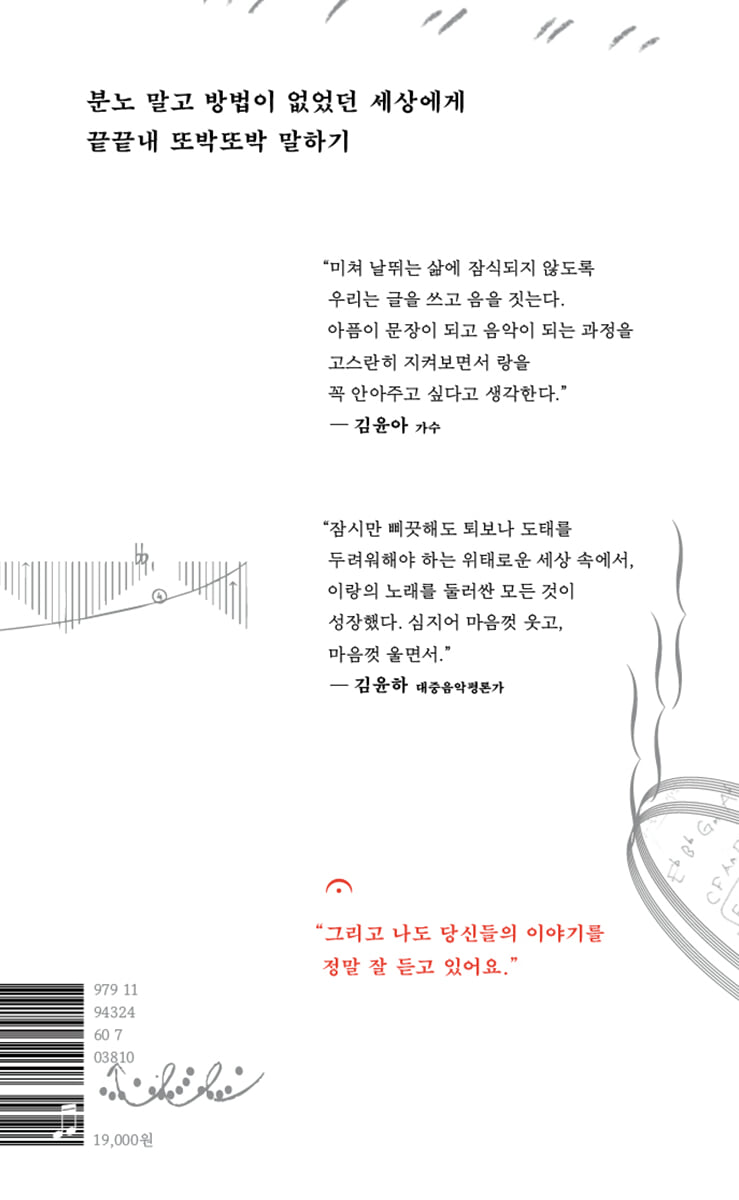 노래를 세상에 내보낸다는 건, 그 노래가 이제 더 이상 나만의 노래가 아니라는 뜻이다. 사람과 시대와 노래가 만나 일으키는 화학 작용은 때로 완전히 다른 차원으로 노래를 이끈다. 이랑의 노래는 어쩌면 그런 운명을 타고난 노래다. 노래가 만들어진 배경과 노랫말에 숨은 이야기의 나이테를 하나하나 짚으며 어떤 곡은 이래서 내가 공감했구나, 어떤 곡은 이렇게 내가 오해했구나 새삼 깨닫는 시간을 가졌다. 단 하나 변하지 않은 건, 〈잘 알지도 못하면서〉부터 〈SHAME〉까지 이랑의 노래가 쌓아온 시간 속 이랑도, 이랑의 노래도, 이랑의 노래를 밍기뉴 삼아 웃고 운 사람 모두가 하나도 빠짐없이 성장했다는 사실이다. 놀랍지 않은가? 잠시만 삐끗해도 퇴보나 도태를 두려워해야 하는 위태로운 세상 속에서, 이랑의 노래를 둘러싼 모든 것이 성장했다. 심지어 마음껏 웃고, 마음껏 울면서. 아무것도 변하지 않은 마음을 들여다보며 쓰는 게 괴로울 것이라고 했지만, 이쯤이면 이랑도 깨닫지 않았을까 싶다. 자신도 주위도 울리다 웃기고 결국 성큼 성장하고 만, 자신이 만든 결코 작지 않은 세계를. 그리고 그곳에 살고 있는 이렇게 많은 사람과 이야기를. - 김윤하 (대중음악평론가)