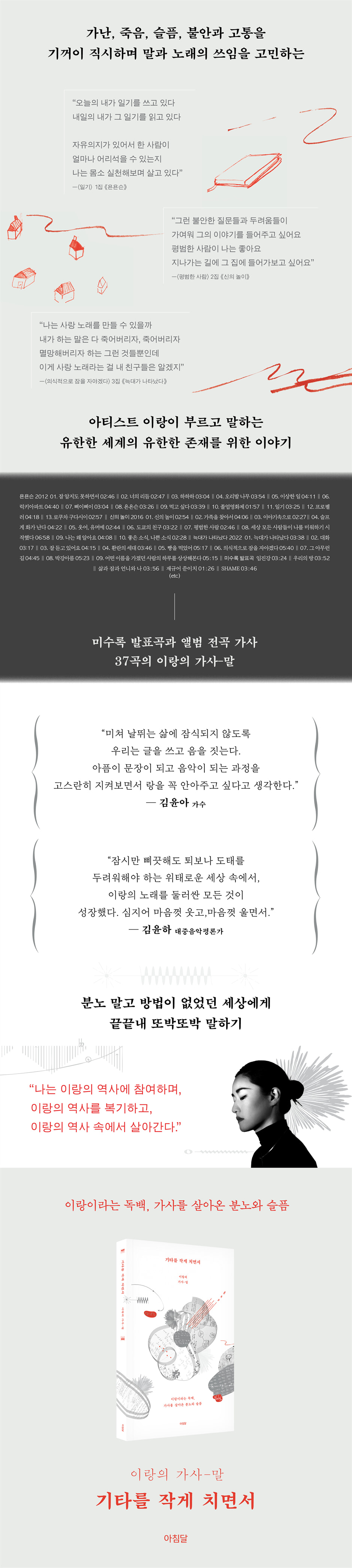 분노로 또박또박 말해온 서른일곱 곡의 노래 가사 뒤에 꾹꾹 눌러 쓴 삶의 자국들 ‘흰둥이 맥북’에 깔려 있는 기본 프로그램으로 만들고 녹음한 노래들로부터 걸어 나와 세상의 울분으로 행진하는 거리에 울려 퍼지는 노래로 이어지기까지, 아티스트 이랑의 음악적 세계는 끊임없이 움직였고, 성장했고, 사람들의 마음에게서 마음으로 번져 나가고 있다. 지금까지 발표한 세 장의 정규 앨범 《욘욘슨》(2012) 《신의 놀이》(2016) 《늑대가 나타났다》(2022)를 통해 제14회 한국대중음악상 최우수 포크노래상, 제19회 한국대중음악상 최우수 포크음반상과 올해의 음반상을 수상하며 시대의 호출을 받는 아티스트로 거듭나기도 했다. 한국에만 머무르지 않고 일본과 대만 등을 오가며 삶이 걸어온 시간과 함께 폭넓어진 음악적 스펙트럼을, 그동안 발표해온 37곡의 가사와 그에 대한 뒷면의 이야기로 담아낸 이랑의 가사-말 『기타를 작게 치면서』가 아침달에서 출간되었다. 이번 책은 그동안 발표곡의 가사를 한데 모은 작업물이자, 노래마다 얽혀 있던 삶에 대한 진술로 이루어져 있다. 흔히 비유하는 ‘노래 가사 같은’ 내러티브에서 벗어나 경험 위에 자신만의 모양으로 이야기를 짓고, 솔직한 목소리로 노래해 온 이랑은, 세상에 대해 ‘말하는’ 일을 멈추지 않아 왔다. 자신의 일기를 기초 재료로 삼고, 자신의 이야기를 가장 경청하면서도 타인을 대신 말하는 듯한 이야기가 되며 세상과도 끊임없이 연결되어왔다. 청자와 독자들은 스스로 들어가 볼 수 없었던 깊은 내면의 이야기를 이랑의 노래를 통해 알아차려 왔고, 그 공감은 마음의 투명한 연대를 만들며 아티스트도, 청/독자도 어떤 시간을 통과하고 있다. 함께한다는 감각을 지우지 않으며. 20대부터 쓰기 시작해 어느덧 수십 권이 된 손바닥만 한 몰스킨 노트는 이랑이 부딪치고 수행해온 수많은 역사가 담겨 있다. 노래 가사부터 온갖 날들의 일기, 불러볼 수 없는 이름, 생활이 묻어나 있는 메모들까지…… 이 책은 삶을 지탱해온 기록의 무더기 속에서 출발했다. 이번 책에서는 실제 노트에서 가져온 낙서나 메모를 내지에 삽입해 이랑의 근원적인 이야기라는 징표를 더했으며, 앨범의 순서를 그대로 따르는 구성을 통해 ‘듣는 노래’에서 ‘읽는 노래’로 자연스럽게 재현하였다. 이 책은 단순히 가사와 가사에 대한 창작 노트에 그치지 않는다. 불러온 노래가 삶과 얼마나 맞닿아 있었는지, 울분으로 세상에 말하는 것을 멈추지 않아 온 그의 삶이 매 순간 얼마나 절박했었는지를 잘 보여준다. 또한 멜로디 없이 오롯이 종이 위에 그동안 불러온 노래의 가사를 담으며, 우리가 가진 이야기에 집중한다. 작가의 말처럼 사람들은 이야기 중독이지만, 이야기를 궁금해하고, 이야기를 들려줄 수 있고, 이야기를 들을 수 있어 좋은 세계는 용기 내어 ‘말하는’ 사람이 있기 때문이다. 이랑은 그 용기를 쥐고 자신의 예술이 세상을 지키는 방법이 될 수 있는 일을 궁리하는 사람이기도 하다. “나를 너에게 전할 수 있을까요?” 말하기, 나타나기, 살아남기 - 이랑의 노래가 알려준 것들 그동안 발표한 37곡에 관한 모든 이야기와 함께 가사가 뒤따르는 『기타를 작게 치면서』는 대학 시절부터 자신이 가진 ‘나’라는 악기를 조율하거나 하지 않은, 어쩌면 있는 그대로의 소리로서 ‘말하기’를 선택해온 아티스트 이랑의 유구한 역사가 담겨 있다. “나는 이랑의 역사에 참여하며, 이랑의 역사를 복기하고, 이랑의 역사 속에서 살아간다”라고 이야기하듯이, 어쩌면 우리 또한 이랑의 역사 속에서 그 역사가 어떤 쓰임이 되어가는지 지켜보는 중요한 자리에 있다. 이랑의 노래에는, 상대편의 입장이나 상황을 다른 차원으로 생각해보게 하는 힘, 말하는 일로 듣는 일까지 수행하는 힘, 분노를 사랑의 쓸모로 뒤바꾸는 힘이 들어 있다. 동료 아티스트이자 자우림의 메인보컬 김윤아는 추천사 「꼭 안아주고 싶은」을 통해 “마지막 장을 넘기며 나는 이야기가 끝나버려 몹시 아쉬웠다. 다들 아는 것처럼 그런 책은 많지 않다”라고 이야기한다. “아픔이 문장이 되고 음악이 되는 과정을 고스란히 지켜보”는 다정한 시선으로 이랑이 써 내려온 ‘드라마’를 다시 바라보게 한다. 1집 활동부터 애정으로 지켜봐 온 대중음악평론가 김윤하는 『나의 라임 오렌지 나무』 속 제제에게 밍기뉴가 있었던 것처럼, 이랑의 노래를 “없었지만 마치 있었던 것 같은 그런 친구. 나라면 절대 못 했을 말을 언제 어디서나 같은 태도와 자세로 생각한 모양 그대로 세상에 내어놓는 친구”라고 소개한다. 노래와도 우정을 나눌 수 있다는 것을, 이랑의 노래를 통해 배웠다고 고백하는 진솔한 이야기가 추천사 「이랑의 노래: 울리고 웃기고 성장하는」에 담겨 있다. 배고프고, 잠을 잘 수가 없고, 사랑한다는 마음까지도 사치스러워 꾹 참으면서도, 고양이에게 주고 싶은 사랑도, 들려주고 싶은 이야기도 여전히 많이 남아 있는 사람. 노래로 엮은 모든 매듭은 그를 세상에 남아 있게 해준 끈이자 ‘생존’이라는 방식이 아니었을까. 말하는 일을 참지 않고, 세상에 꼭 필요한 목소리를 